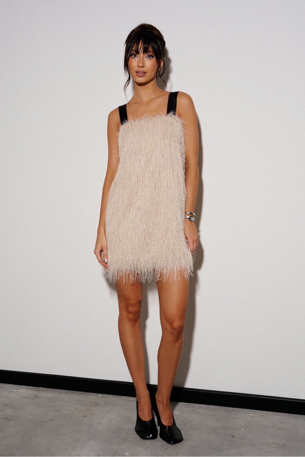 Платье-мини, крямого кроя. Выполнено из полотна с длинным ворсом, кремового цвета с мелкими блестками. Широкие бретели, есть подкладка.