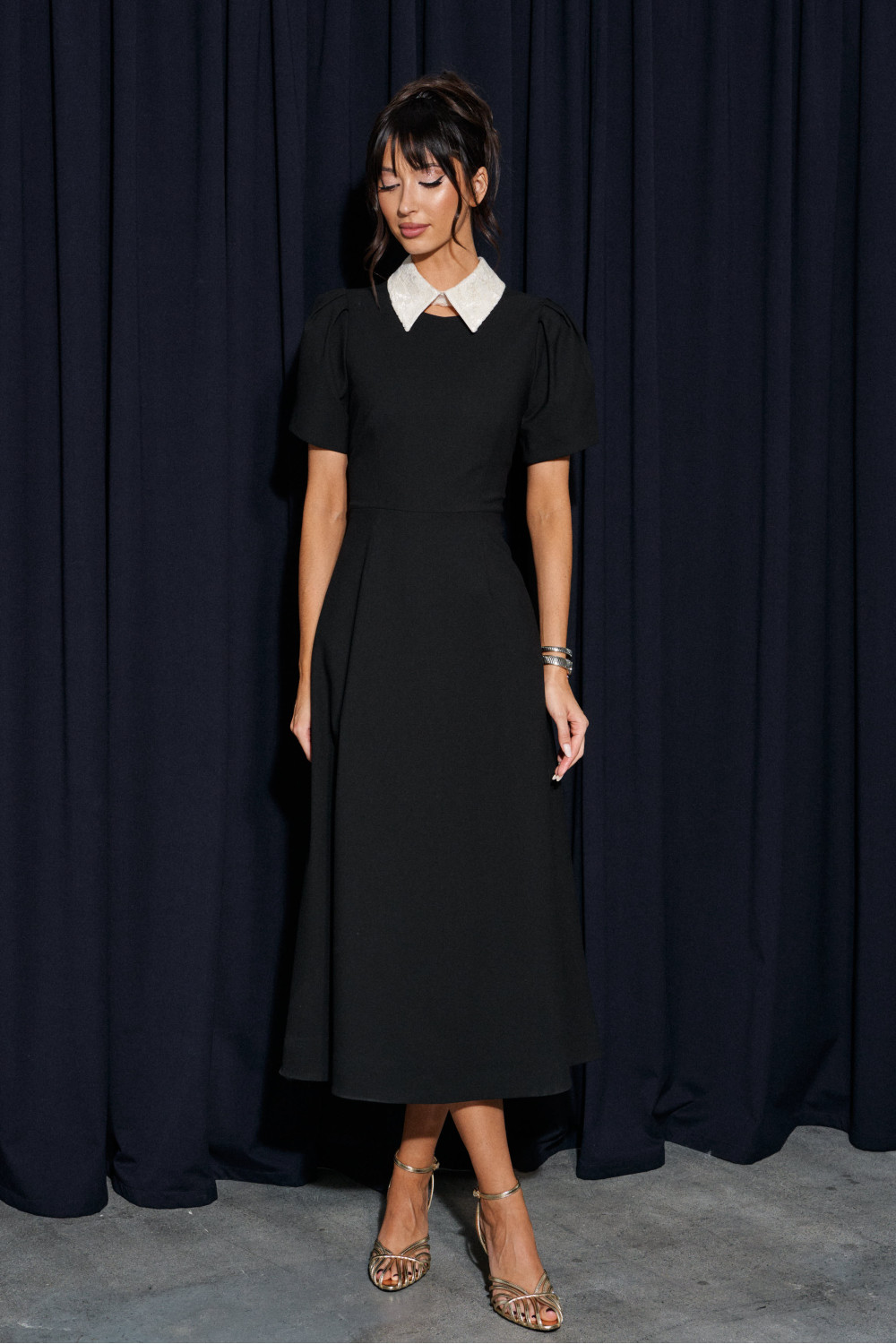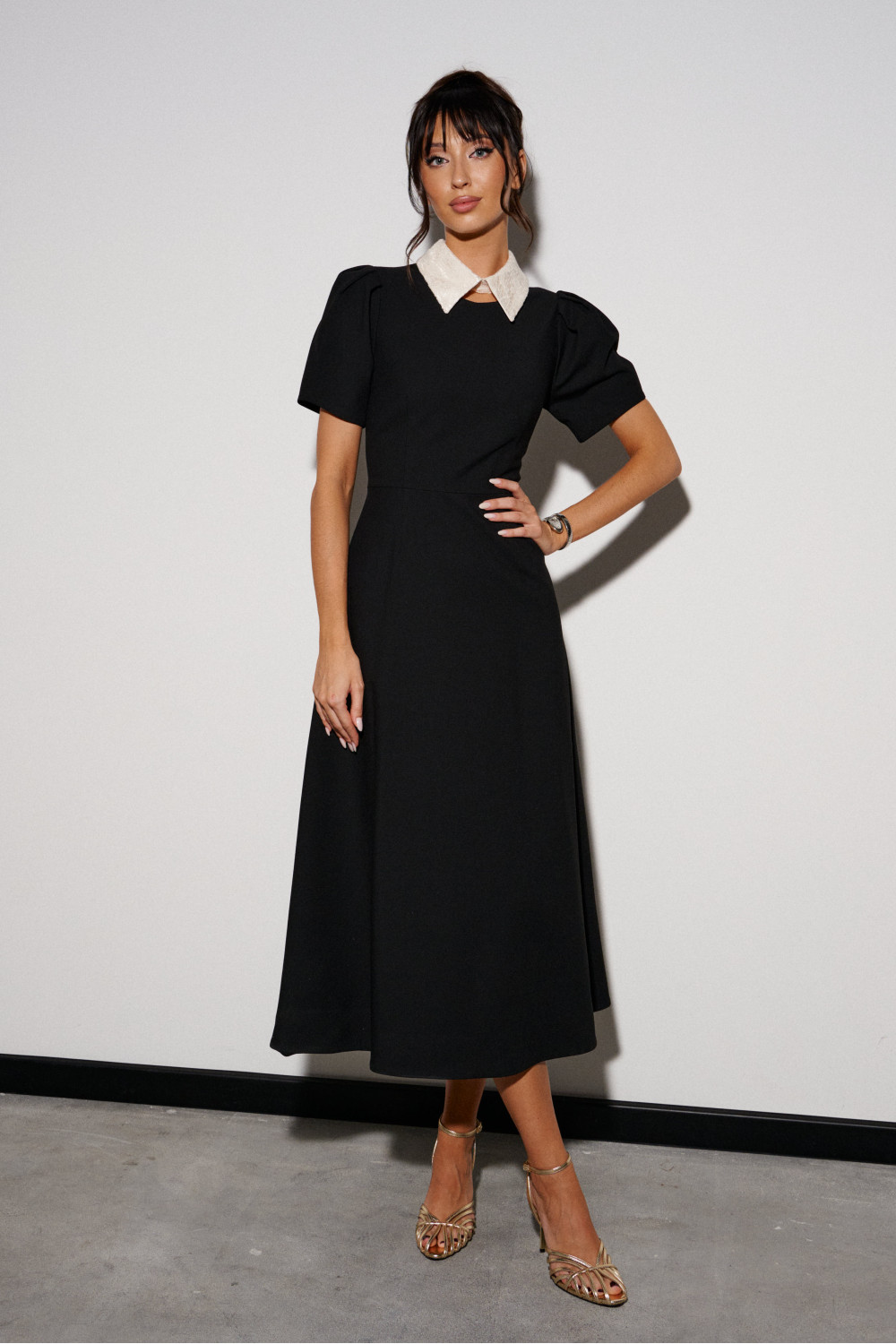 Платье-миди прилегающего силуэта со свободной юбкой. Выполнено из плательной ткани черного цвета. С подкладкой. Декорировано контрастным воротничком с кружевом (съёмный). Вырез горловины круглый. Рукав втачной, со сборкой. Застёжка - молния в среднем шве заднего полотна. По линии талии отрез.