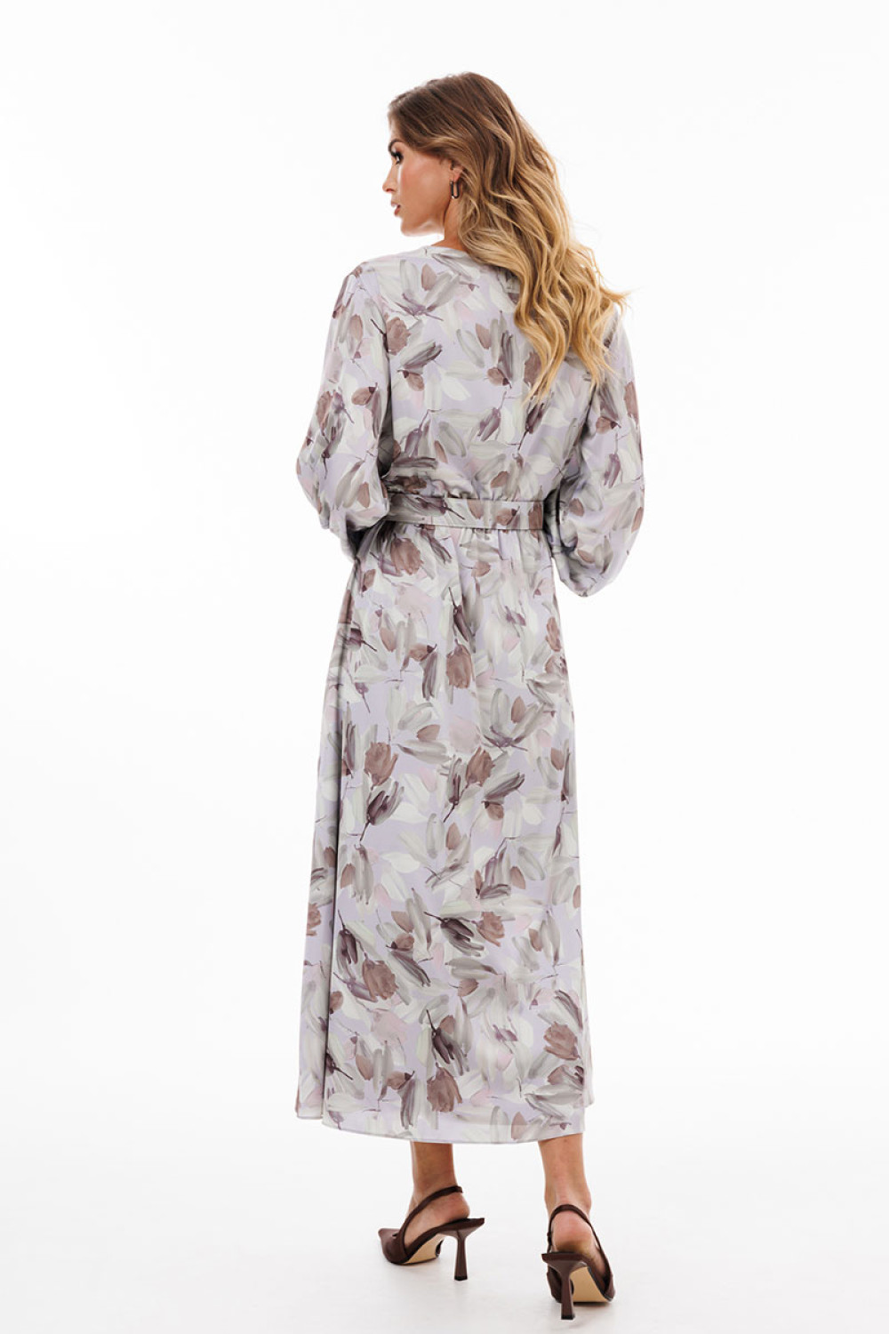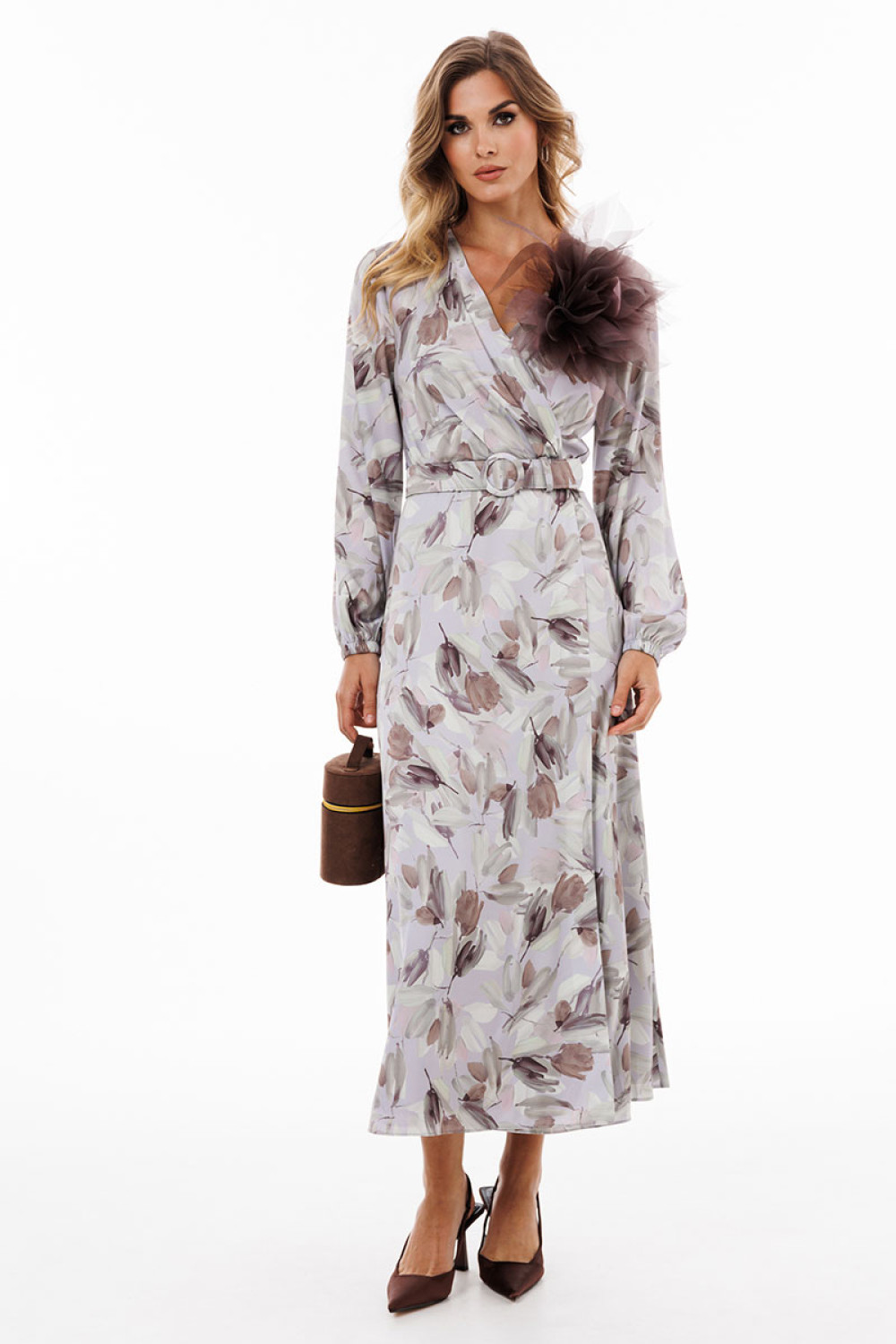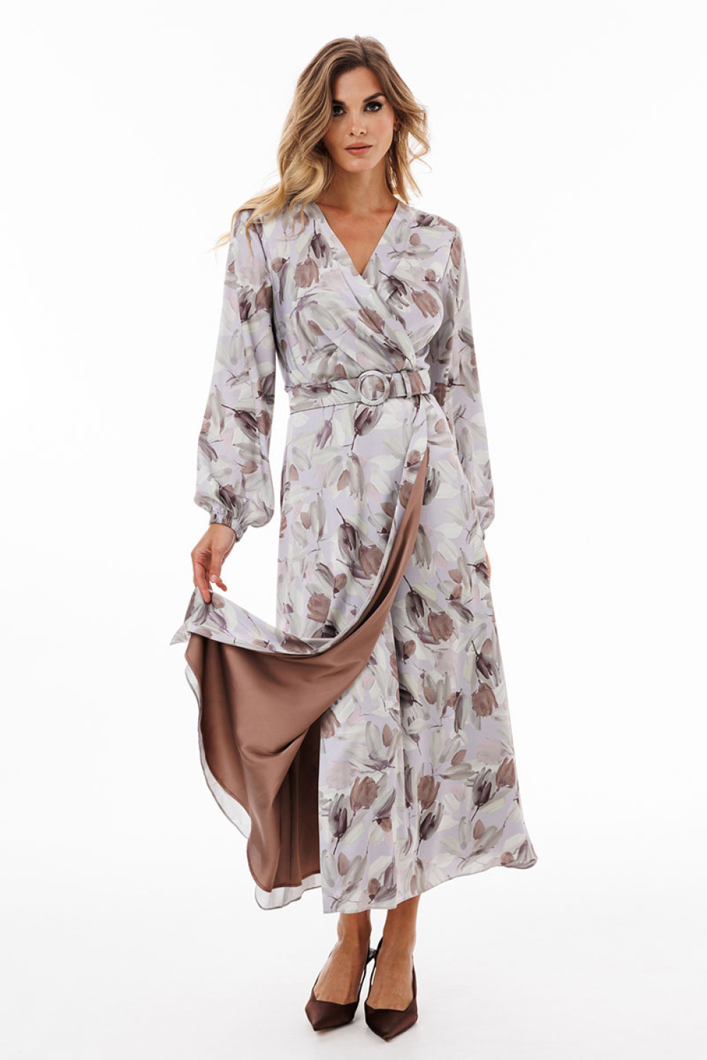 Платье выполнено из креп-атласа с принтом. Платье Х-образного силуэта, отрезное по линии талии, длиной миди. Перед выполнен "на запах" со складками по линии талии. Спинка цельная. Вырез V-образной формы. Рукав втачной, одношовный, с напуском. Низ рукава собран на эластичной тесьме. Юбка расширена к низу. Платье на отлетной по низу атласной подкладке. В комплект входит съемный ремень с обтяжной пряжкой.