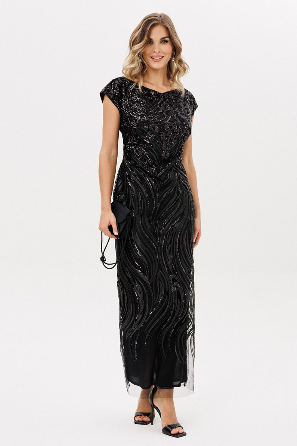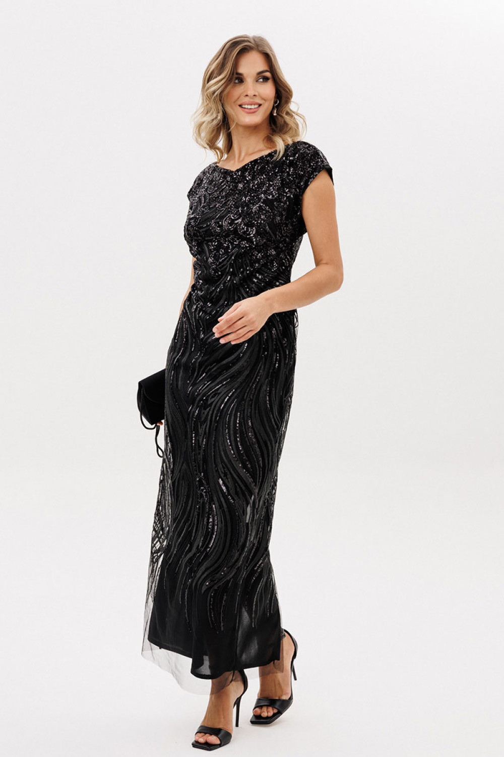 Платье выполнено из сетки с вышивкой с пайетками. В среднем шве спинки разрез и застежка на молнию с металлическими звеньями. Горловина и спинка выполнены в виде V-образной лодочки. Плечевой шов удлинен, образуя рукав цельнокроенного покроя. Платье на отлетной по низу подкладке.