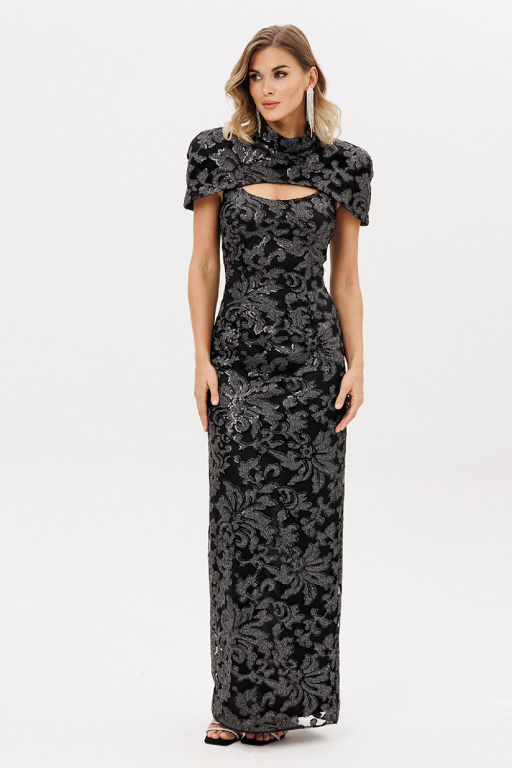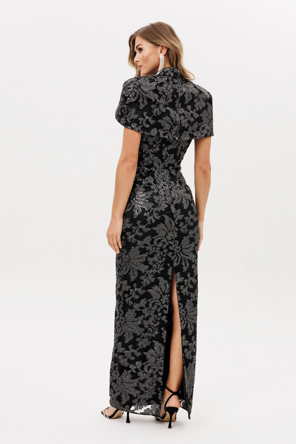 Платье выполнено из костюмно-плательной ткани вышивка на сетке с пайетками. Платье приталенного силуэта длиной миди. Застежка на потайную молнию сзади в среднем шве спинки. Горловина округлой формы, углубленная. Сзади в среднем шве разрез. Платье на отлетной по низу подкладке. Длина платья -132 см.