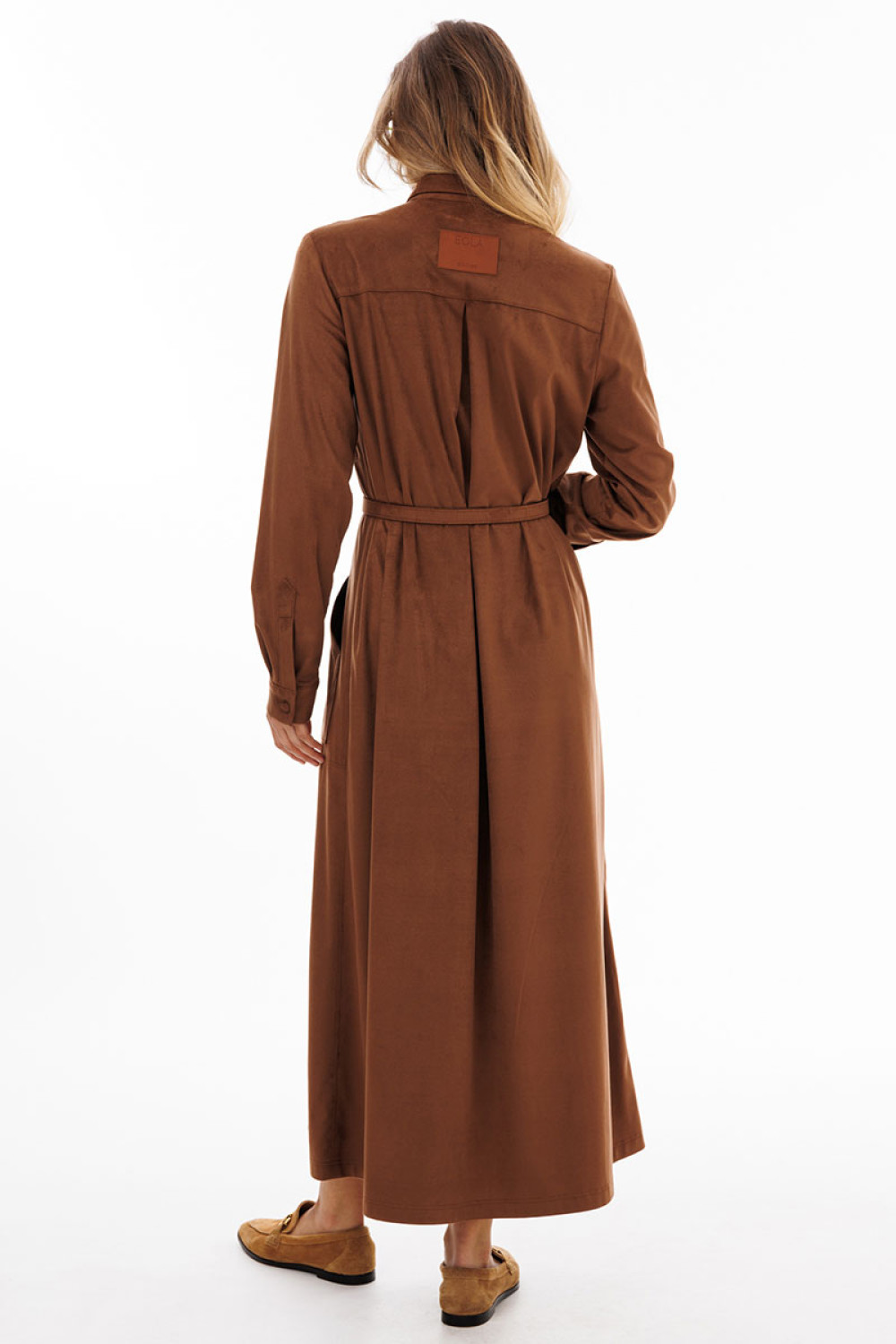 Платье выполнено из тонкой искуственной замши. Платье прямого силуэта, длиной миди. Спереди горизонтальные подрезы, накладные карманы и центральная застежка до верха с планкой на пуговицы. На спинке кокетка и встречная складка. Воротник стояче-отложной с отрезной стойкой и затежкой на пуговицу. Рукав втачной, одношовный. По низу рукава две складки и планка-обтачка. Низ рукава на притачной манжете с застежкой на пуговицу. Платье декорировано нашивкой из натуральной кожи по кокетке спинки. В комплект входит ремень из основной ткани с обтяжной пряжкой.