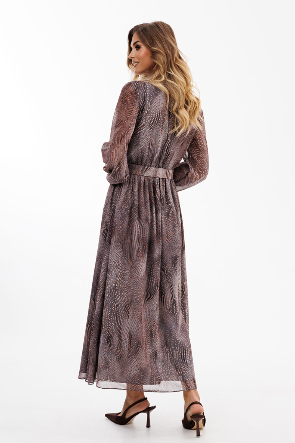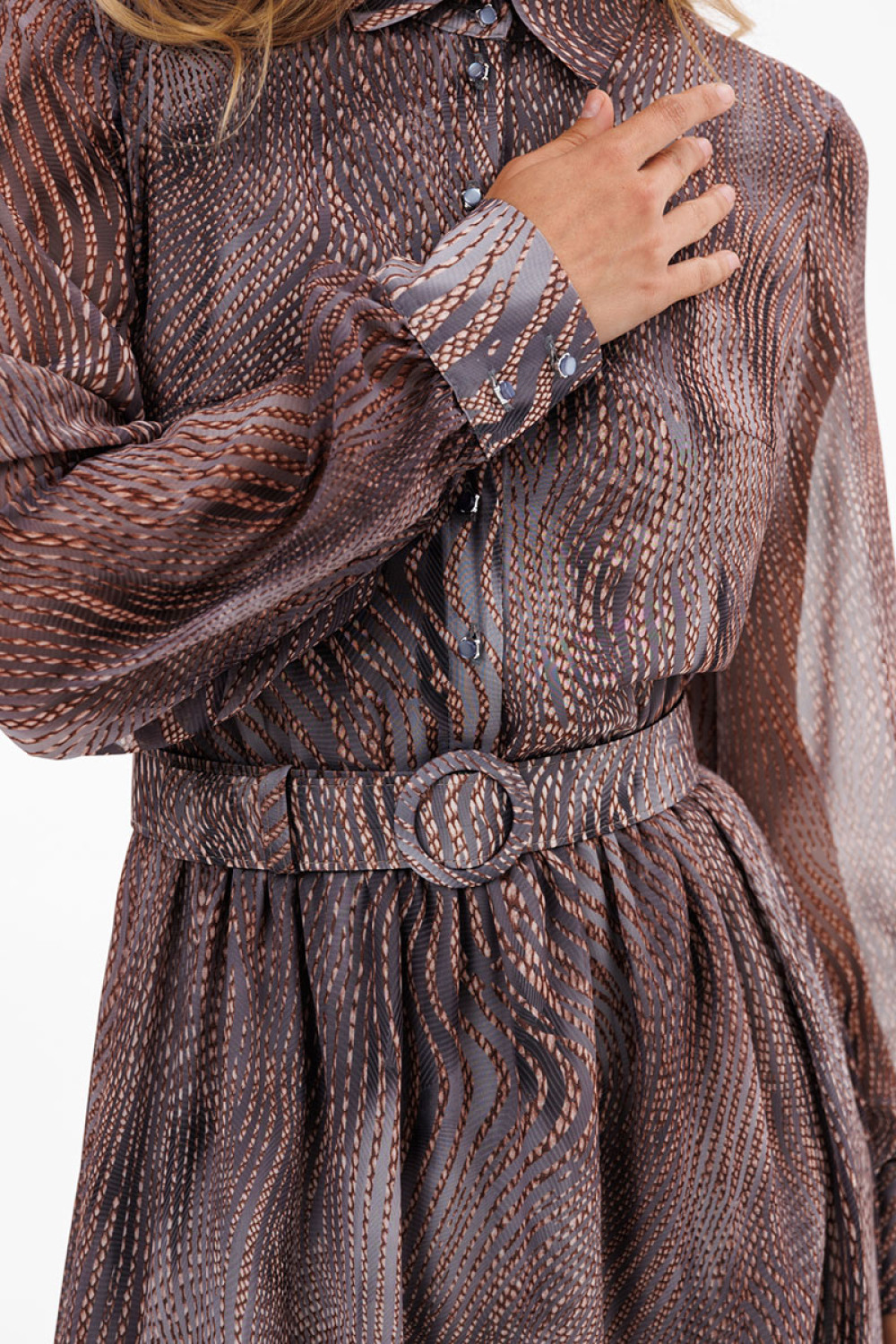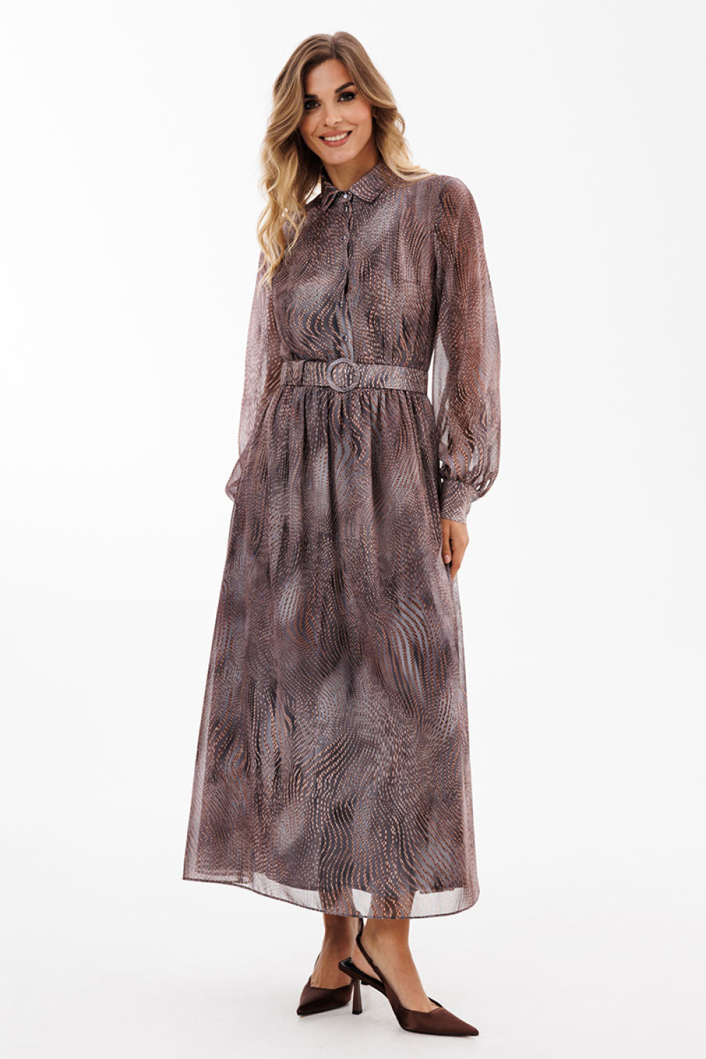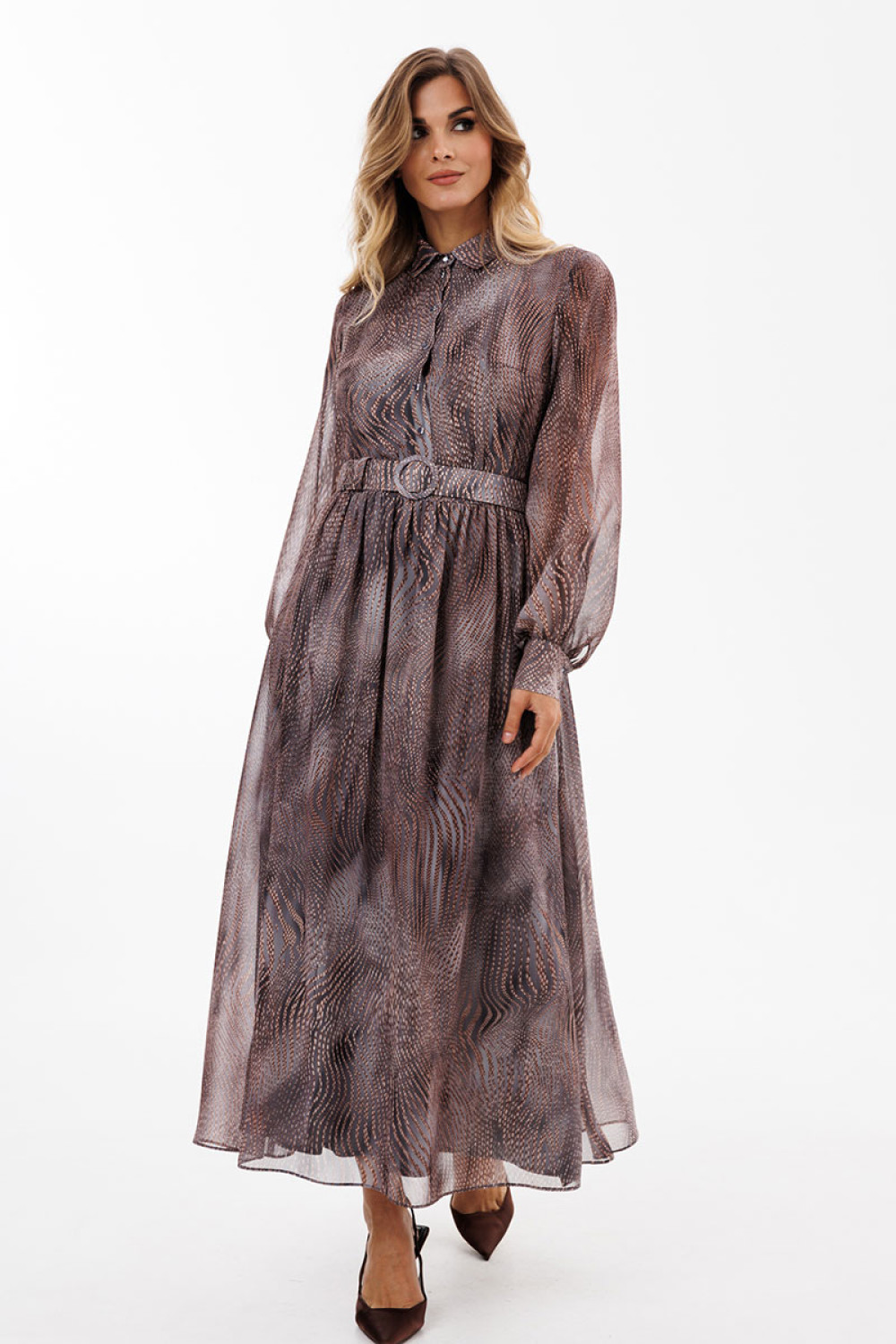 Платье выполнено из шифона с принтом. Платье отрезное по линии талии. Воротник рубашечного типа. Застежка спереди на пуговицы на планке. Рукав втачной, на манжете. Лиф и юбка платья на подкладке из тонкого атласа. В комплект входит съемный ремень из основной ткани с обтяжной пряжкой.