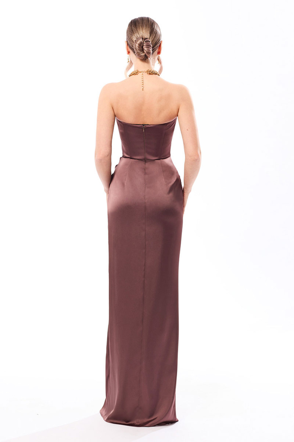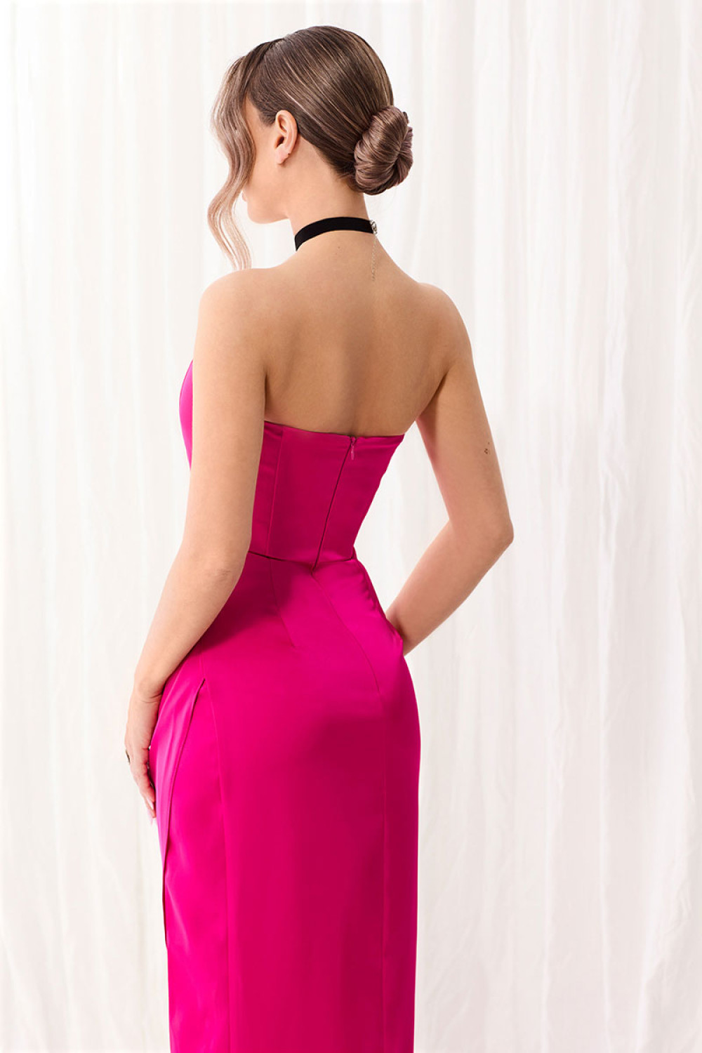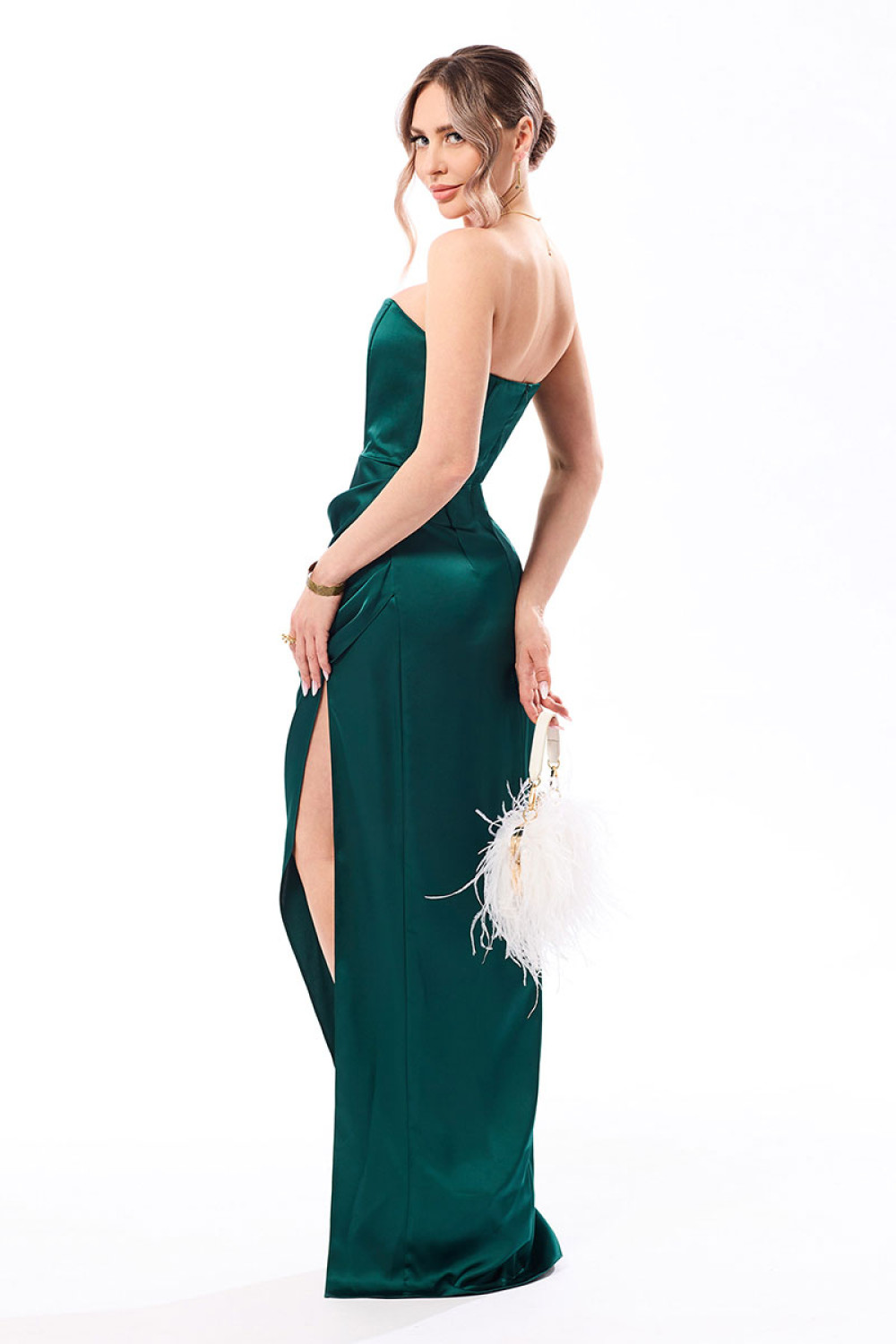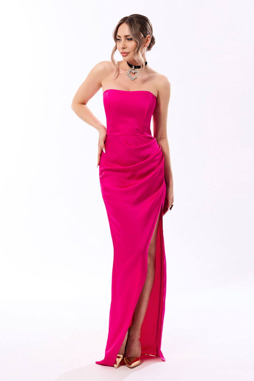 Платье полуприлегающего силуэта, с застежкой на потайную молнию в среднем шве спинки, без воротника, без рукавов, отрезное по линии талии . Лиф переда и спинки с рельефами от верхнего края до талиевого шва, . Спинка со средним швом. Рельефные швы лифа усилены регилином .Нижняя часть переда с двумя асимметричными деталями. Верхняя деталь с четырьмя односторонними складками, выходящими из бокового шва. Платье без подкладки.