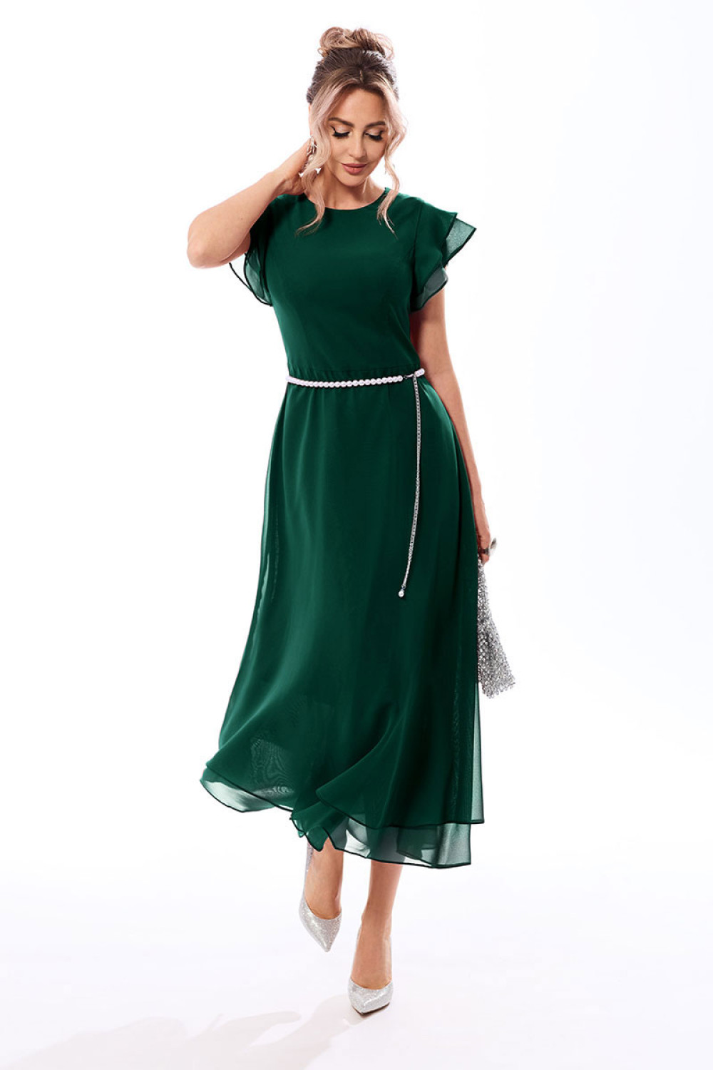 Спинка со средним швом, по лифу спинки с рельефами, выходящими из проймы. Нижняя часть платья двойная, расширенная к низу. Рукав втачной, короткий, крылышко, двойной. Платье со съемным декоративным поясом. Комплектация: платье на подкладке.