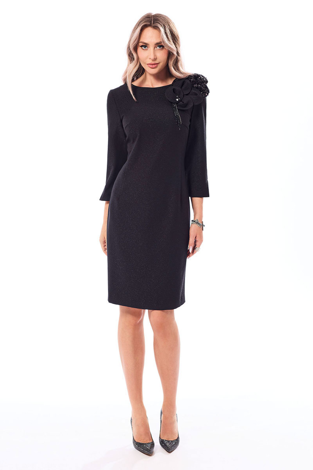 Платье без воротника, с фигурным вырезом горловины, застежкой на потайную молнию в среднем шве спинки. По переду с талиевыми и нагрудными вытачками. Спинка со средним швом, заканчивающимся шлицей, талиевыми вытачками. Рукав втачной, 3/4, со швом по верхнему срезу, заканчивающимся разрезом. Платье со съемной брошью. Силуэт: полуприлегающий. Комплектация: платье на подкладке.