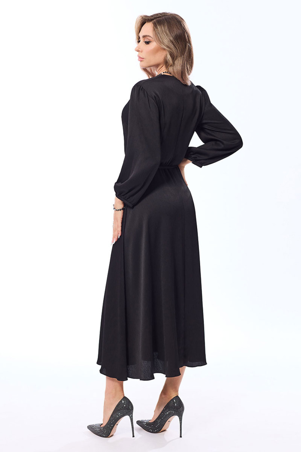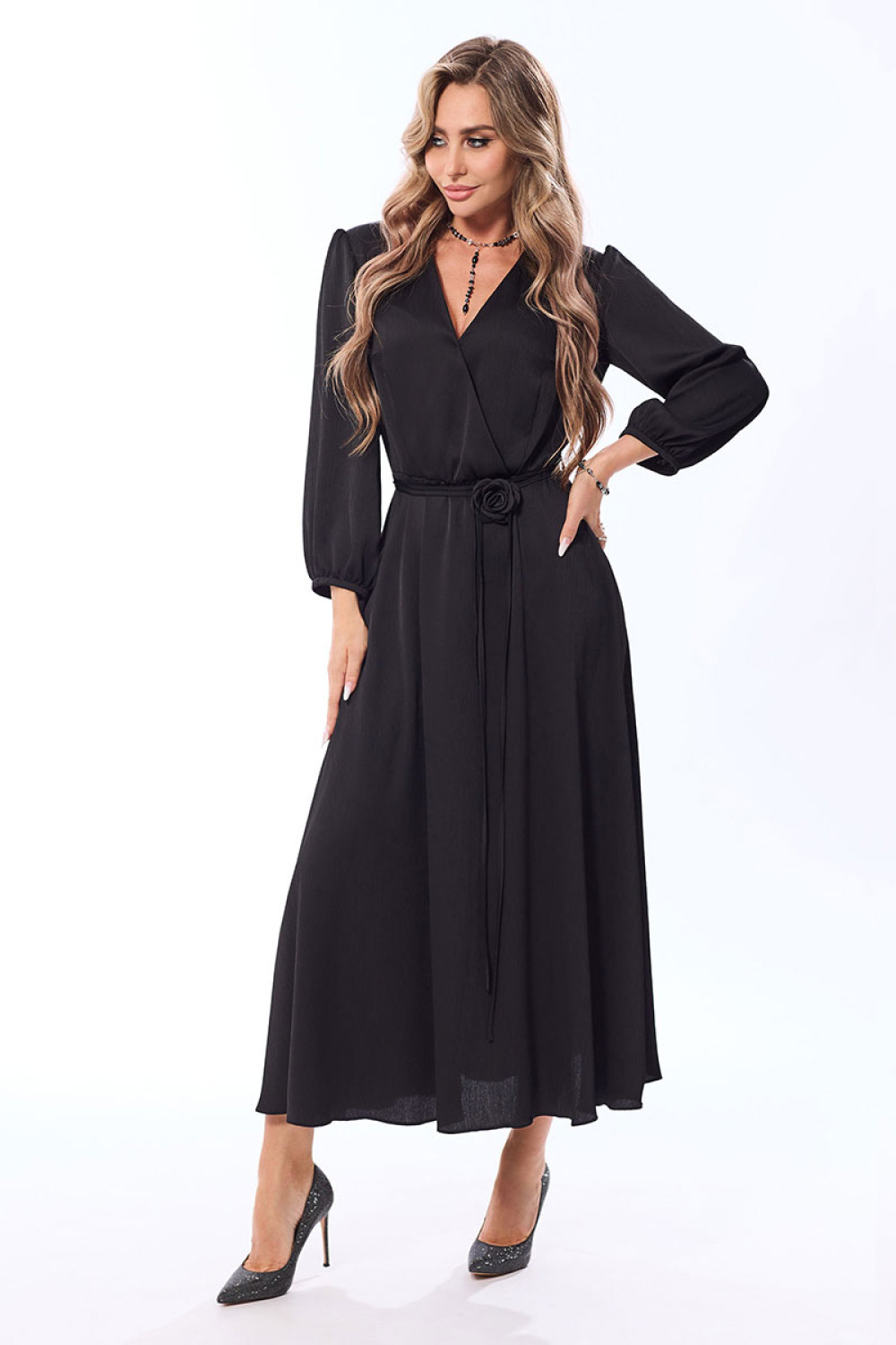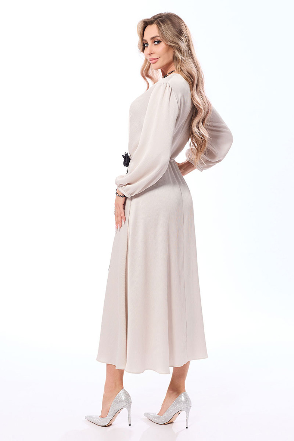 Платье, без воротника, без застежки, отрезное по линии талии. Лиф переда с запахом. Талия собрана на резинку. Верхняя часть спинки с талиевыми вытачками. Нижняя часть платья расширена к низу. Рукав втачной, 3/4, с манжетой, присборенной на резинку. Платье со съемным декоративны поясом из основной ткани и декоративным цветком на поясе. Комплектация: платье без подкладки.