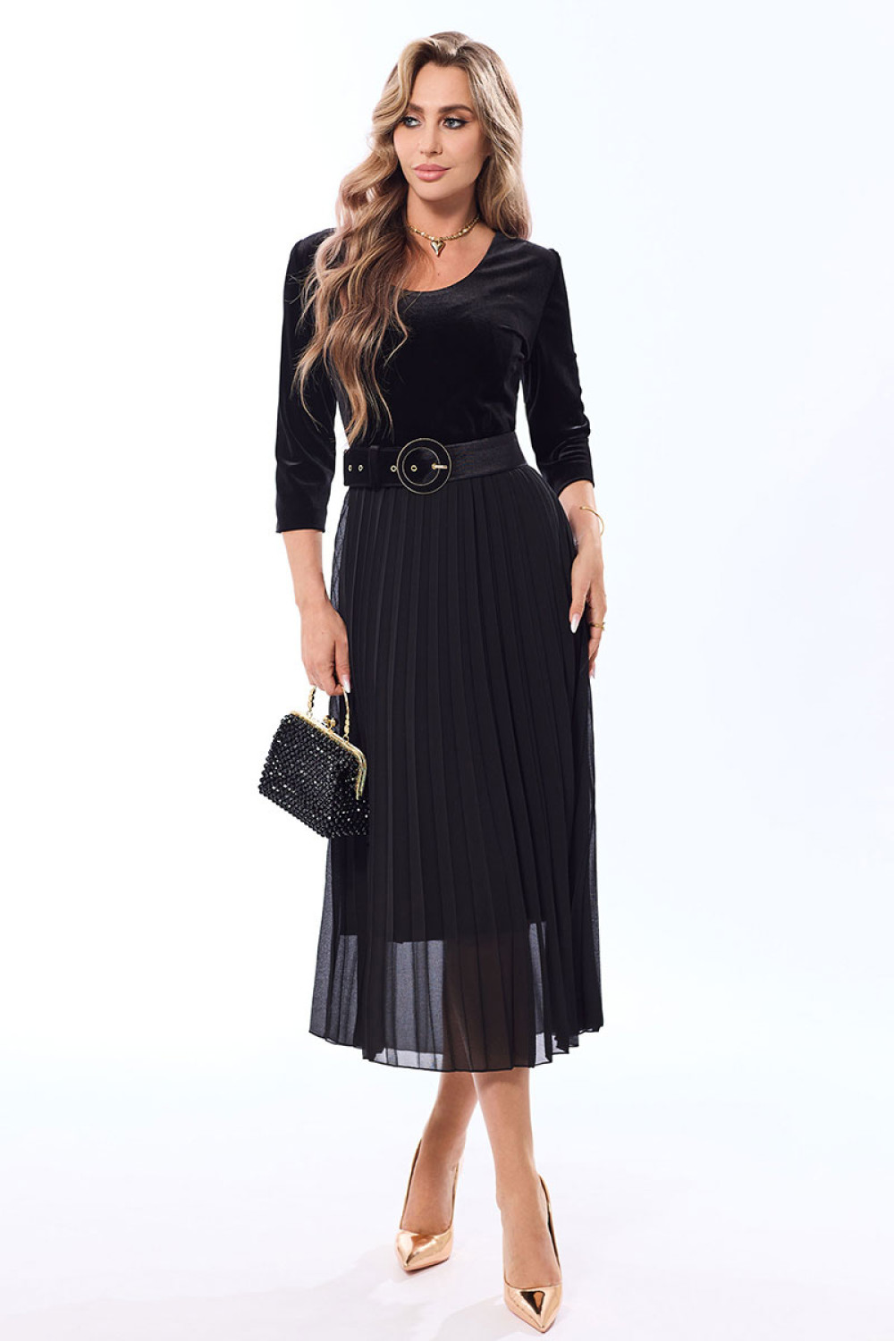 Платье полуприлегающего силуэта, с застежкой на потайную молнию в левом боковом шве, без воротника, с круглым вырезом горловины, отрезное по линии талии . Шов по талии присборен на резинку. Лиф переда с нагрудными и талиевыми вытачками. Спинка с талиевыми вытачками. Нижняя часть переда расклешенная к низу, с гофрировкой. Рукав втачной, длинный. Платье с декоративным поясом. По боковым швам расположены шлевки для пояса. Верхняя часть платья из бархата, нижняя часть- из шифона. Комплектация: платье на подкладке.