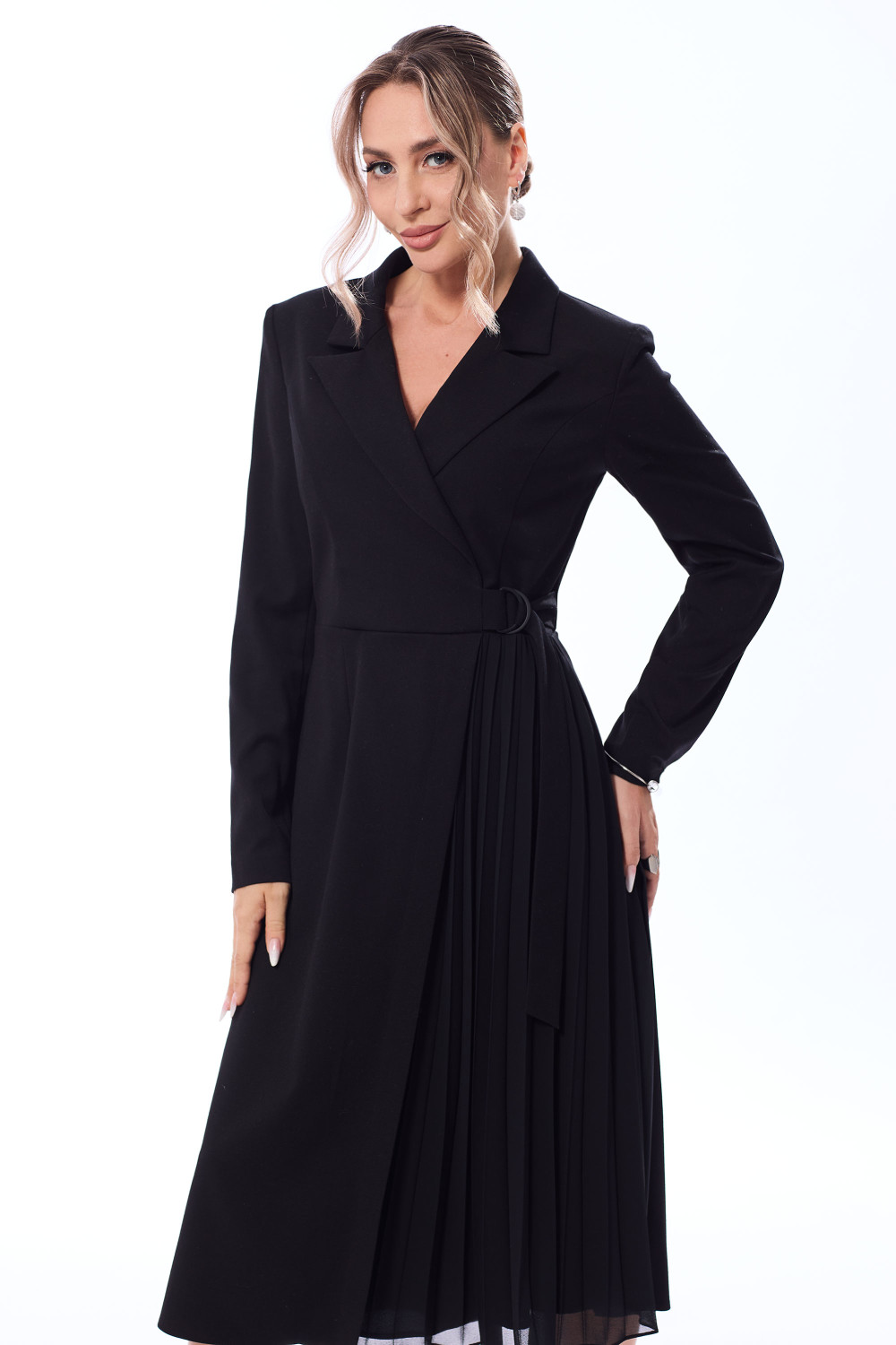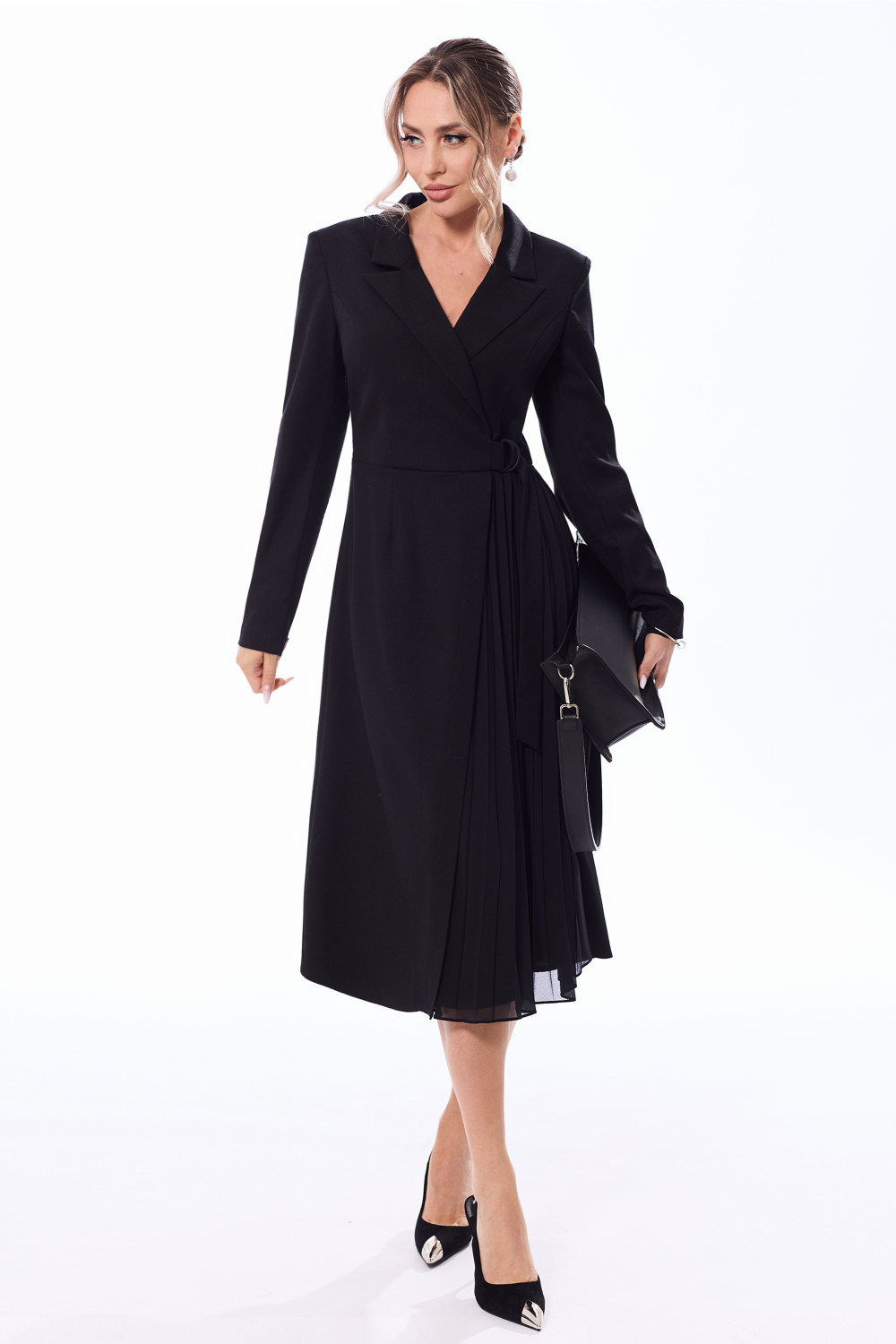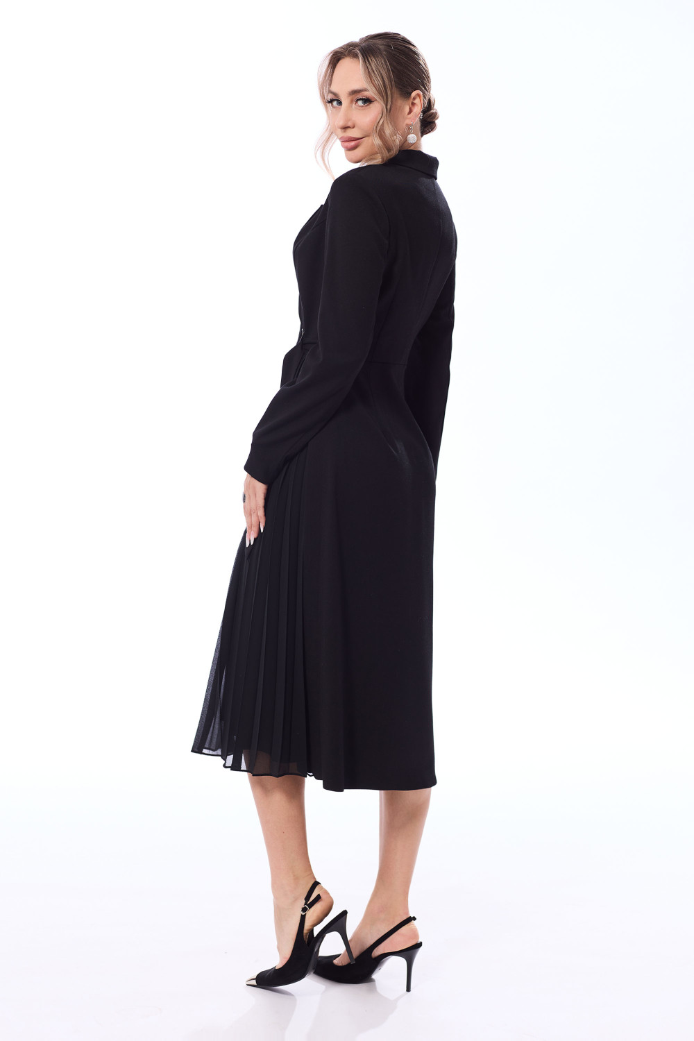 Платье с центральной двубортной застежкой по лифу переда на одну пришивную кнопку и на потайную молнию в правом боковом шве, втачным воротником и отложными лацканами. Платье отрезное по линии талии. По лифу переда- рельефы, выходящие из проймы. Нижняя часть переда с асимметричной вставкой- гофре. По линии талии- декоративный пояс- завязка на полукольцах. Спинка со средним швом, талиевыми вытачками. Рукав втачной, длинный. Платье на подкладке.