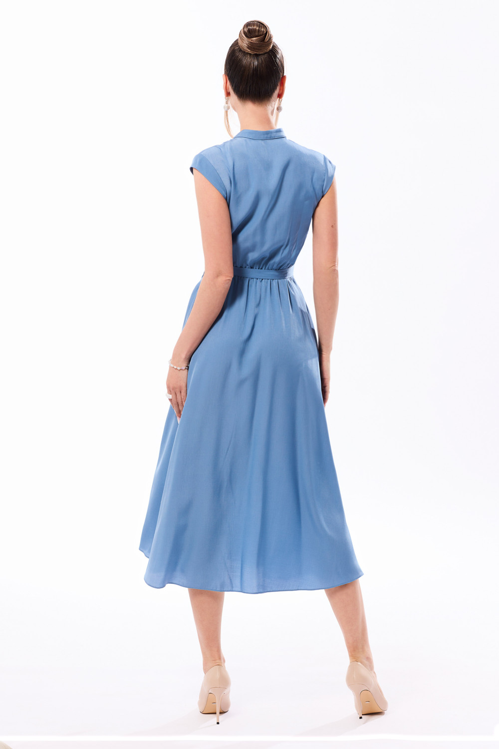 Платье с центральной застежкой на петли и пуговицы, с отрезным воротником- стойкой, рукав- крылышко. Платье отрезное по линии талии. Шов по талии присборен на резинку. По горловине переда- шнур- завязка. В боковых швах расположены карманы. Платье со съемным поясом.