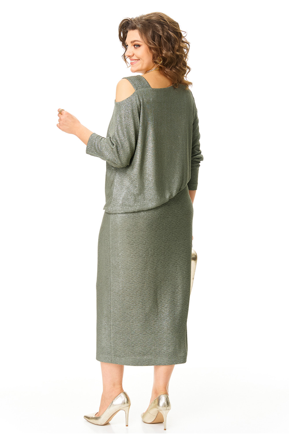 Платье из трикотажного полотна с легким люрексом, с асимметричным вырезом горловины и асимметричным подрезом по линии ниже талии. Верхняя часть платья на подкладке, с напуском по переду и спинке. Рукав длинный. Шлейка по левому плечу выполнена из основной ткани.