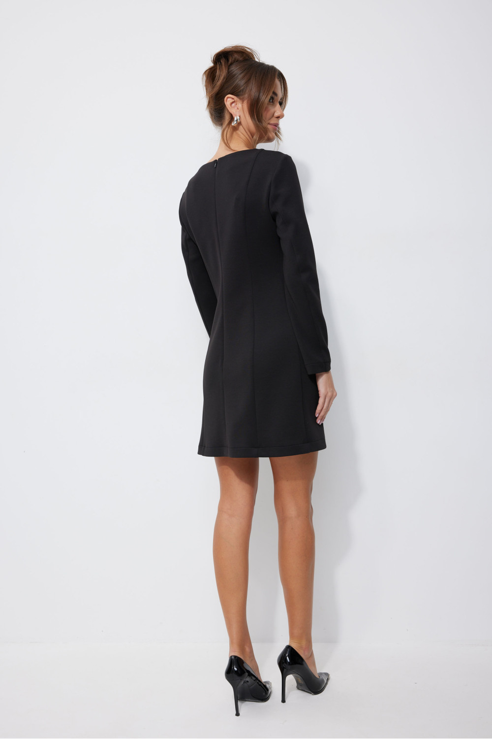 Нарядное платье из трикотажного полотна, длина мини. Платье прилегающего силуэта с небольшим расширением по низу. С рельефами по переду и спинке. По переду слева вдоль рельефа пришивной декор «цветы». По переду слева рельеф с разрезом по низу. Рукав втачной, длинный. Вырез горловины «лодочка». Потайная молния в среднем шве спинки. Обращаем Ваше внимание, что декор может незначительно отличаться от фото.