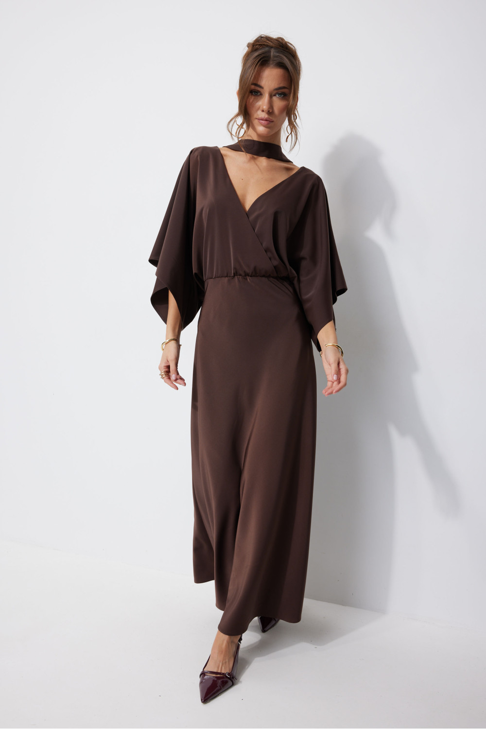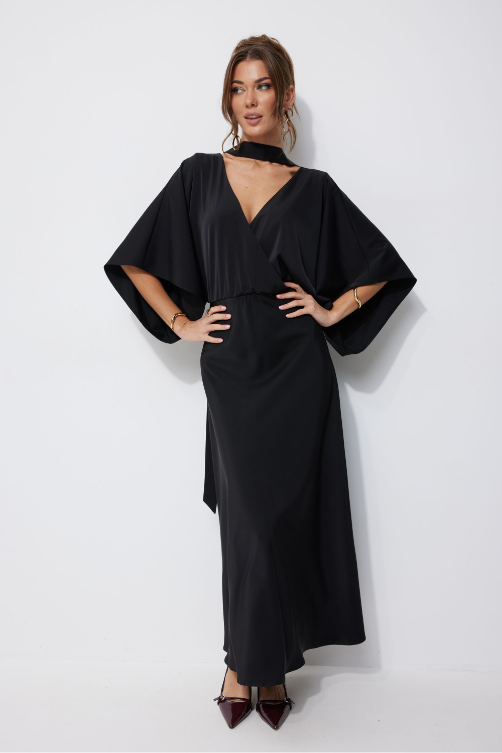 Нарядное платье из струящейся ткани, длина макси. Платье полуприлегающего силуэта. Отрезное по линии талии, с резинкой. По переду запах. По спинке глубокий V-образный вырез горловины. Рукав цельнокроеный, расширенный, длина немного ниже линии локтя. Юбка покроена по косой, силуэт расширяется к низу. Платье дополняется мягким поясом из основной ткани. Его можно использовать, как шаль, повязав на шею, либо, как пояс - на талию.