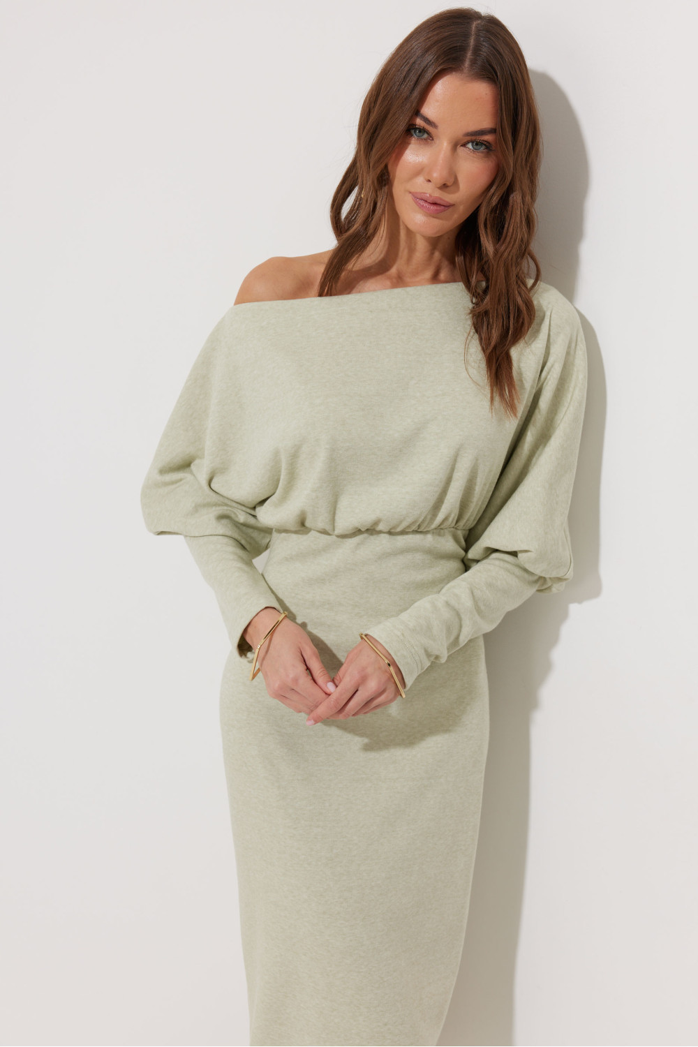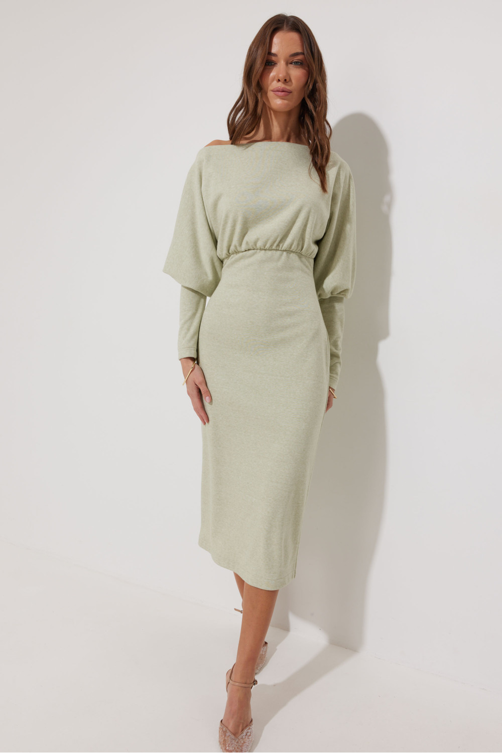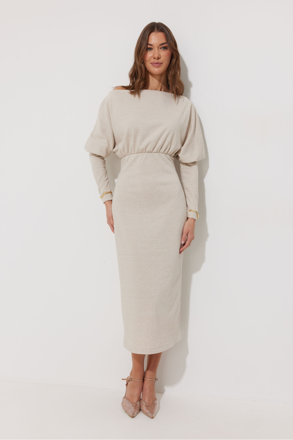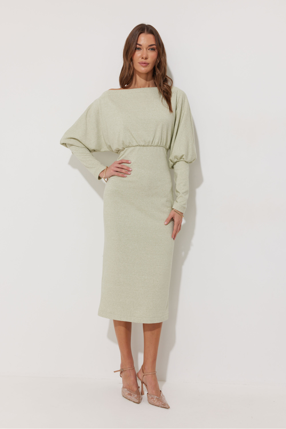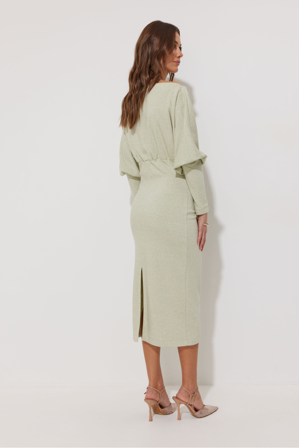 Платье полуприлегающего силуэта из трикотажного полотна. Горловина-лодочка. Рукав цельнокроеный, с подрезом выше уровня локтя и узкой длинной манжетой. По переду и спинке выше линии талии подрез, в который вставлена резинка. Обращаем ваше внимание, что ремень в комплект не входит.