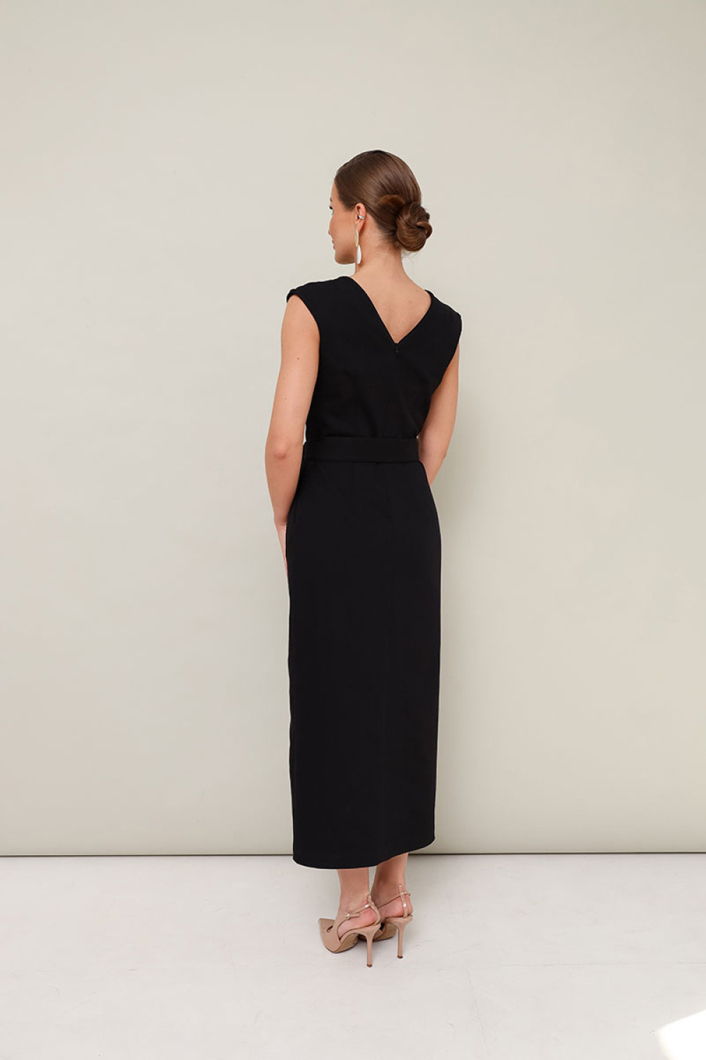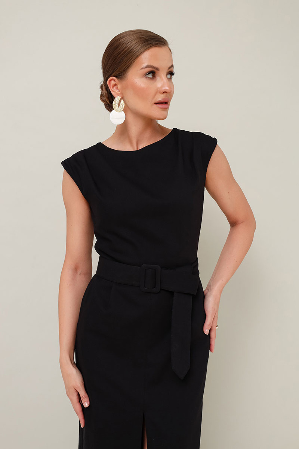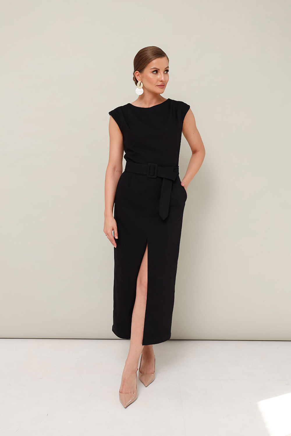 Стильное платье в длине миди, отрезное по линии талии, выполнено из джинсовой ткани. Вырез горловины - лодочка. По плечевым швам лифа и по талии обработаны защипы. Юбка со средним швом, переходящим в разрез. Спинка в V-образным вырезом. В среднем шве застёжка на потайную тесьму молнию. В комплекте прилагается пояс из основной ткани с обтяжной пряжкой.
