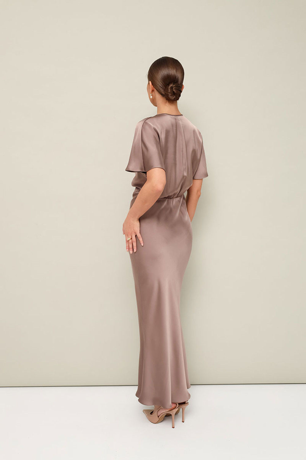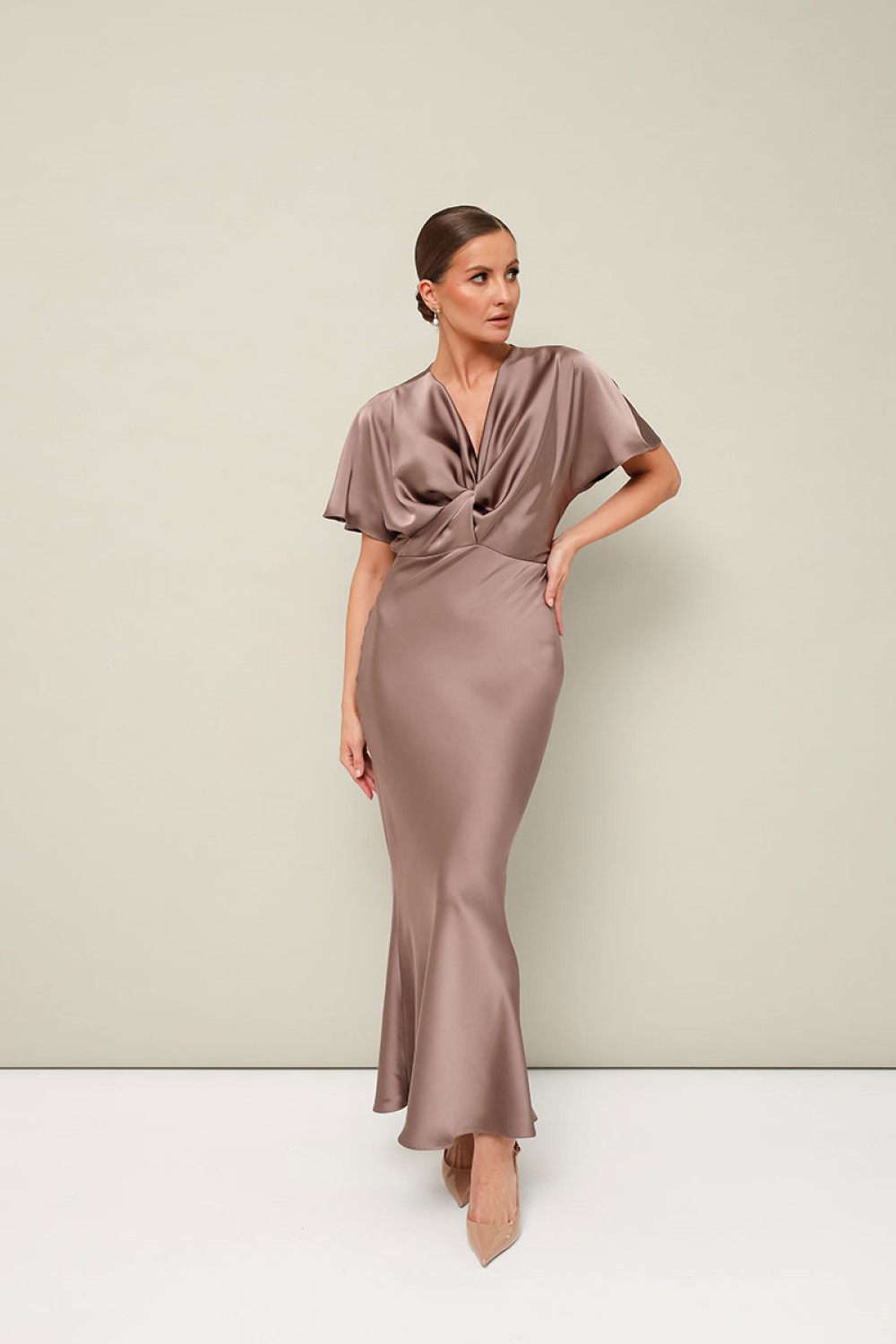 Платье полуприлегающего силуэта, отрезное по талии, выполнено из струящейся ткани с матовым блеском. V-образный вырез горловины. Спереди лифа обработан декоративный узел. Рукава короткие цельнокроеные. Спинка лифа со средним швом, по линии талии для комфорта обработана резинка. Крой юбки по косой.
