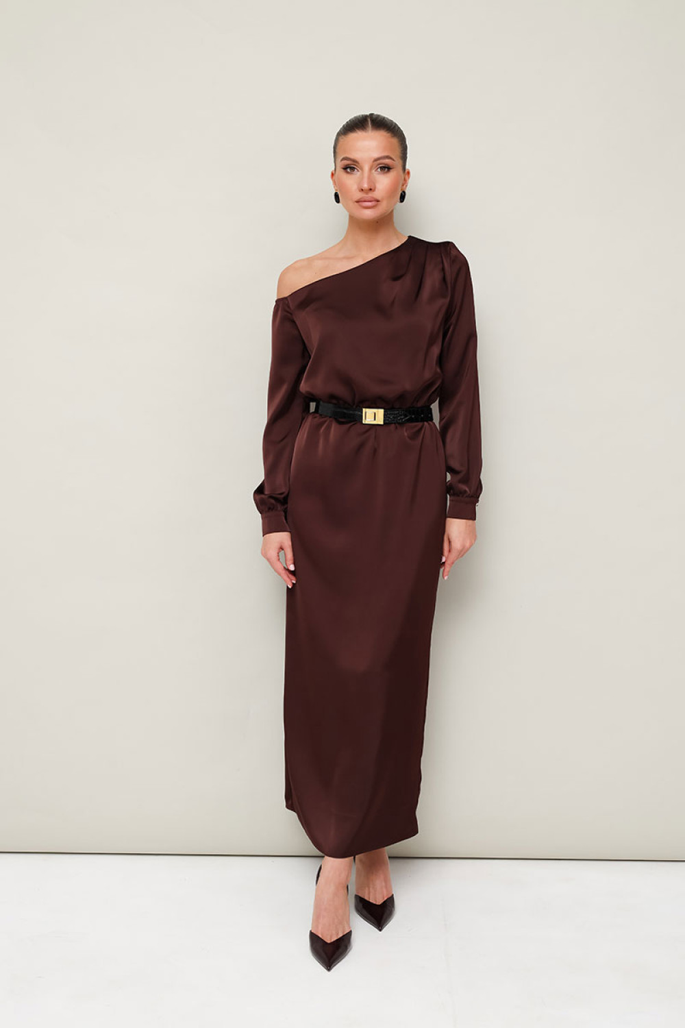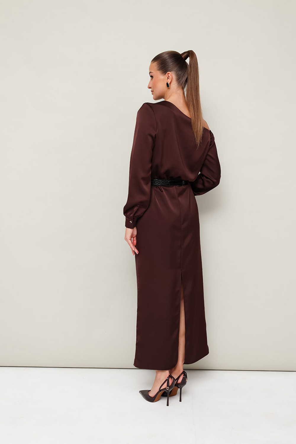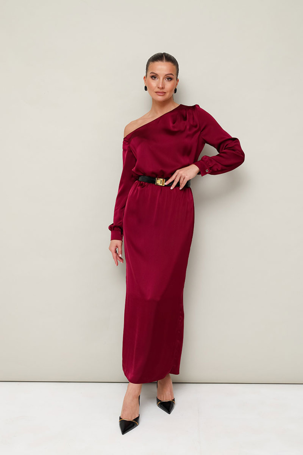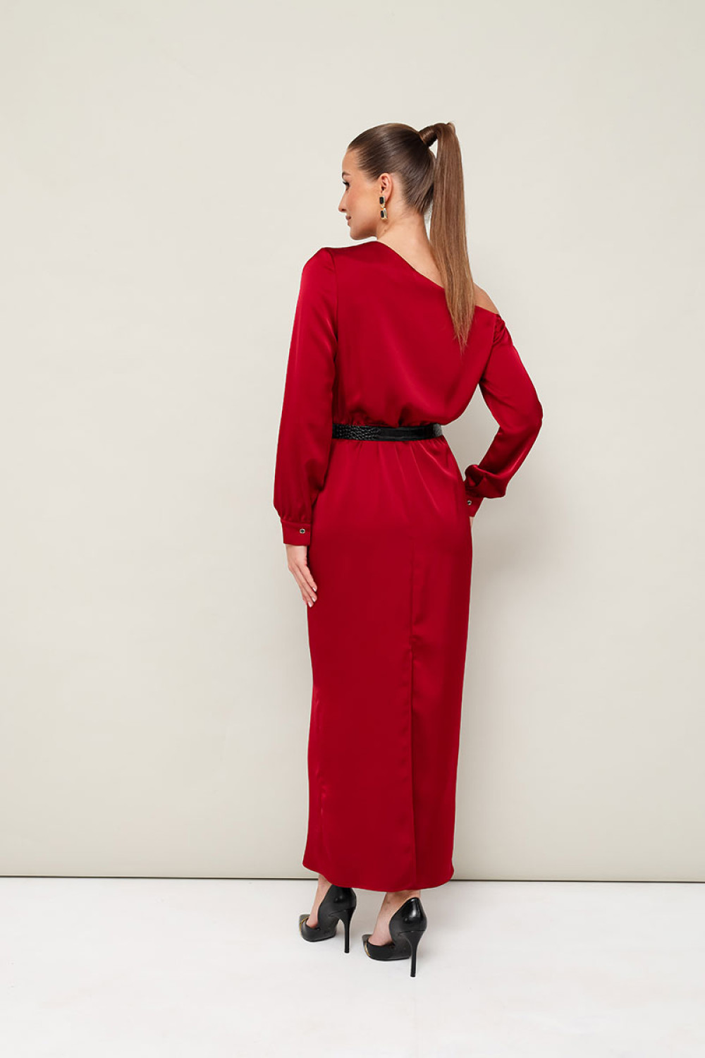 Вечернее платье полуприлегающего силуэта, выполнено из струящейся ткани с благородным матовым блеском. Ассиметричный вырез горловины с открытым плечом. Правый плечевой шов декорирован складками. Платье отрезное по линии талии на резинке. Рукава длиннные с манжетами с застежкой на петли и пуговицы. По спинке в среднем шве юбки обработан разрез. В комплекте прилагается ремень с акцентной пряжкой.