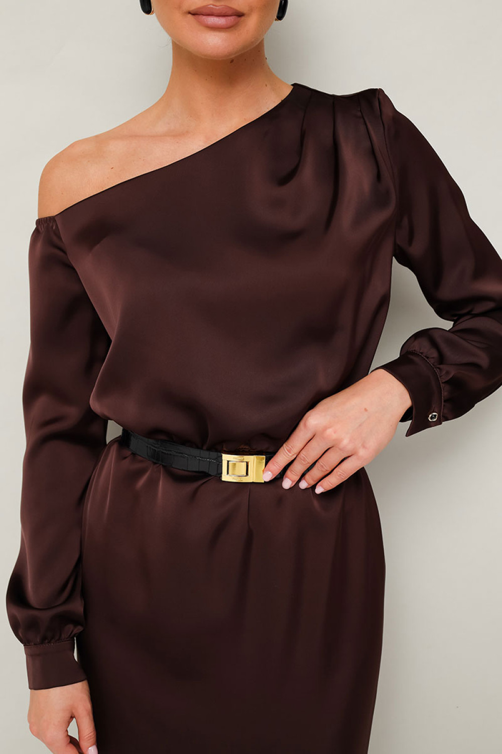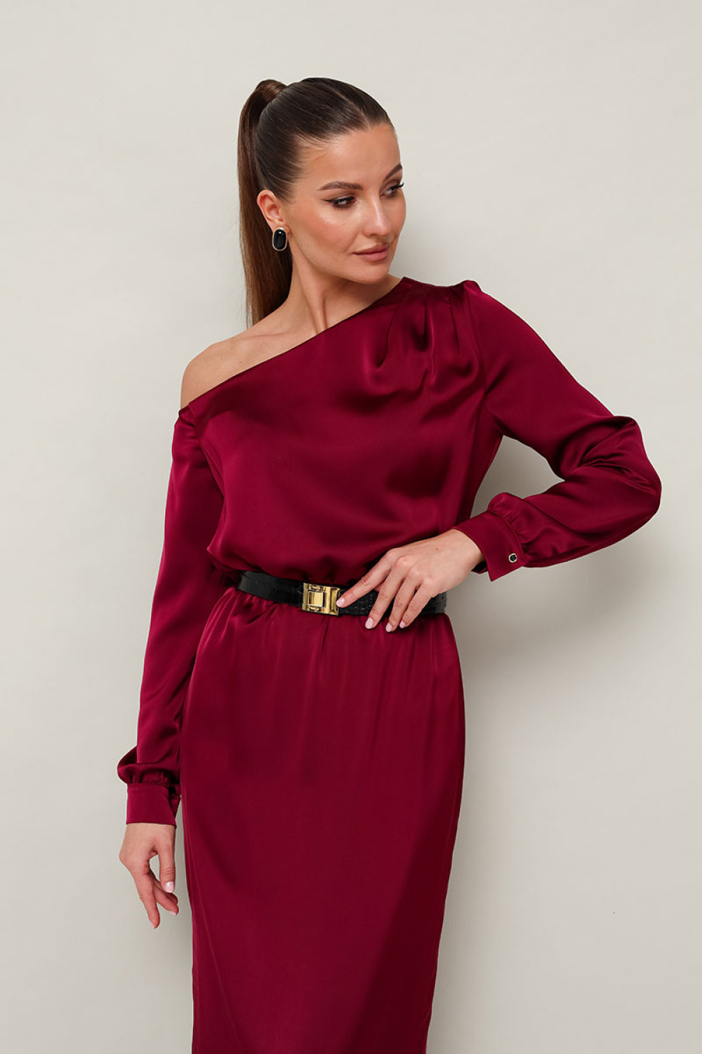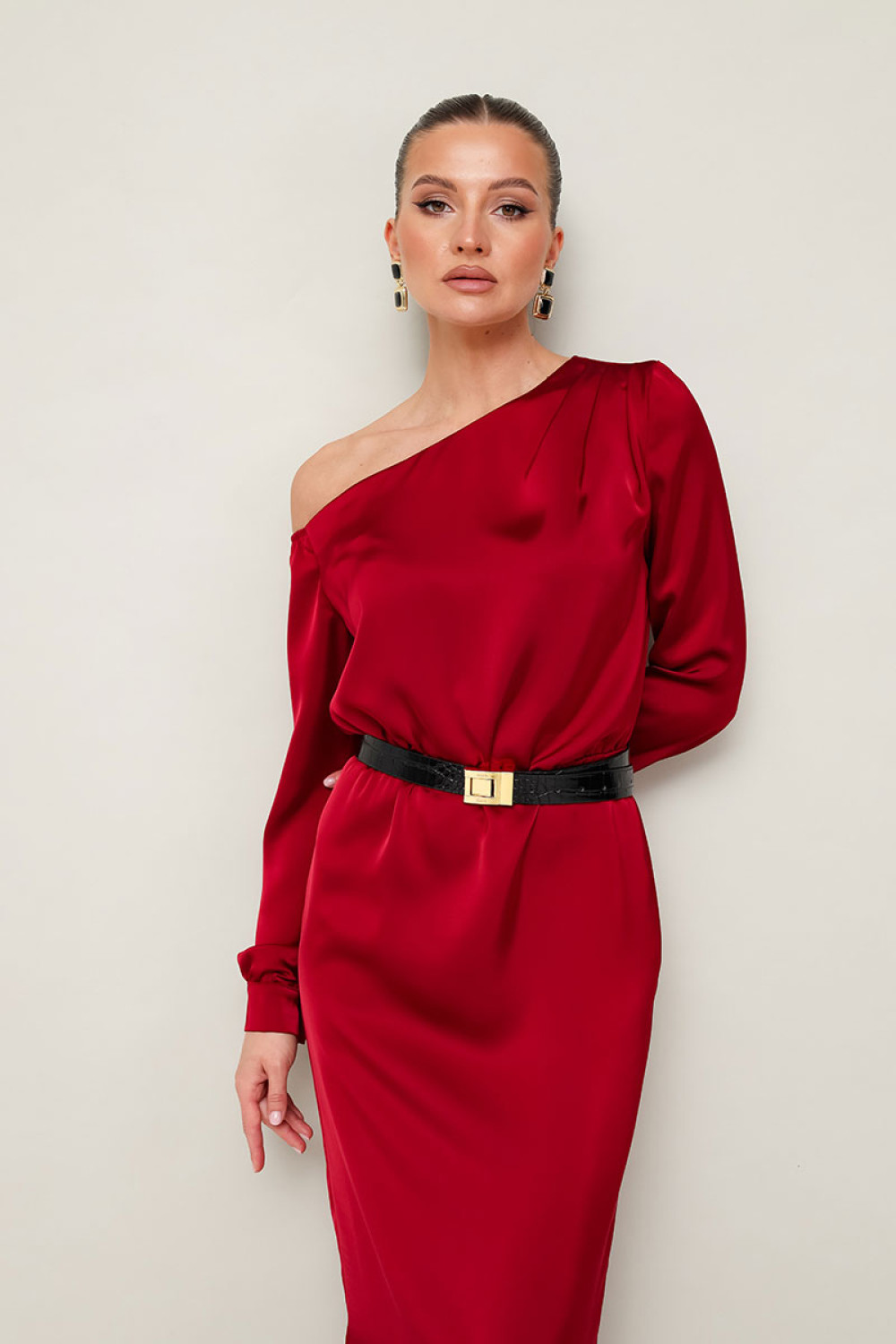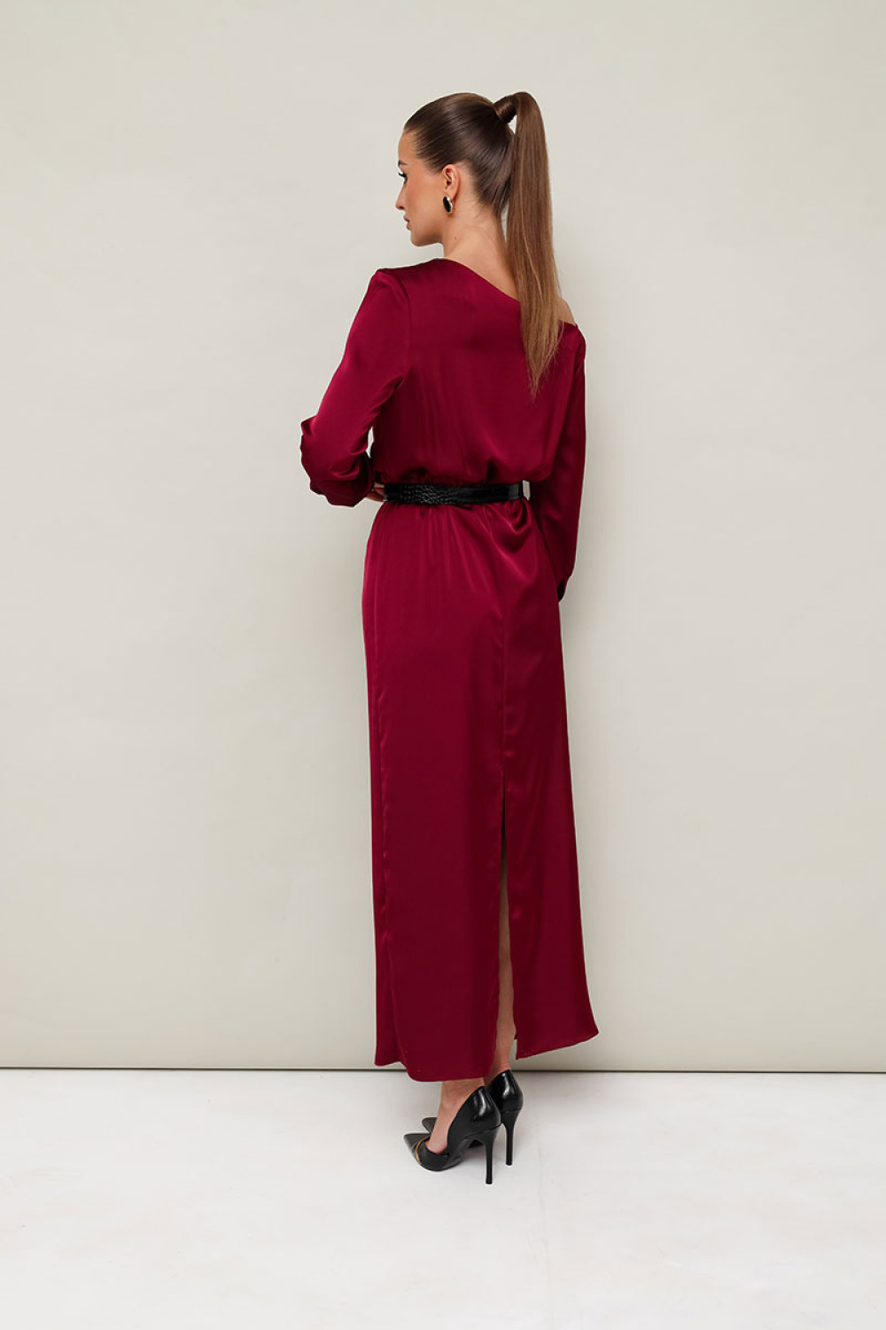 Вечернее платье полуприлегающего силуэта, выполнено из струящейся ткани с благородным матовым блеском. Ассиметричный вырез горловины с открытым плечом. Правый плечевой шов декорирован складками. Платье отрезное по линии талии на резинке. Рукава длиннные с манжетами с застежкой на петли и пуговицы. По спинке в среднем шве юбки обработан разрез. В комплекте прилагается ремень с акцентной пряжкой.