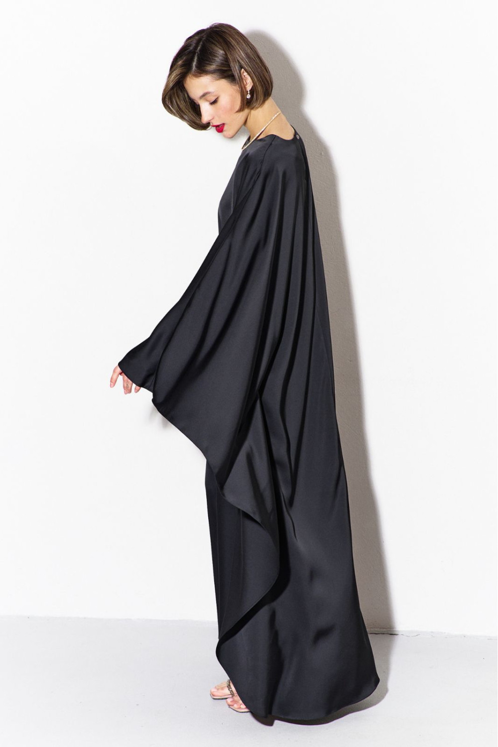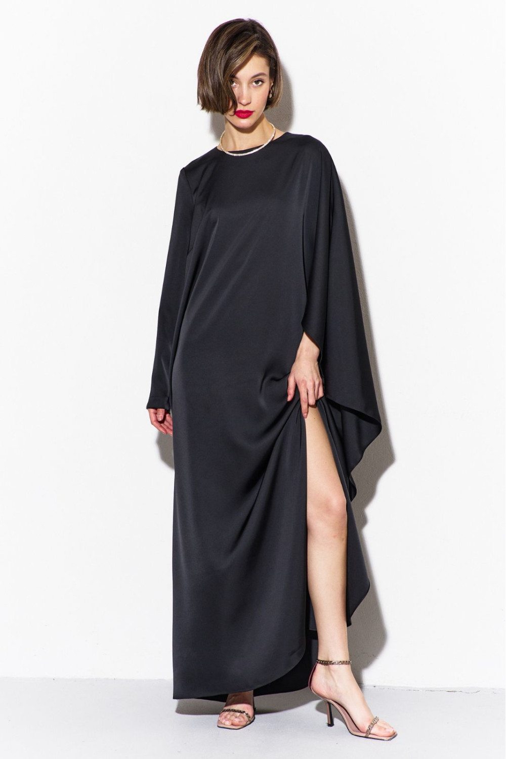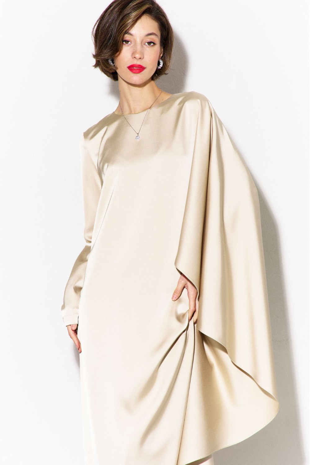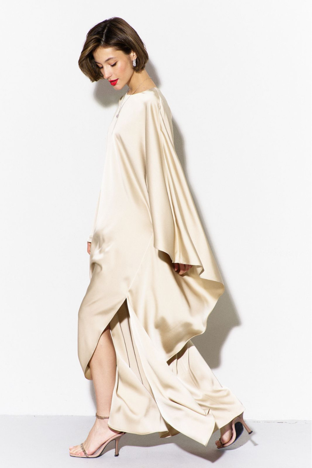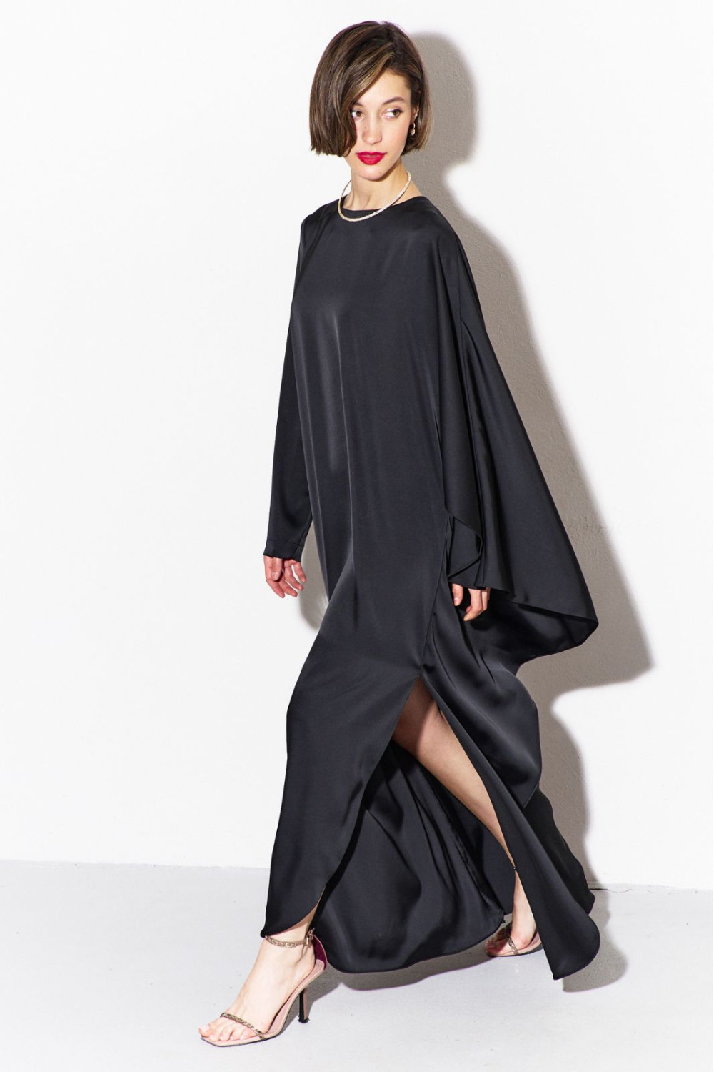 -платье ассиметричное: с левой стороны рукав цельнокроеный «летучая мышь», с правой стороны – втачной, длинный рукав