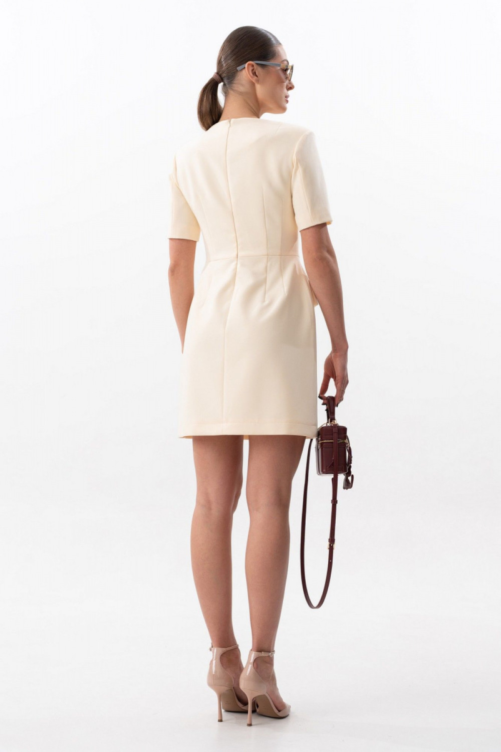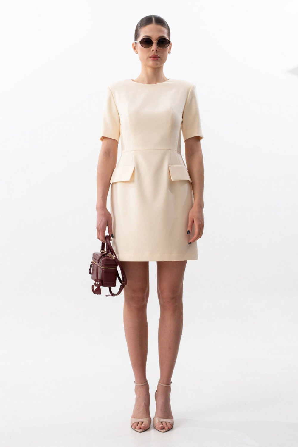 Платье прилегающего силуэта "песочные часы" с отрезной линией талии. Полочка верхней части с отрезными бочками и вытачками. Спинка с талиевыми вытачками. По переду нижней части платья настрочные клапаны. Застежка - потайная молния в среднем шве спинки. Рукав втачной укороченный, двухшовный, с плечевой накладкой. Платье полностью на трикотажной подкладке. Идеальный вариант для безупречного образа.