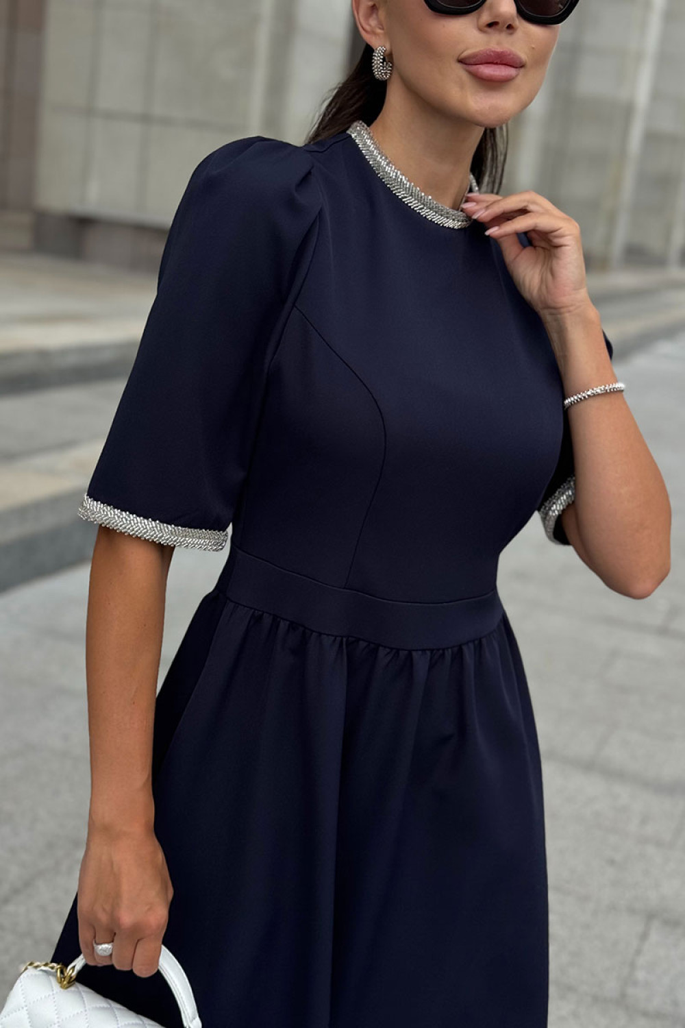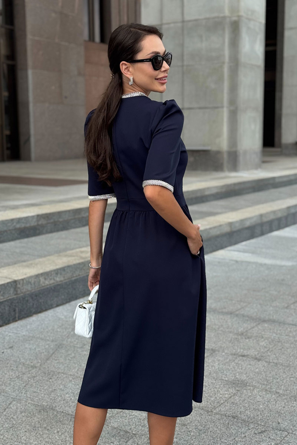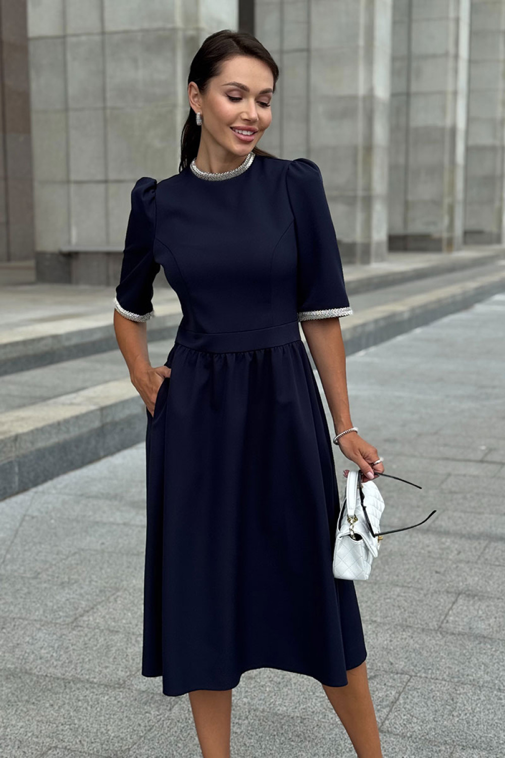 Платье женское полуприлегающего силуэта, отрезное по линии талии с притачным поясом, выполнено из костюмно-плательной ткани "лащенка". Перед и спинка на трикотажной, отлетной по низу, подкладке. Горловина, низа рукавов декорированы отделочной тесьмой, что придает платью нарядный вид.