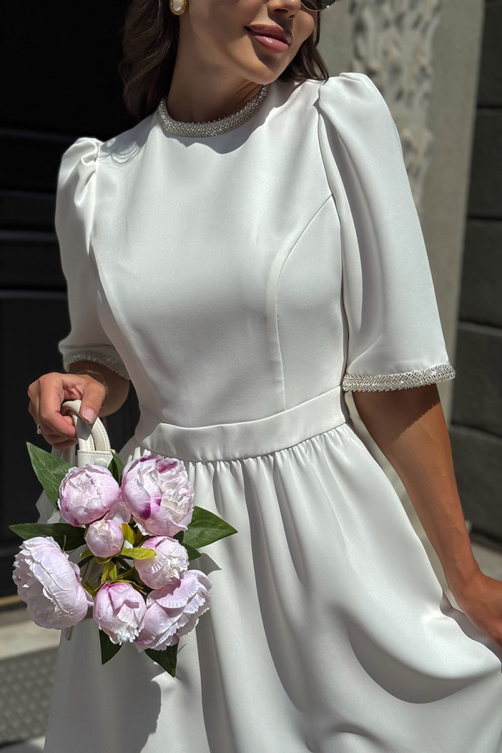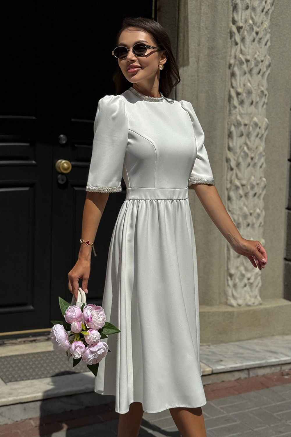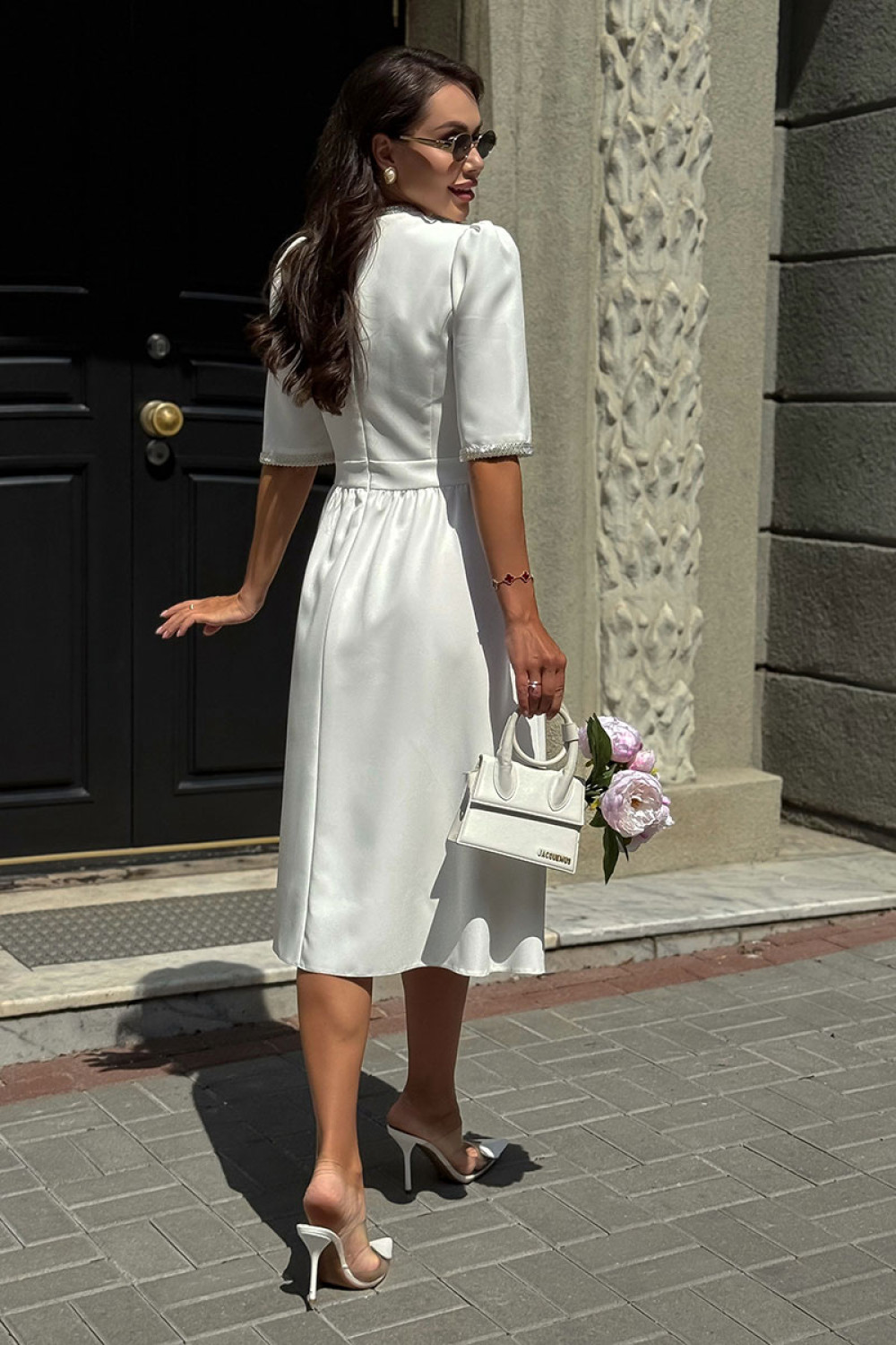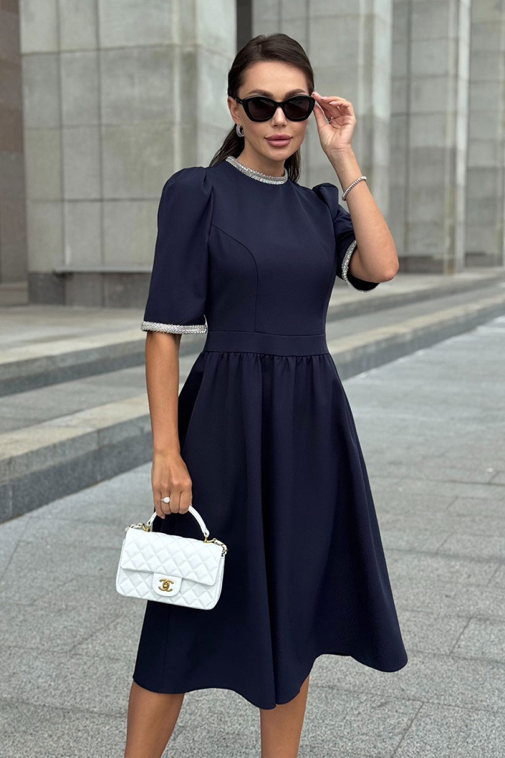 Платье женское полуприлегающего силуэта, отрезное по линии талии с притачным поясом, выполнено из костюмно-плательной ткани "лащенка". Перед и спинка на трикотажной, отлетной по низу, подкладке. Горловина, низа рукавов декорированы отделочной тесьмой, что придает платью нарядный вид.
