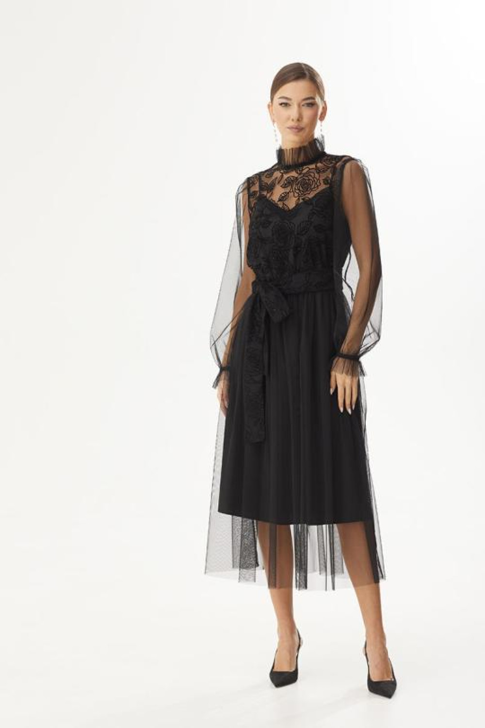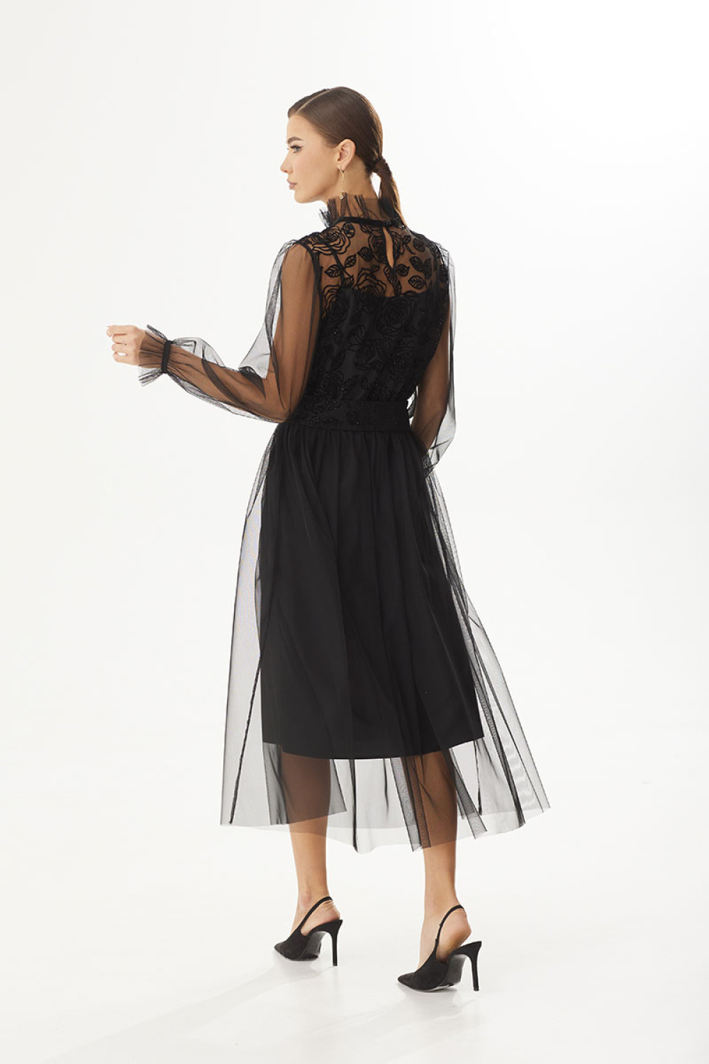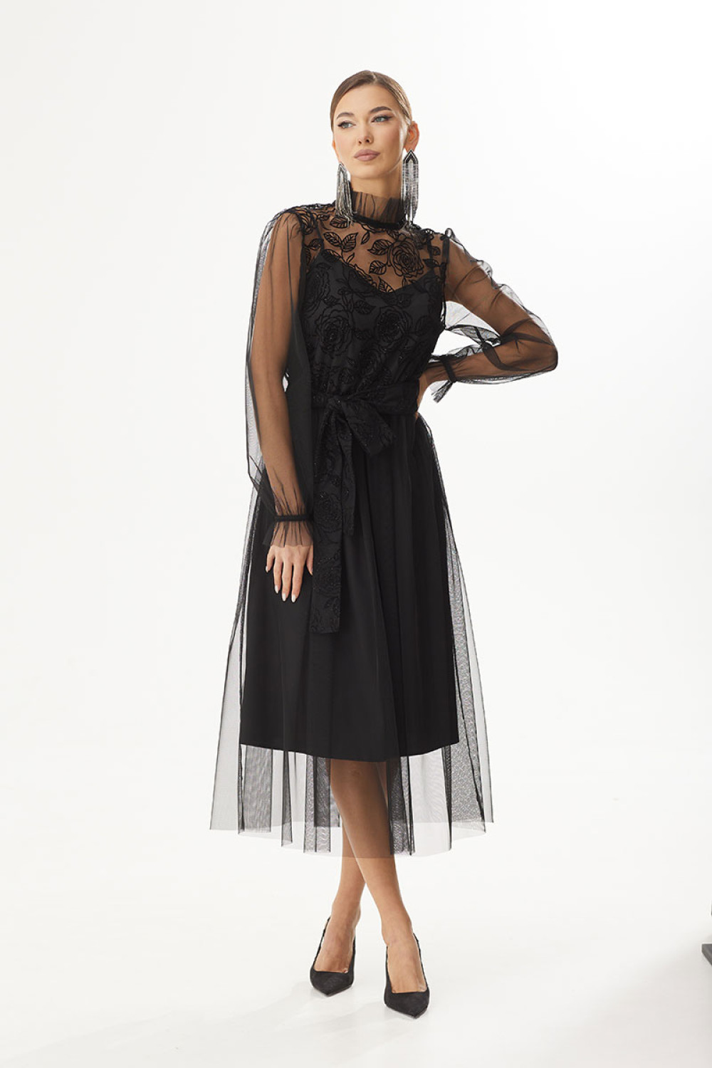 Платье двухслойное полуприлегающего силуэта, отрезное по линии талии. Верхний лиф выполнен из фатина с флоком. Перед и спинка цельнокроеные. В области горловины обработана застежка-капелька на навесную петельку и пуговицу. Нижняя юбка прямая, верхняя юбка собрана по линии талии. Рукав длинный, втачной, по низу оборка, на запястье просборен на резинку. Горловина округлой формы, декорирована тесьмой. В комплекте съемный пояс.Длина платья по спинке 88 см.