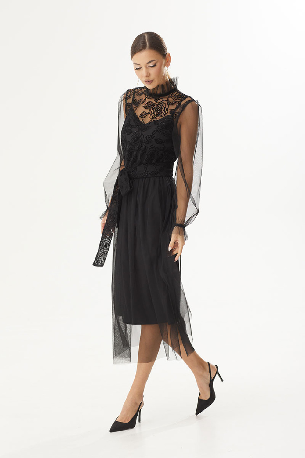 Платье двухслойное полуприлегающего силуэта, отрезное по линии талии. Верхний лиф выполнен из фатина с флоком. Перед и спинка цельнокроеные. В области горловины обработана застежка-капелька на навесную петельку и пуговицу. Нижняя юбка прямая, верхняя юбка собрана по линии талии. Рукав длинный, втачной, по низу оборка, на запястье просборен на резинку. Горловина округлой формы, декорирована тесьмой. В комплекте съемный пояс.