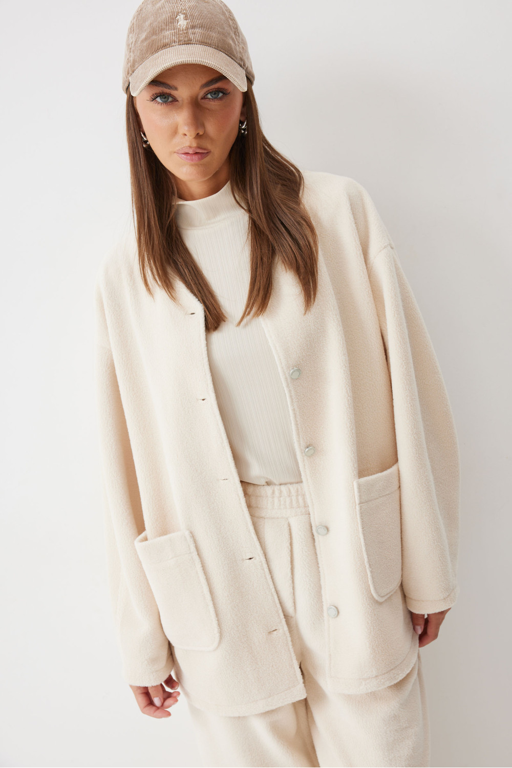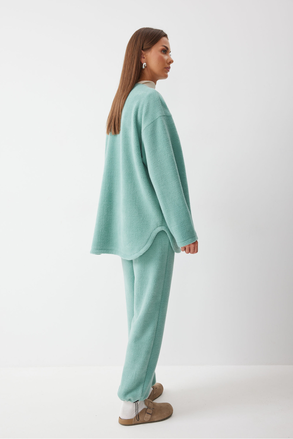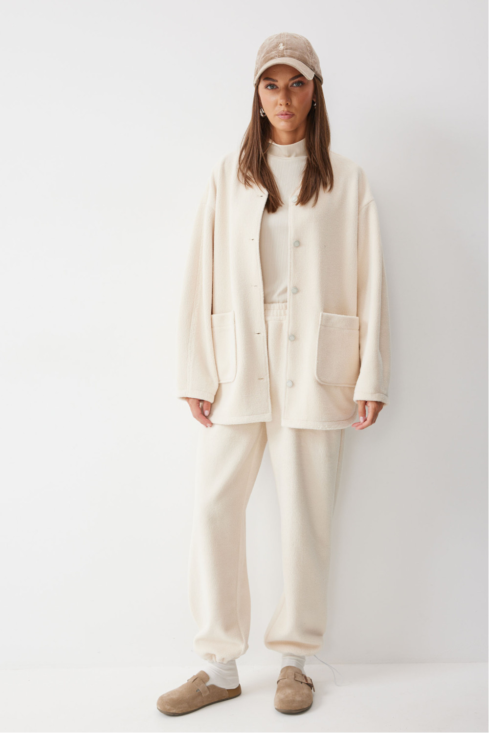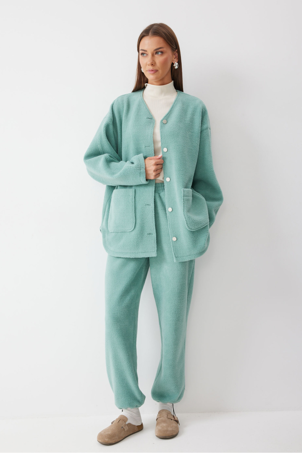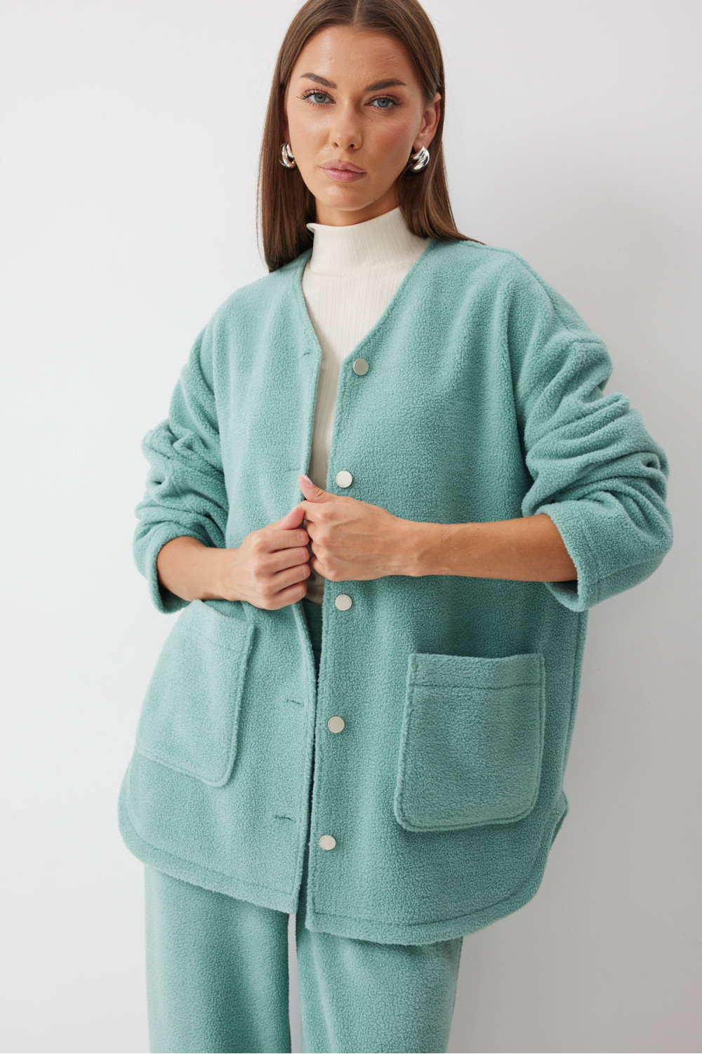 Жакет прямого силуэта с фигурным низом из трикотажного полотна. Горловина округлая, по центру застежка на кнопки. Рукав со спущенной линией плеча. По переду накладные карманы. Жакет без подкладки. Обращаем ваше внимание, что фурнитура может отличаться от фото.
