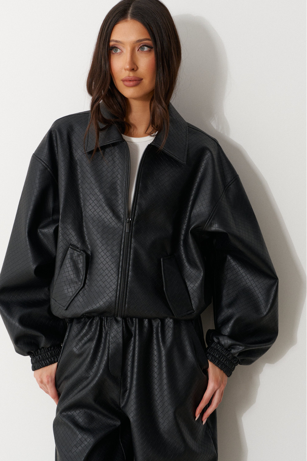 Бомбер выполнен из экокожи с теснением черного цвета цвета. Характеристики: отложной воротник, застёжка на молнии, на брендированной подкладке, по переду изделия крупные накладные карманы с клапаном, спущеный рукав заканчивается манжетом-резинкой,по низу изделия резинка.