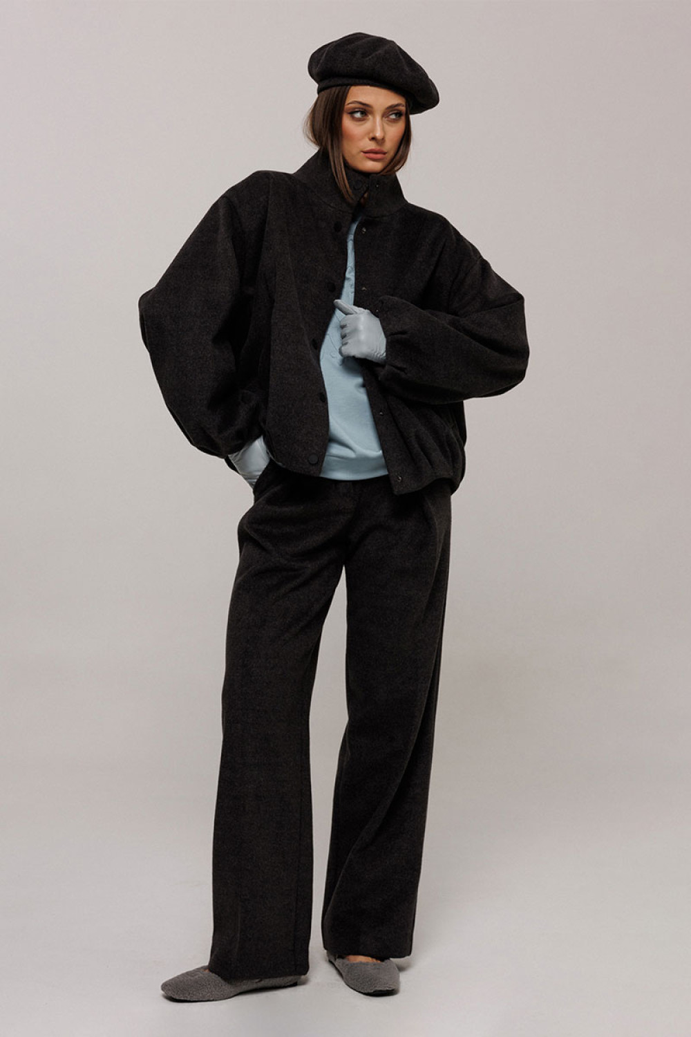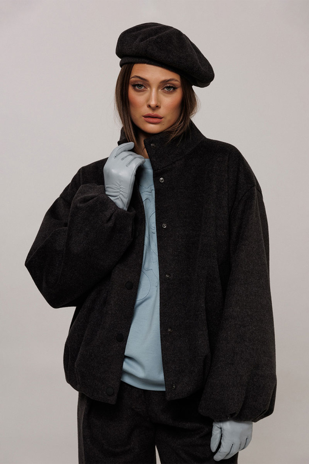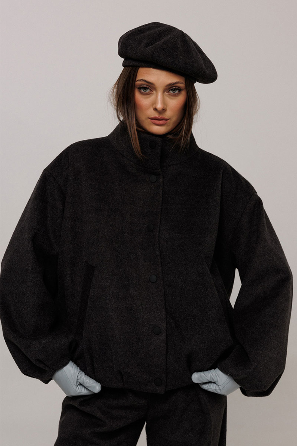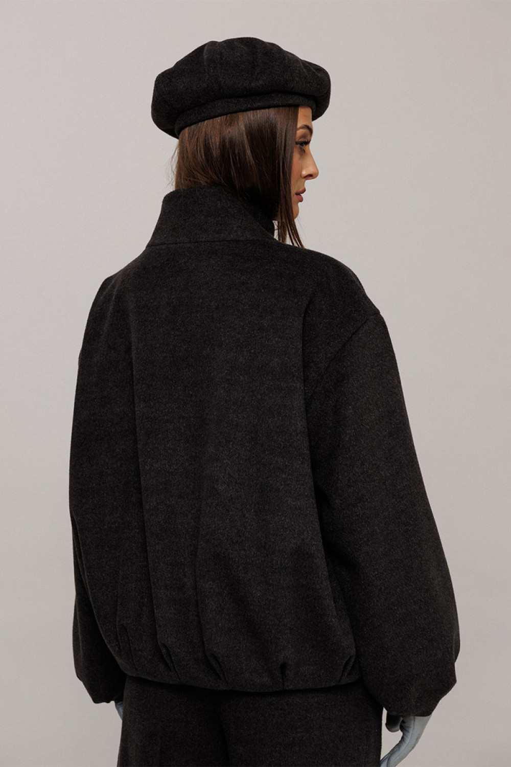 Куртка из пальтовой ткани прямого силуэта со спущенной линией плеча. Рукав втачной одношовнный внизу со складками. Полочка с центральной застежкой на кнопки и карманом-листочкой. Полочка и спинка внизу со складками. По горловине воротник-стойка с застежкой на кнопку. Куртка на подкладке.