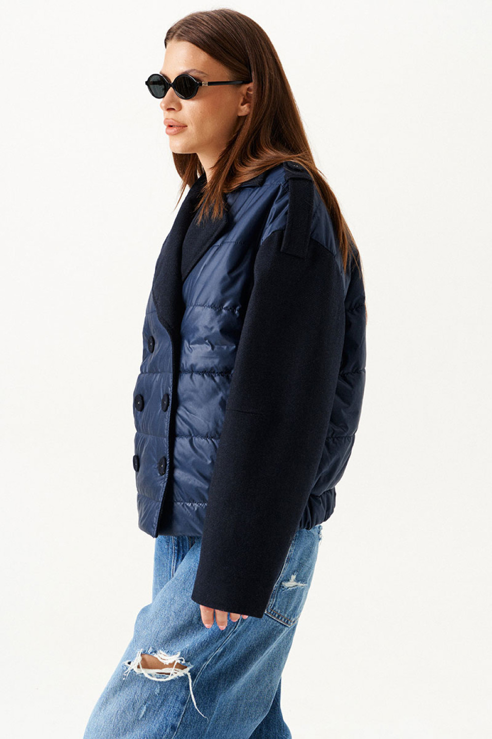 Куртка из различных материлов, прямого силуэта, со спущенной линией плеча, с центральной двубортной застежкой на петли и пуговицы, отложным воротником и лацканами пиджачного типа, на подкладке.В рельефах полочек расположены карманы. Низ спинки обработан притачным поясом на резинке. На верхней части рукава притачной погон с застежкой на прорезную петлю и пуговицу. Рукав двухшовный, длинный. Полочки и спинка из плащевой стеганной ткани с утеплителем изософт150г/м2. Воротник,лацканы, рукава, погоны из пальтовой ткани.