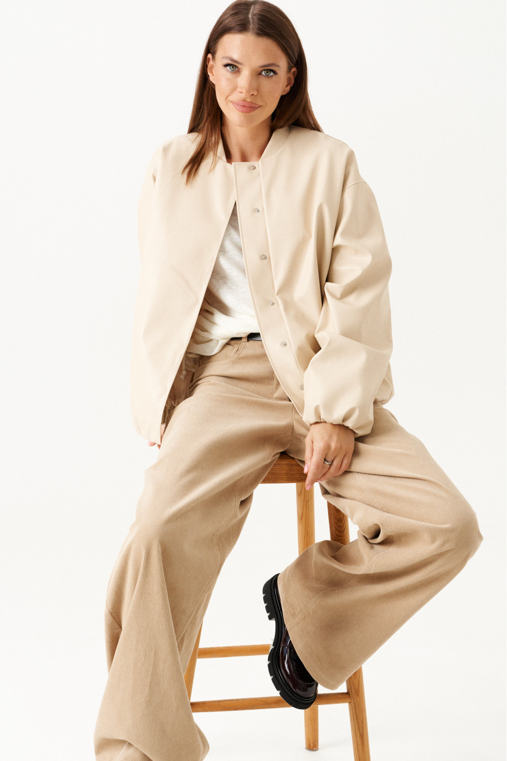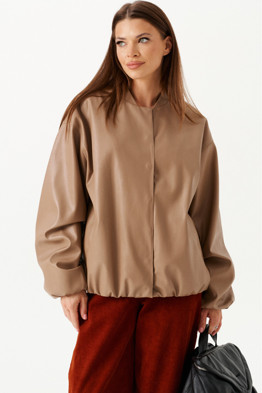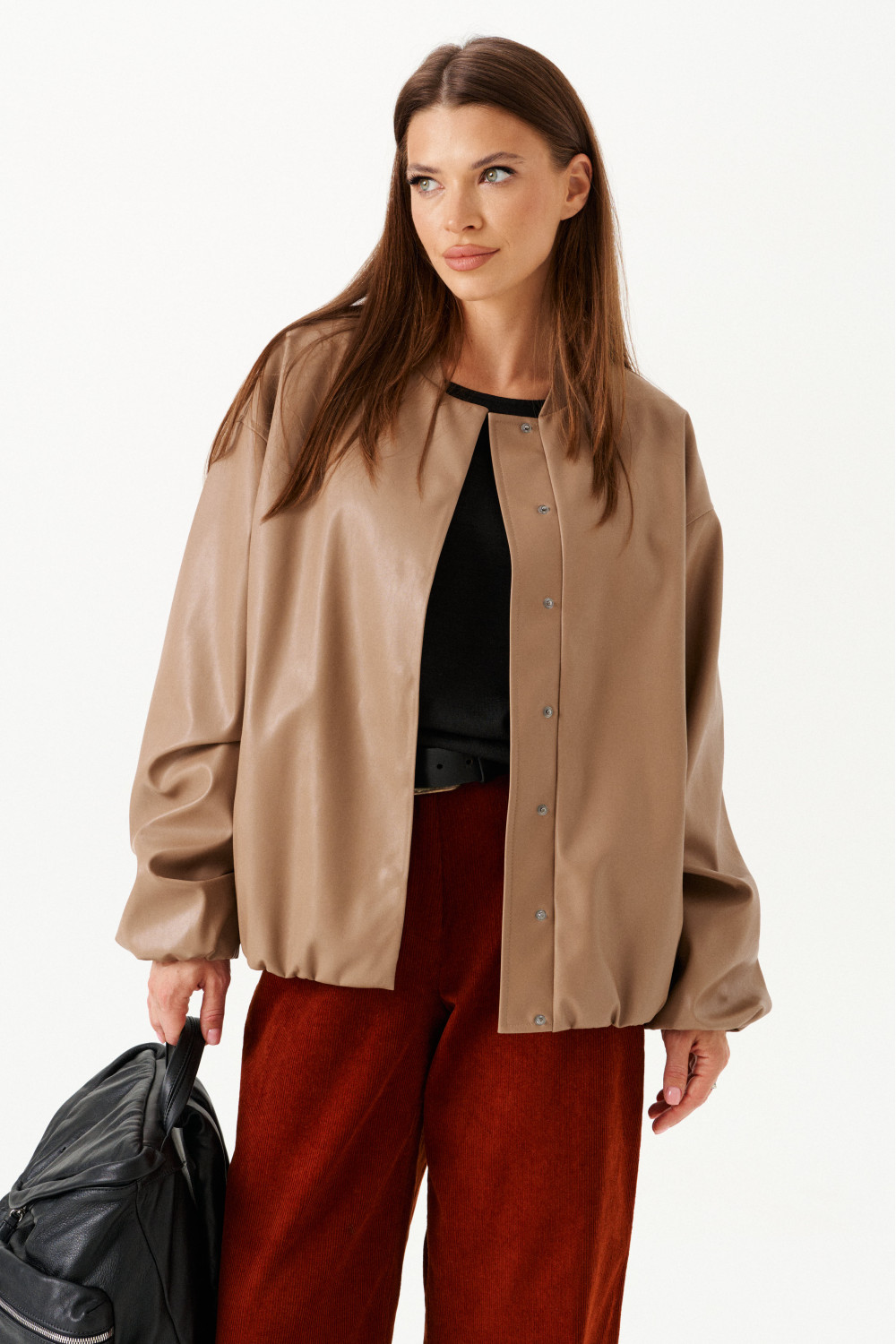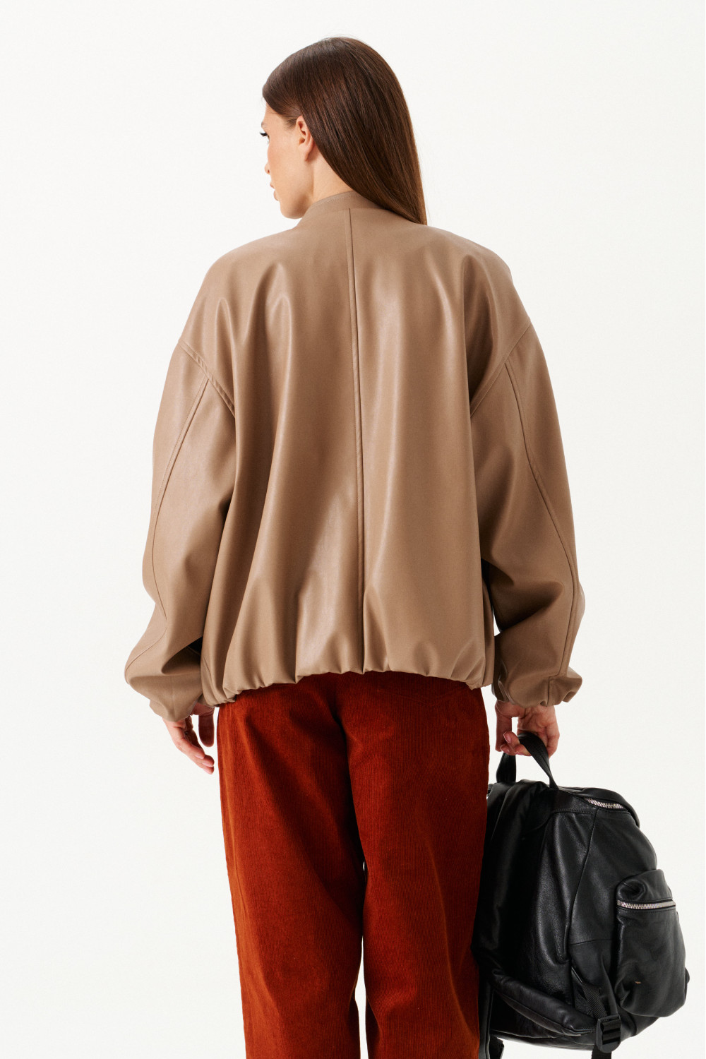 Бомбер из искусственной кожи, свободный, со спущенной линией плеча, с центральной застежкой на потайные кнопки, на подкладке. Горловина округлой формы с воротником-стойкой. Детали переда с прорезными карманами с листочкой. Спинка со средним швом. Рукав втачной, двухшовный.