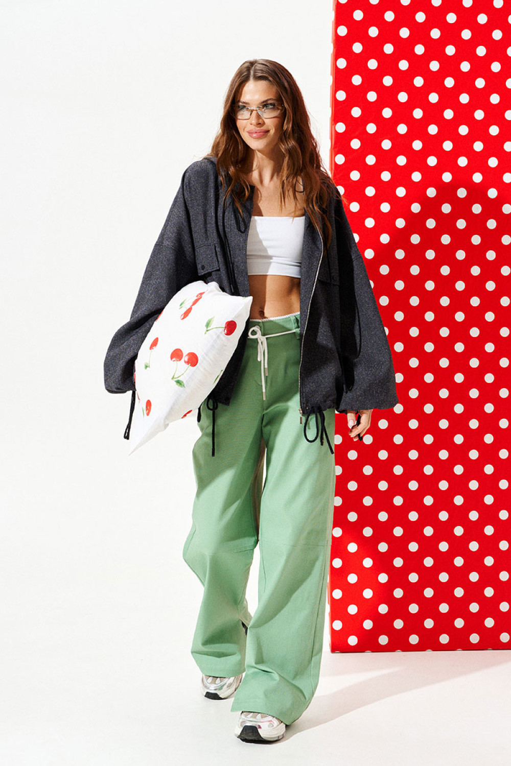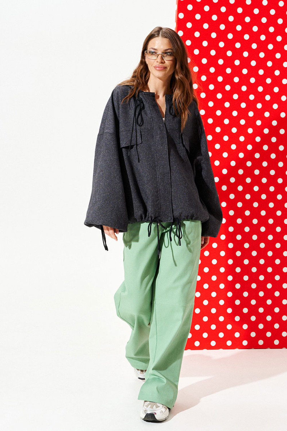 Куртка свободного объема, прямого силуэта, с центральной застежкой на тесьму-молнию и кнопки на притачной планке, с капюшоном, на подкладке. Детали переда с отрезной кокеткой и нагрудными накладными клапанами. Спинка с отрезной кокеткой и средним швом. В боковых швах расположены карманы. Рукав втачной одношовный, длинный. Нижний срез рукава с эластичной тесьмой. Низ изделия, капюшон, нижний срез рукава оформлены кулиской со шнуром-завязкой и наконечниками.