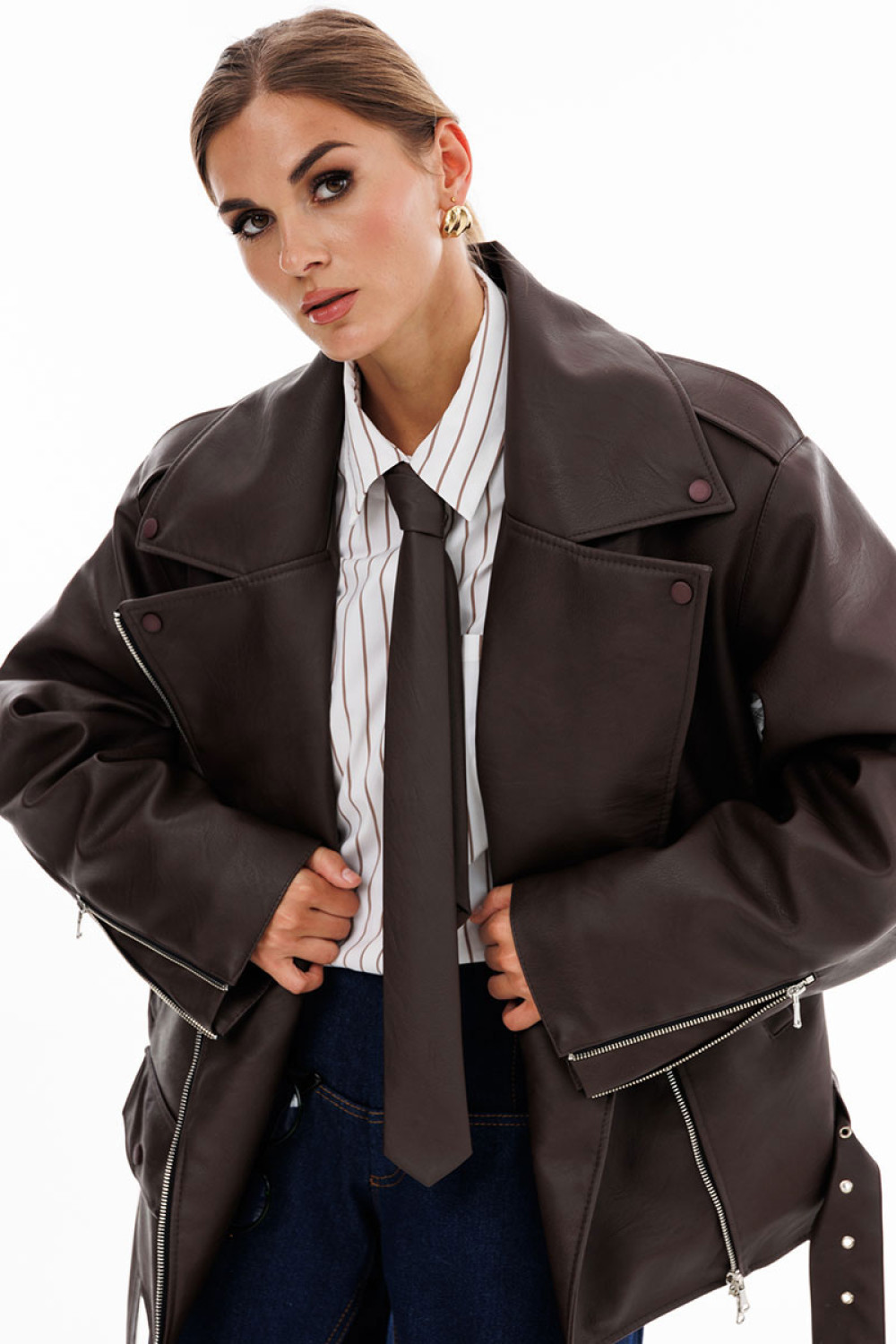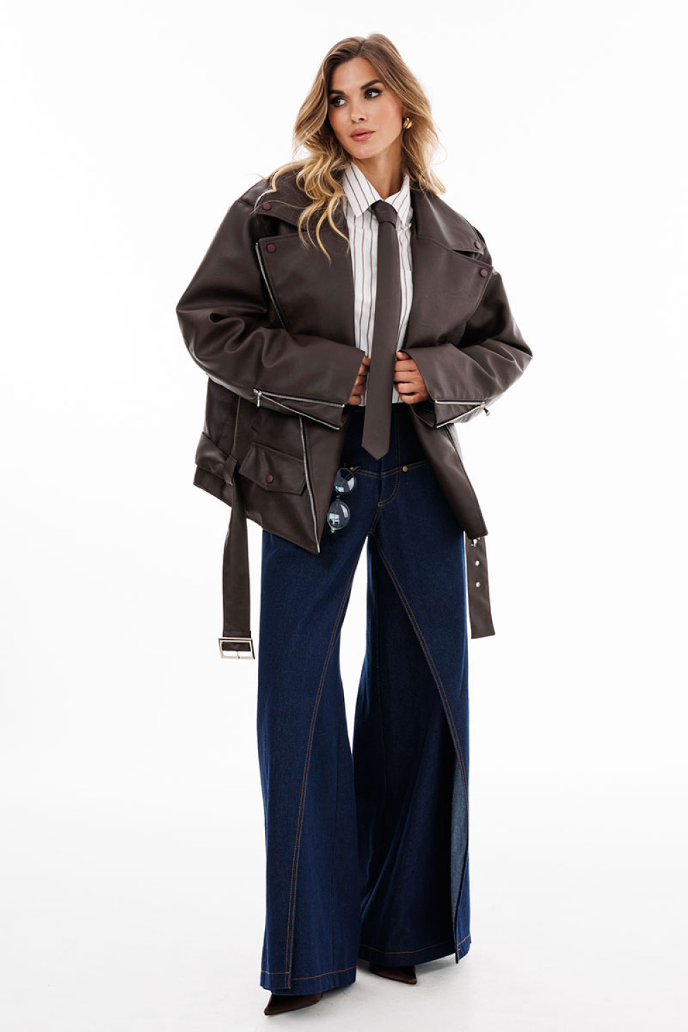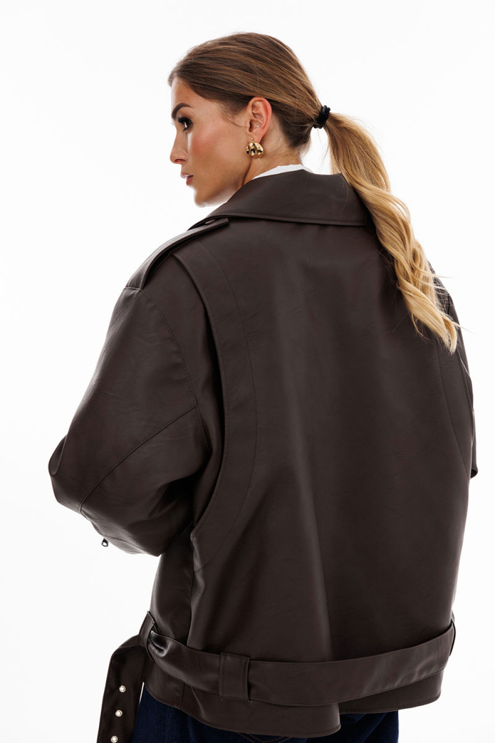 Куртка выпонена из экокожи. Куртка прямого силуэта, покроя "oversize". Спереди прорезные карманы, лацканы, один клапан справа, и смещенная застежка на молнию. На спинке фигурные подрезы от плечевого шва до боковых. Вортник пиджачного типа. Плечевой шов удлинен. Рукав рубашечного покроя, двухшовный. В заднем шве рукава молния с металлическими звеньями. В окаты вставлены погоны, по низу куртки протянут пояс из основной ткани с металлической пряжкой. На концах воротника, лацконов, по погонам и клапану пробивные кнопки. Куртка на утепленной притачной по низу подкладке.