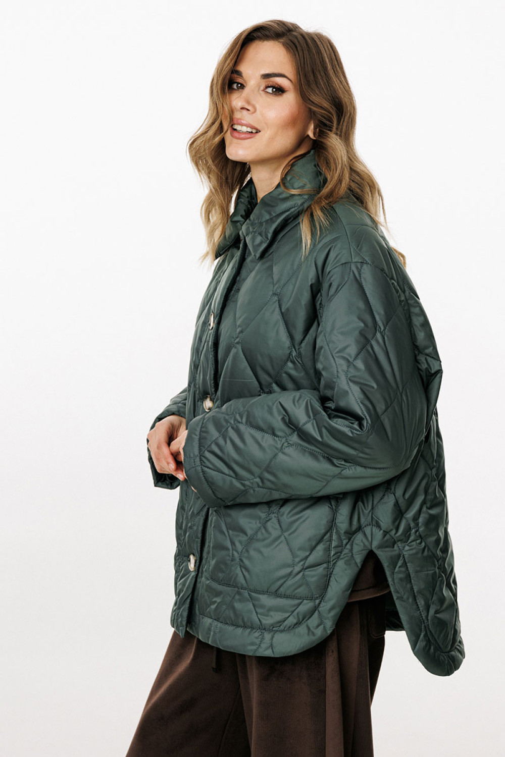 Куртка выполнена из плащевой ткани, простеганной с Isosoft. Куртка прямого силуэта, длиной до линии бедер. Застежка центральная бортовая на пришивные пуговицы. Спереди накладные карманы с клапанами. Спинка цельная. Воротник стояче-отложной. Рукав втачной, двухшовный. Плечевой шов спущен. Пройма углублена. Спинка длиннее переда. В боковых швах фигурные разрезы.