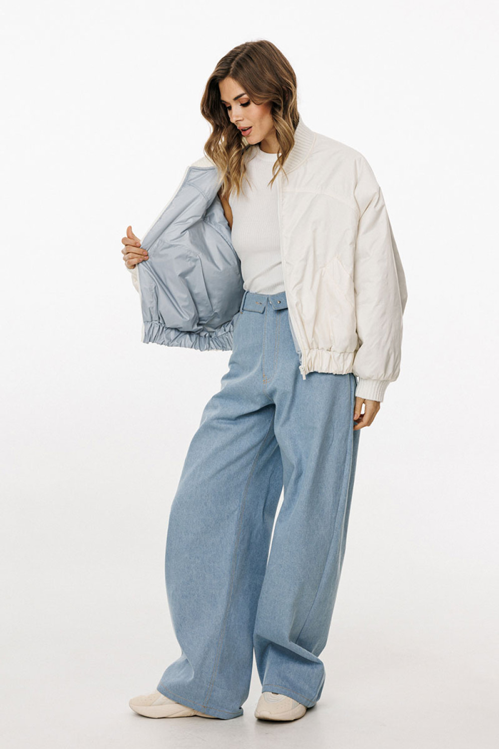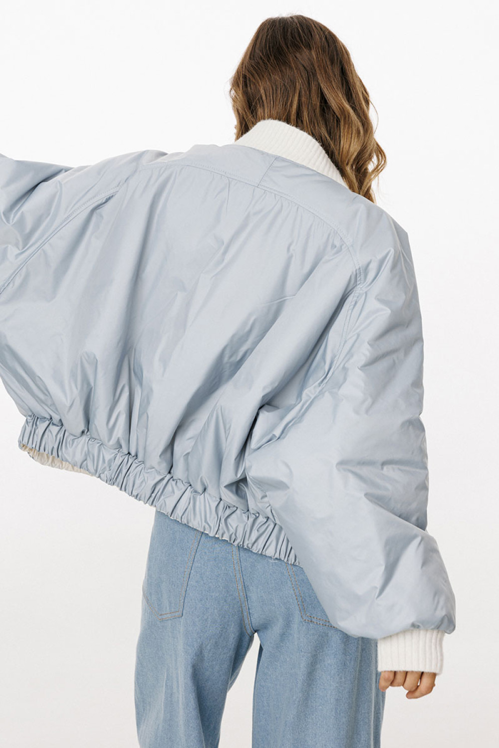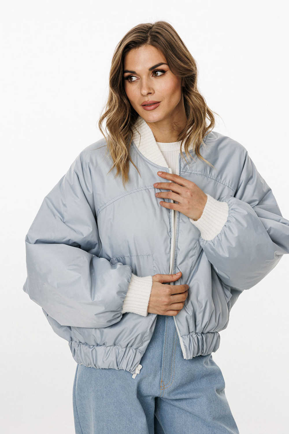 Куртка выполнена из плащевой ткани с утеплителем Isosoft. Куртка О-образного силуэта, длиной выше линии бедер. Куртка двусторонняя. Спереди застежка на молнию и карманы. Рукав покроя кимоно переходящий в кокетки спереди и по спинке. Низ рукава на притачной манжете из трикотажного довяза. Горловина округлой формы с вортником-стойкой из трикотажного довяза. Низ куртки на притачном поясе с эластичной тесьмой внутри. Одна из сторон куртки декорирована на спинке нашивкой из натуральной кожи.