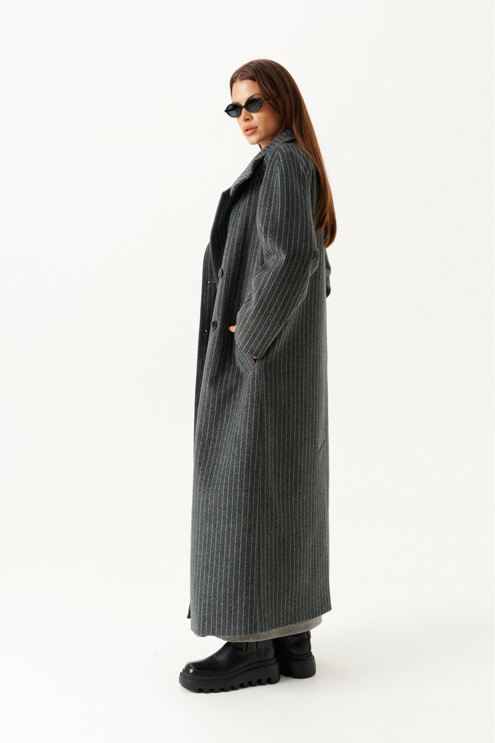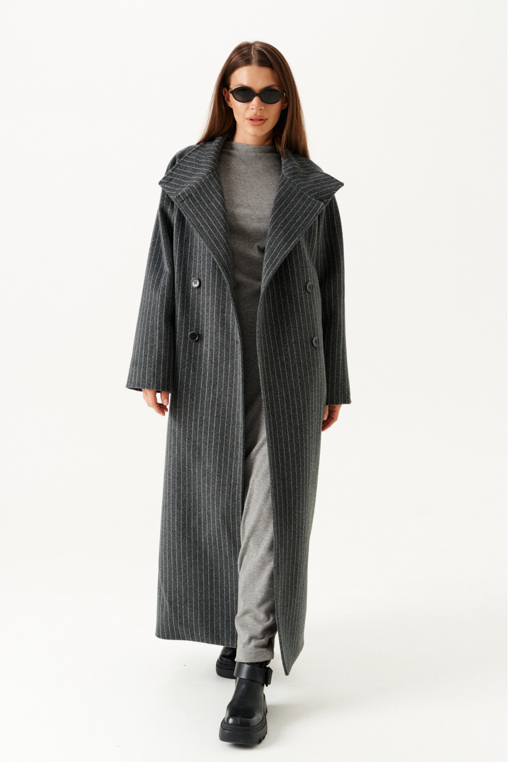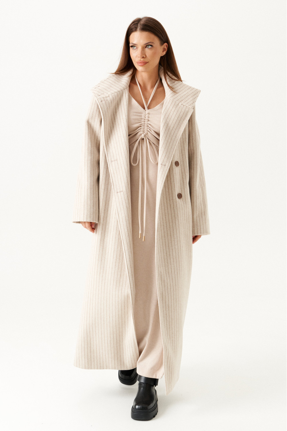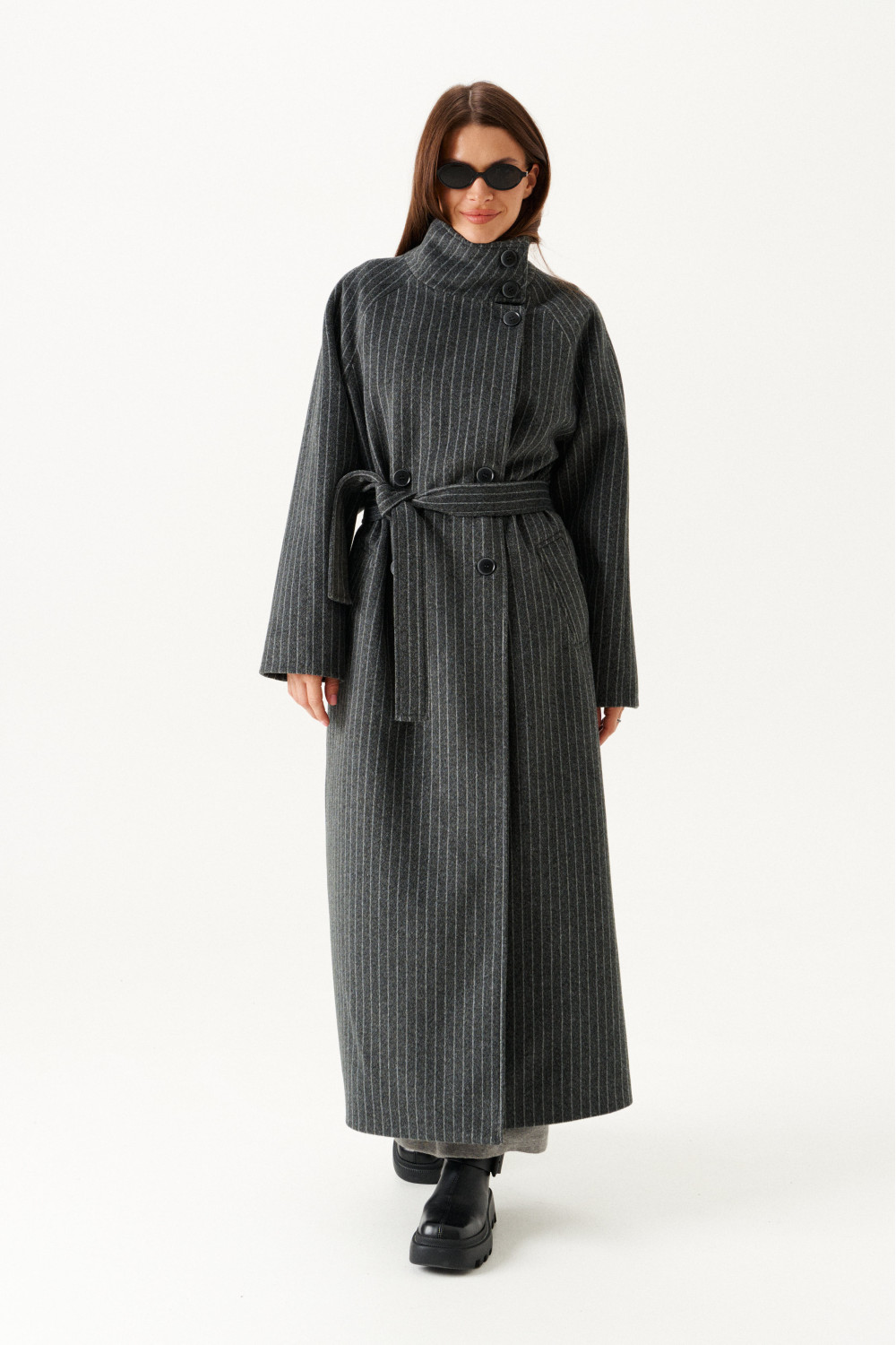 Пальто из трикотажного полотна прямого силуэта, с центральной двубортной застежкой на петли и пуговицы, на подкладке. Воротник – стойка с застежкой на петли и пуговицы. Полочки с прорезными карманами с листочкой. Спинка со средним швом и шлицей. Рукав – реглан. В комплекте пояс из основной ткани.