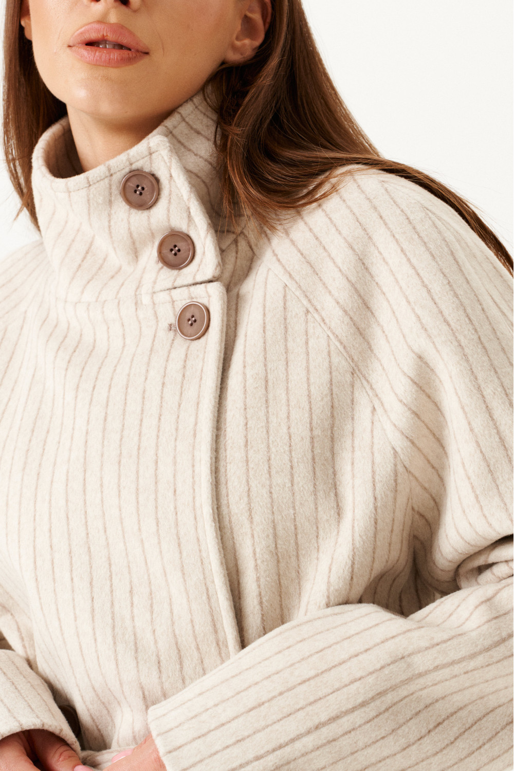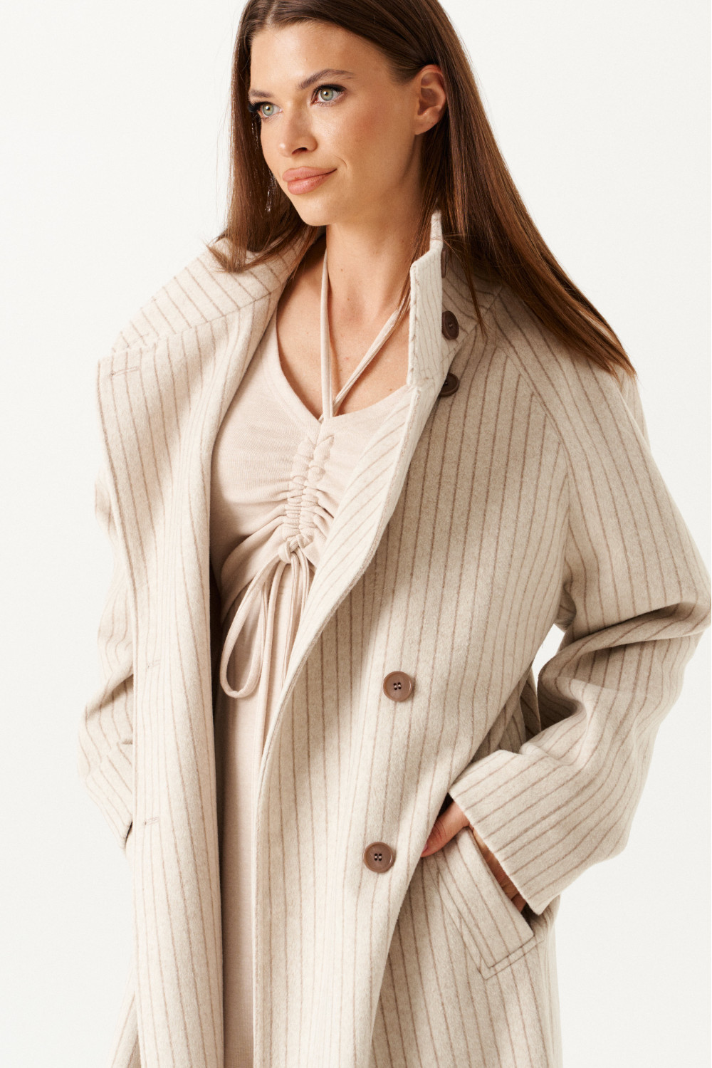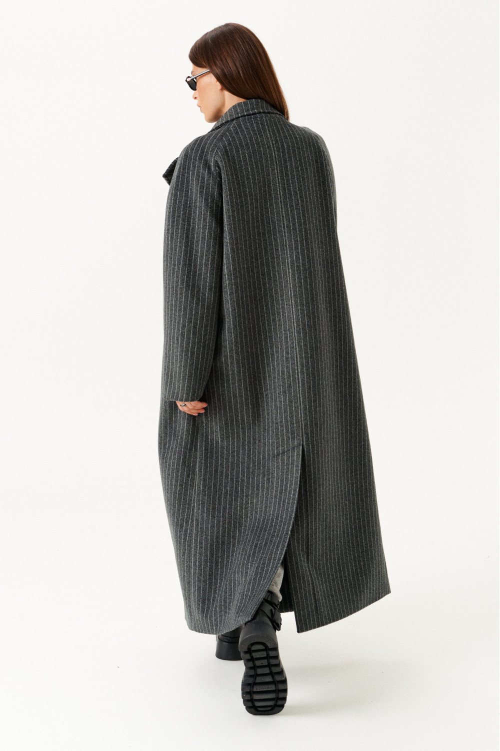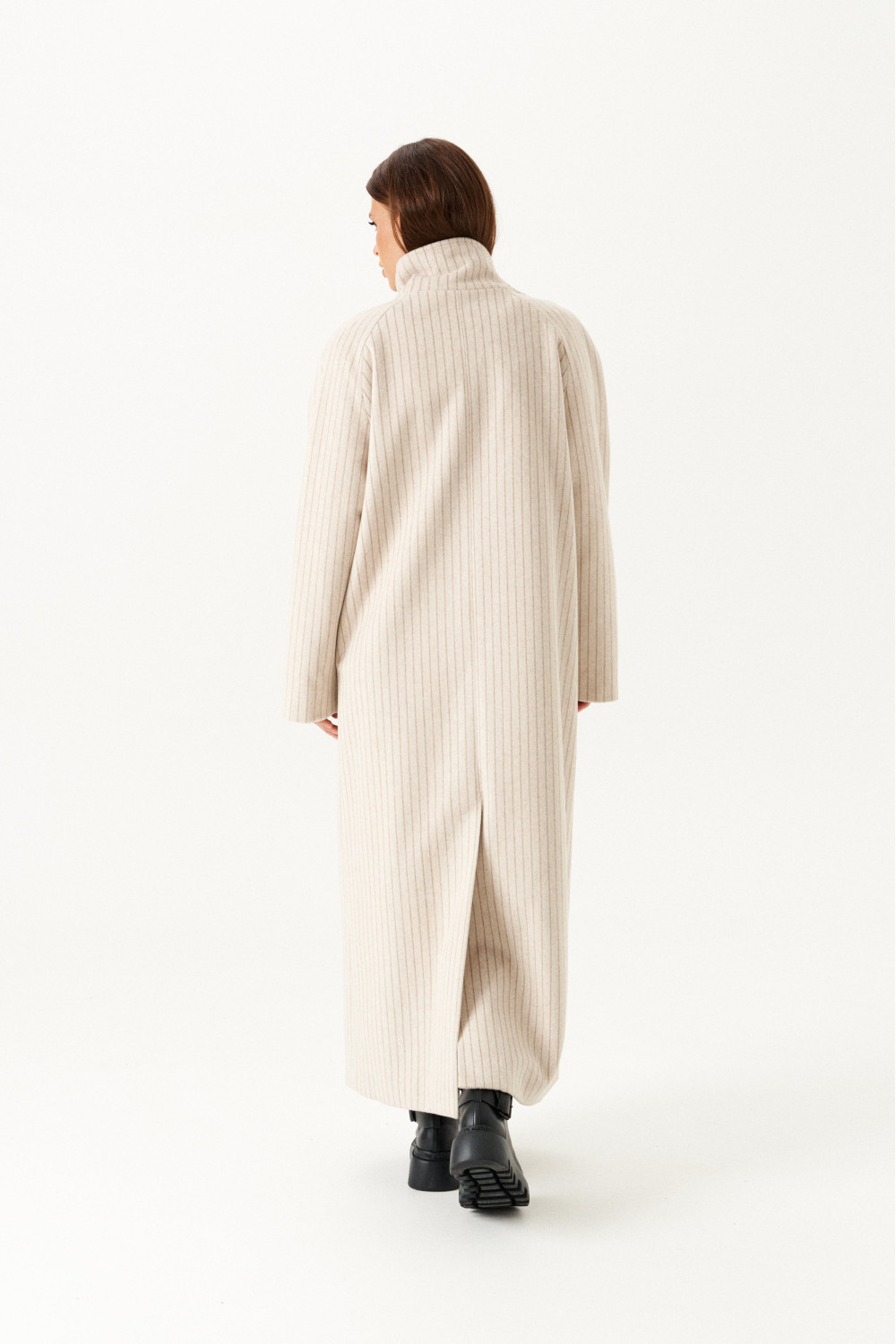 Пальто из трикотажного полотна прямого силуэта, с центральной двубортной застежкой на петли и пуговицы, на подкладке. Воротник – стойка с застежкой на петли и пуговицы. Полочки с прорезными карманами с листочкой. Спинка со средним швом и шлицей. Рукав – реглан. В комплекте пояс из основной ткани.