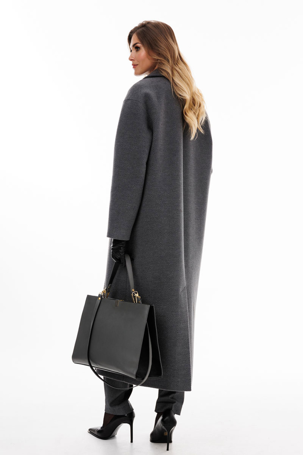 Пальто выполнено из пальтовой ткани в рубчик. Пальто прямого силуэта, длиной до середины икры. Спереди застежка двубортная на пришивные кнопки, горизонтальные прорезные карманы. Спинка со средним швом со шлицей по низу. Воротник пиджачного типа. Плечевой шов спущен. Рукав одношовный. Пальто на притачной по низу подкладке.
