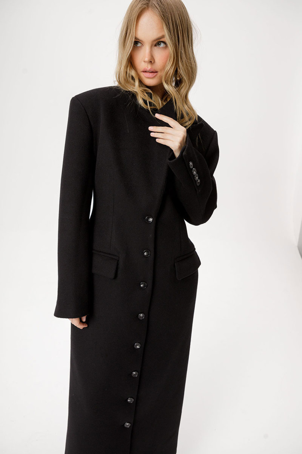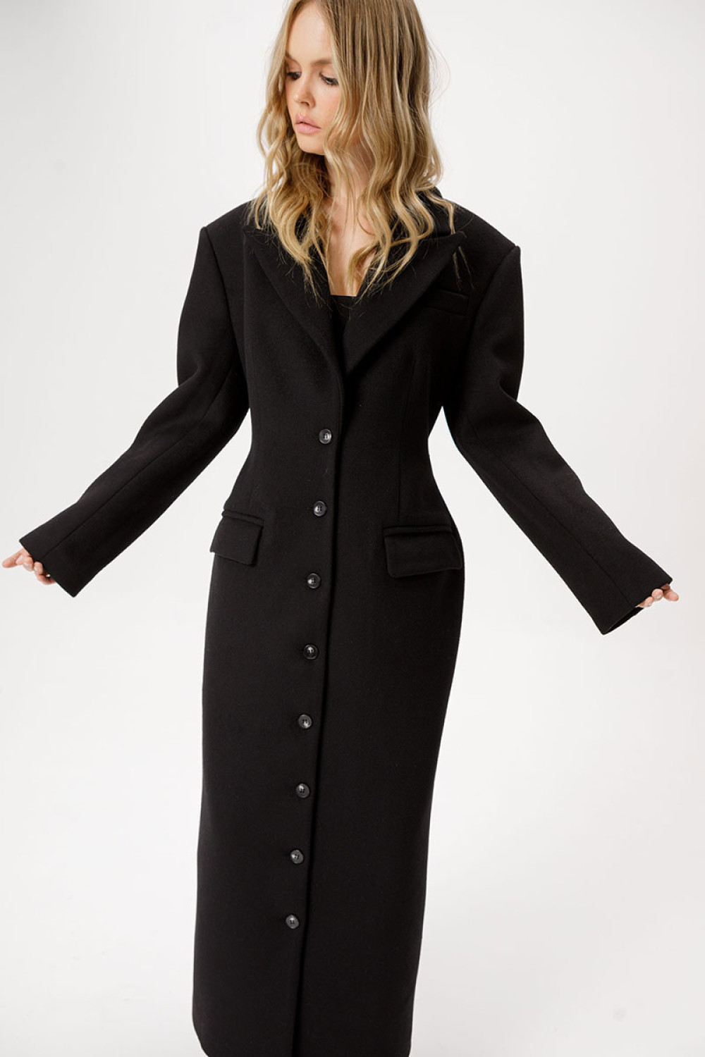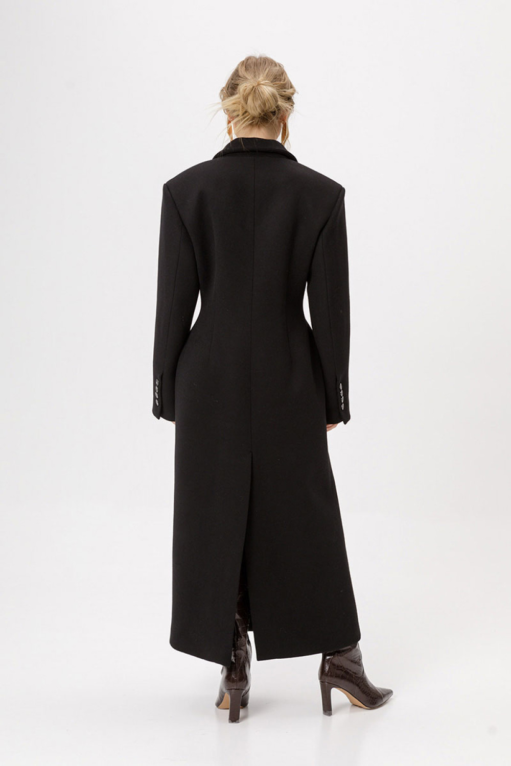 Приталенное шерстянное пальто длины макси.