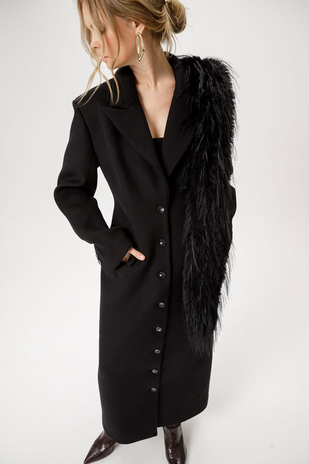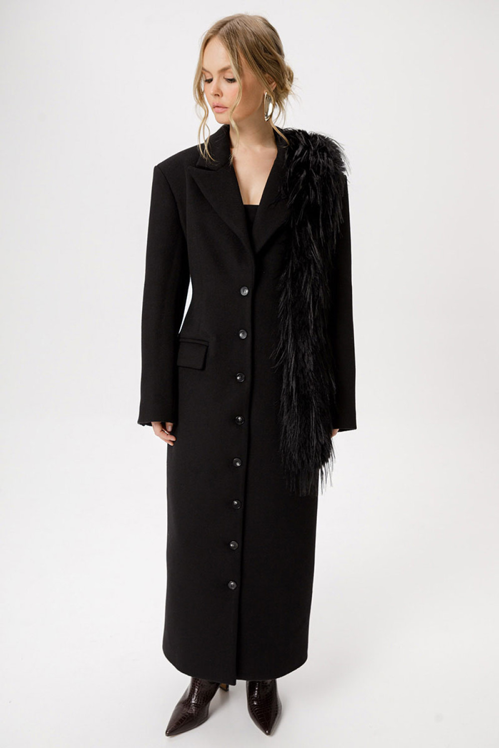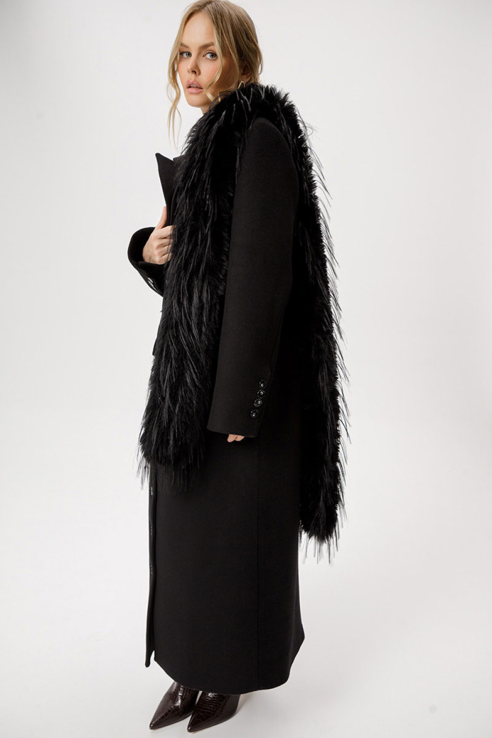 Приталенное шерстянное пальто длины макси.