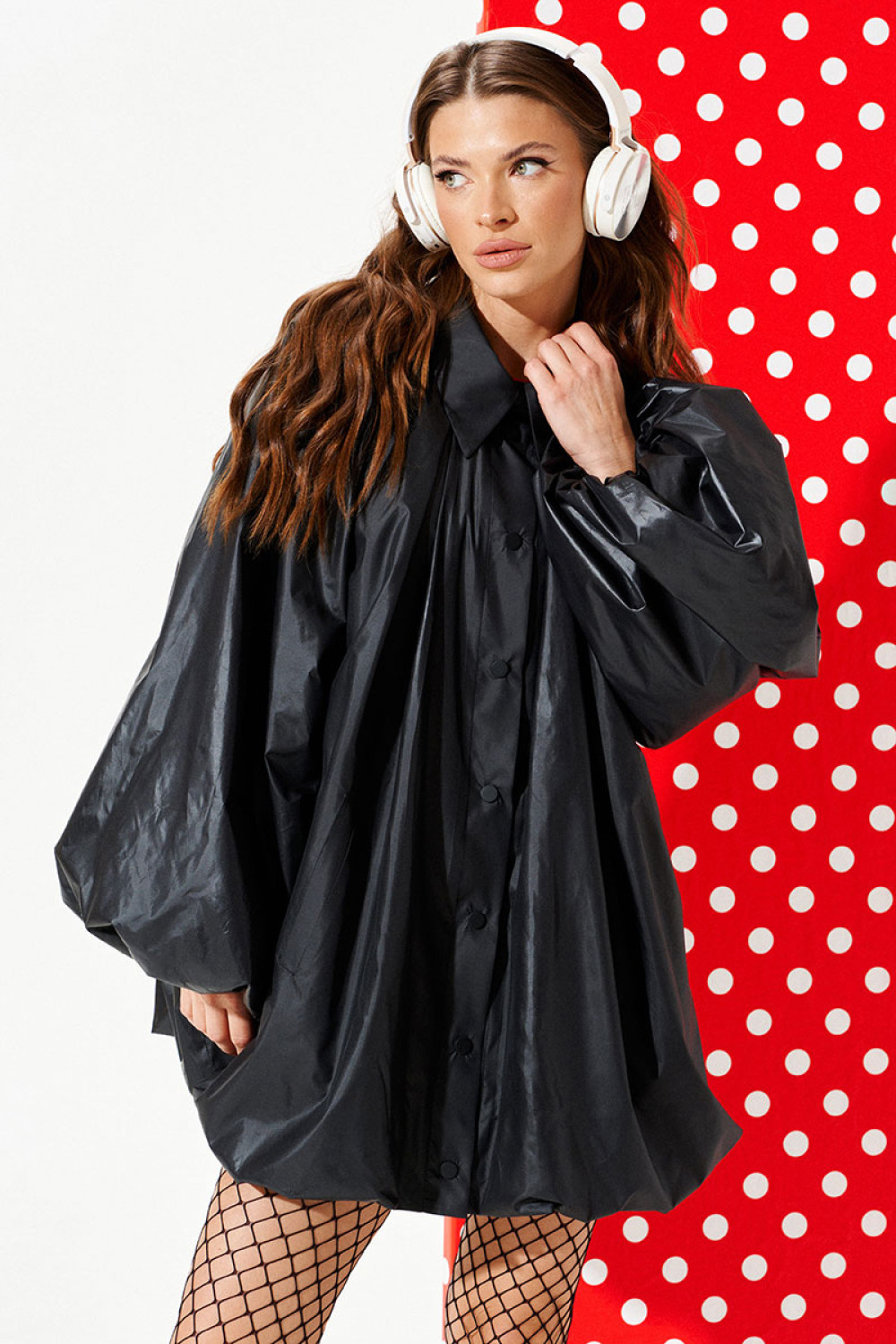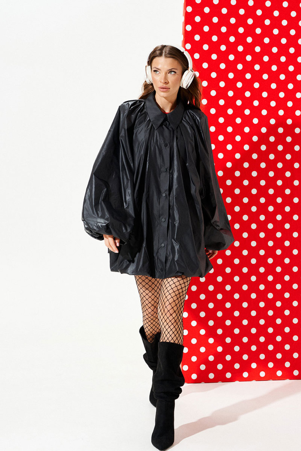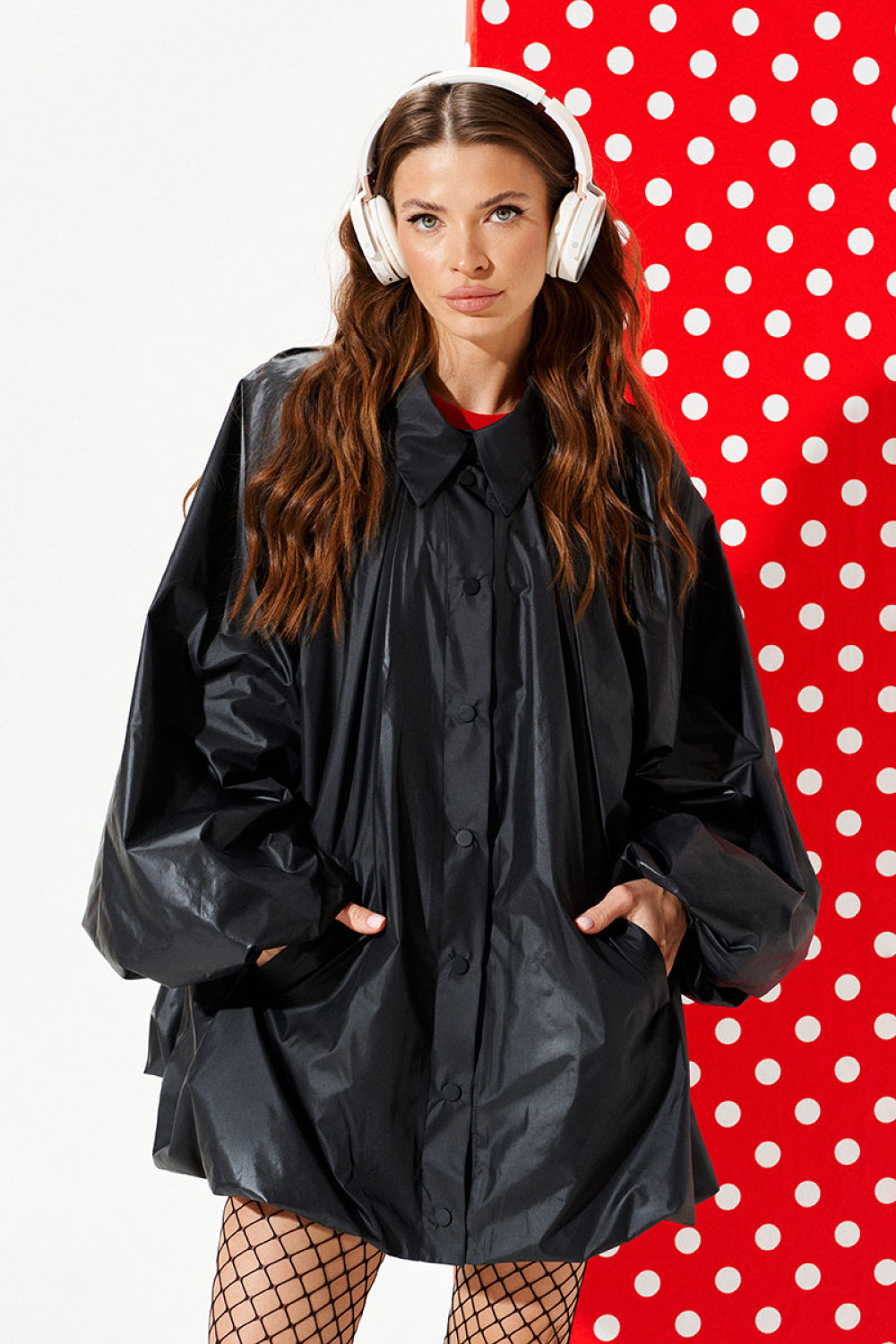 Плащ из курточно-плащевой ткани свободного объема, расширенный к низу, с центральной застежкой на кнопки, отложным воротником, на подкладке. На деталях переда расположены прорезные карманы с листочкой. Спинка цельная. Детали переда, спинка и рукав со встречными складками. Рукав покроя реглан. Нижний срез изделия и рукавов обработан эластичной тесьмой.