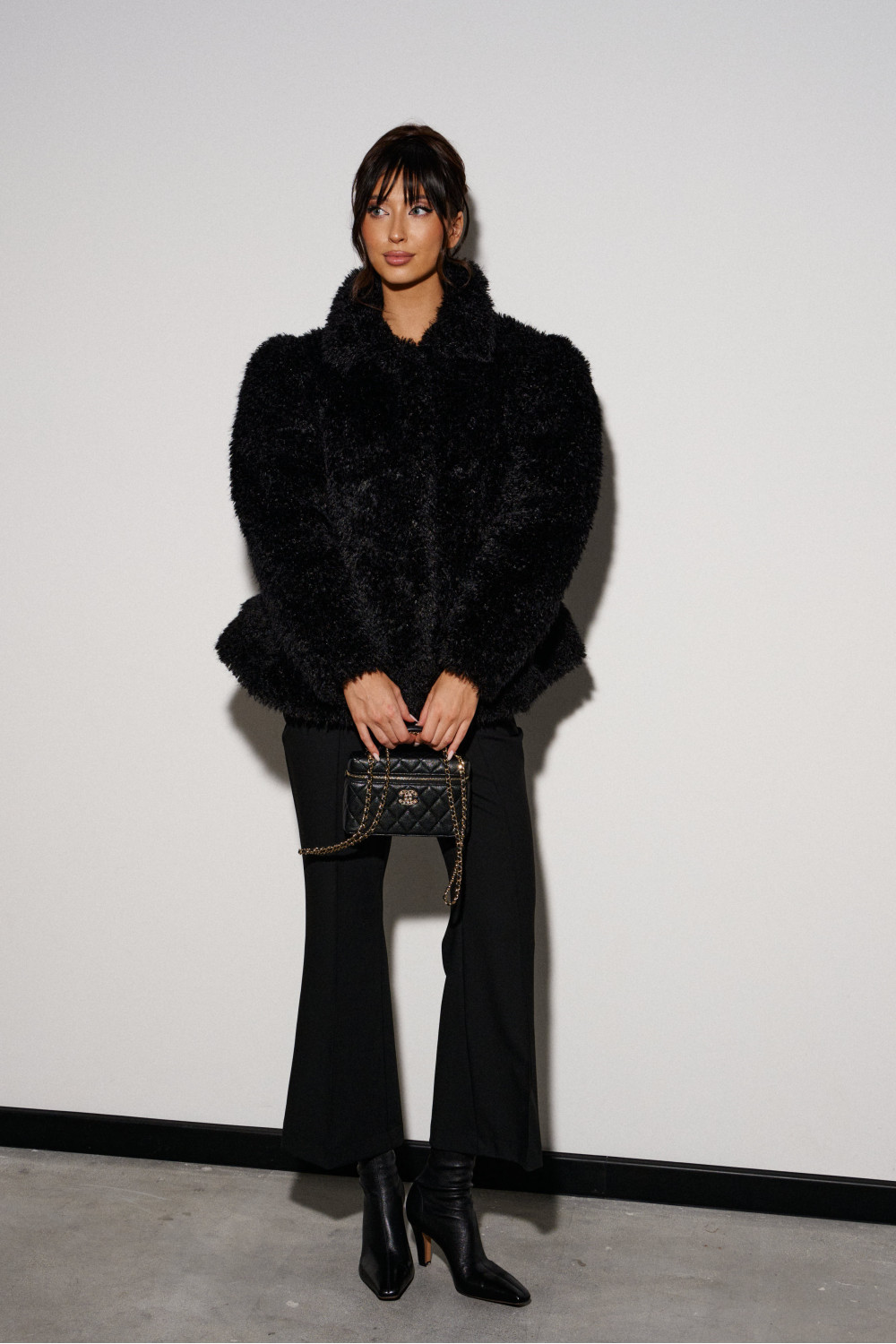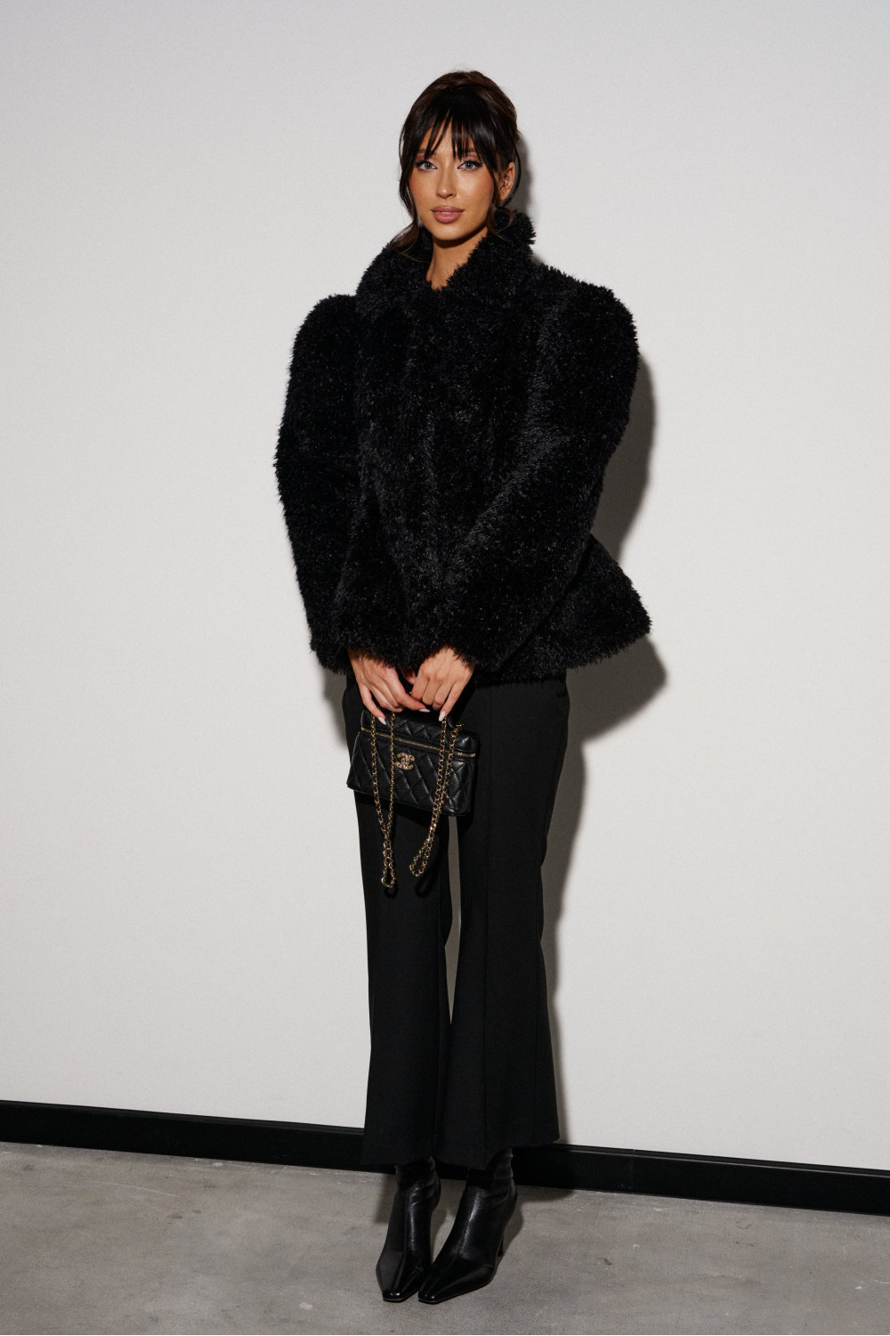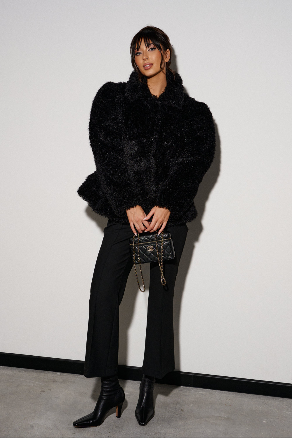Шубка приталенного силуэта, выполнена из полотна с длинным черным ворсом. Характеристика: прилаталенный силуэт, расклешенный низ. Воротник стойка, рукав втачной, застежка центарльная на потойные крючки. В боковых швах карманы. Подкладка с утеплением.
