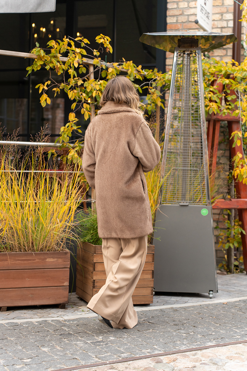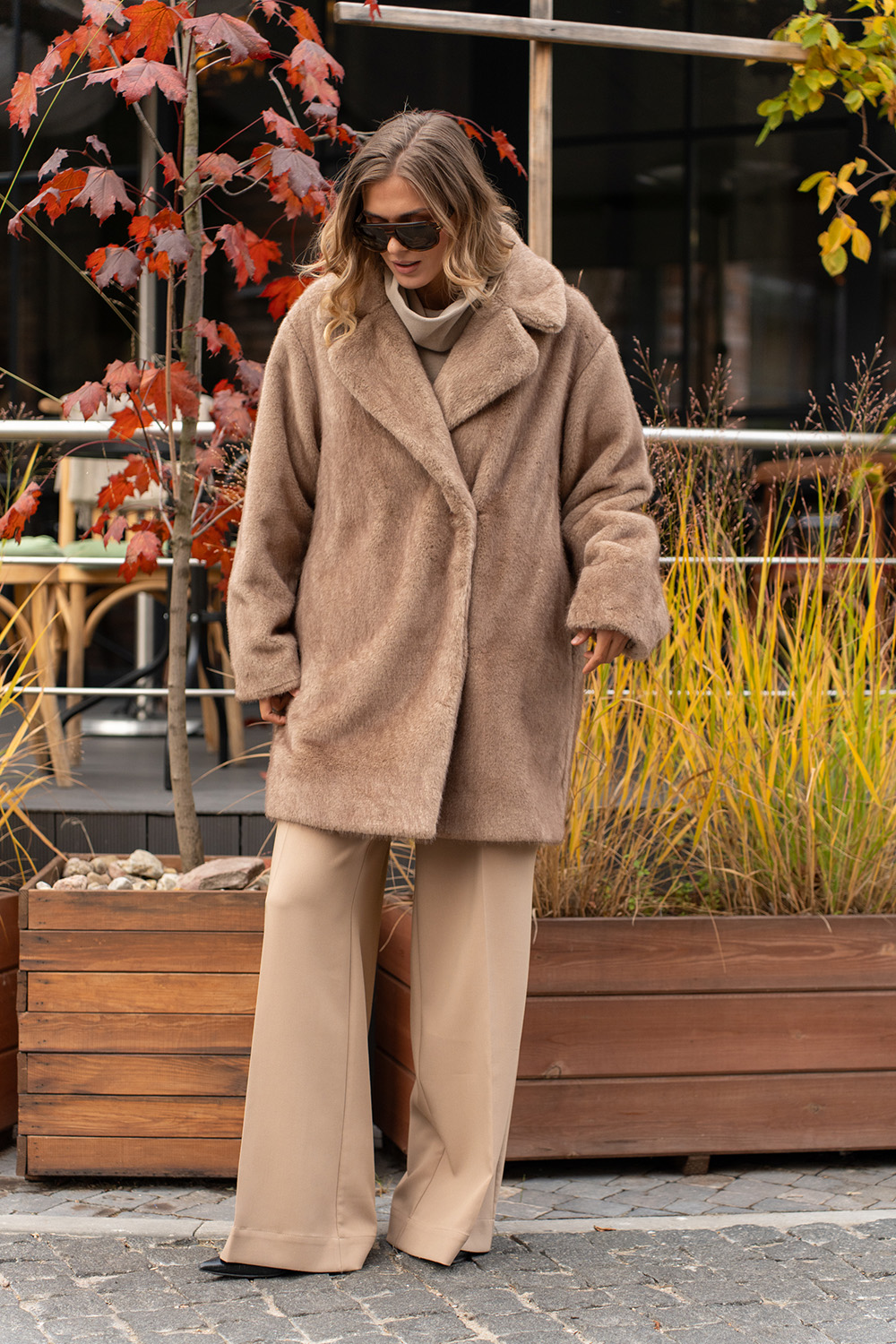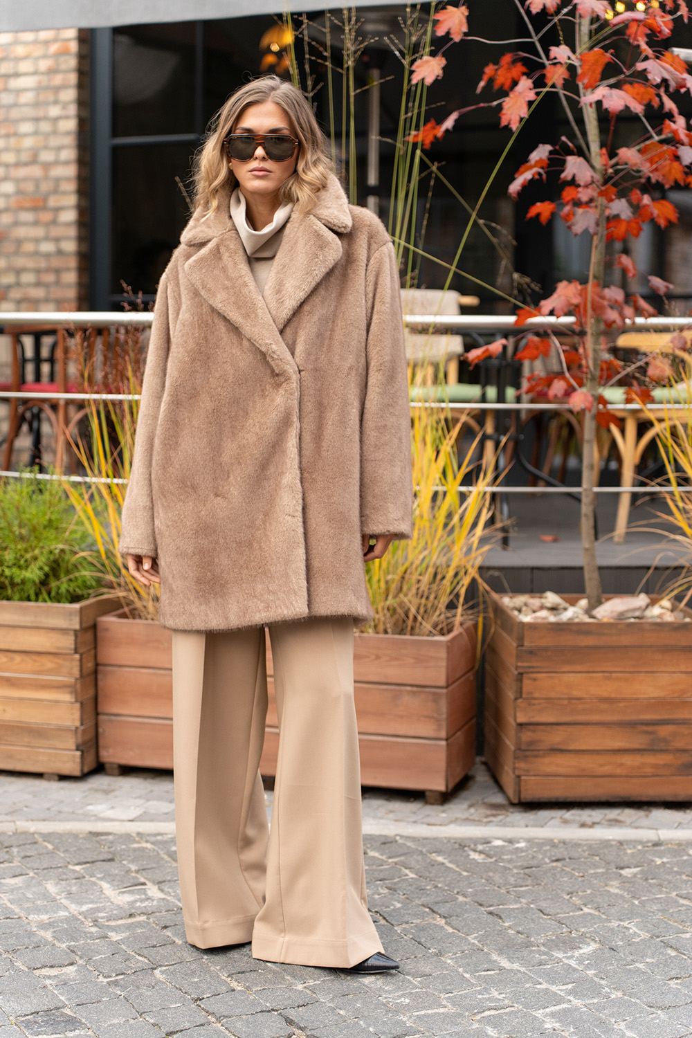 Пальто женское ( шуба ) из эко-меха "норка", прямого кроя, на поливискозной подкладке. Карманы в боковых швах. Воротник с отложным лацканом. Линия плеча слегка спущена, рукав прямой. Застежка двухбортная на пришивных кнопках.