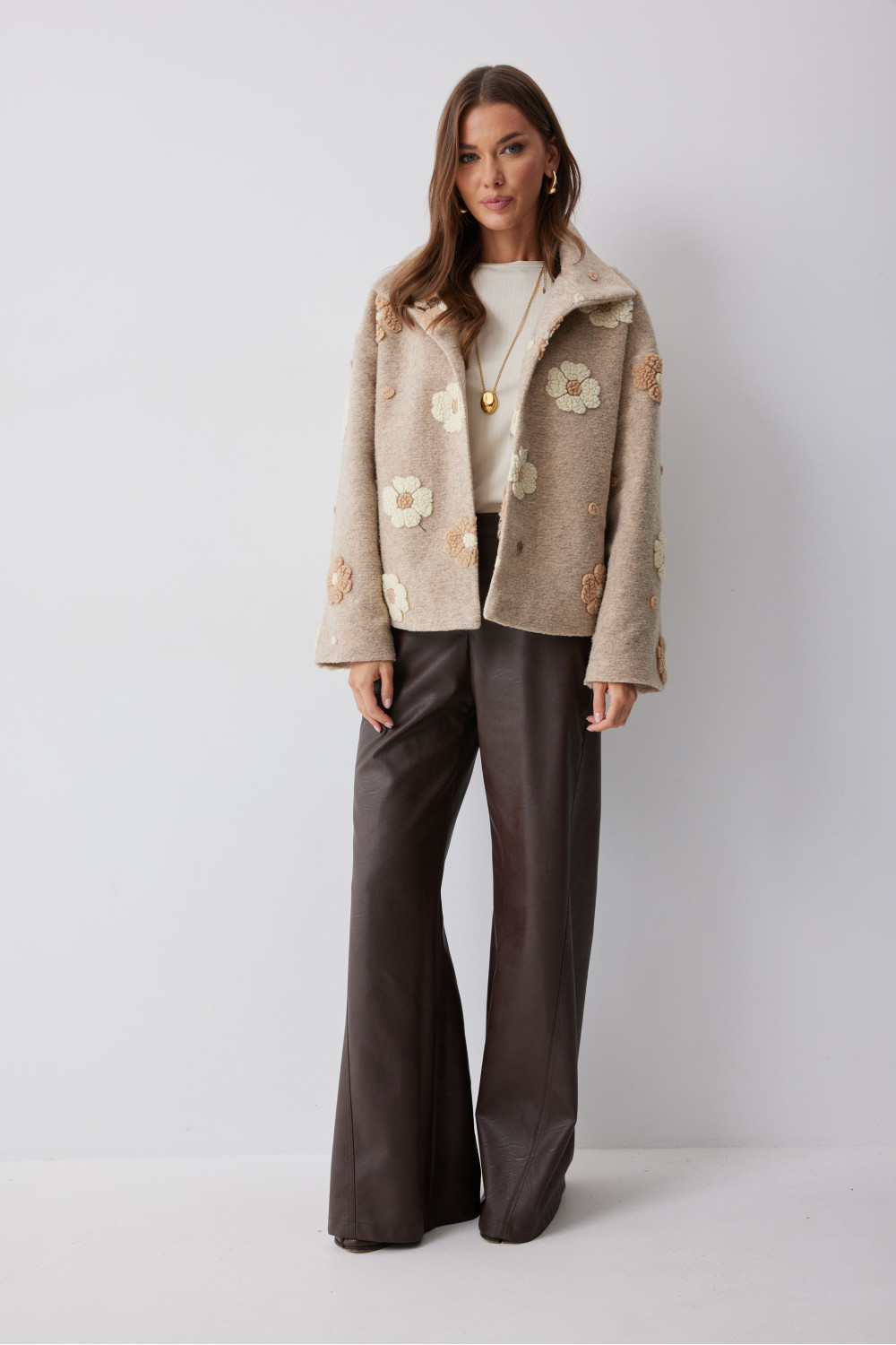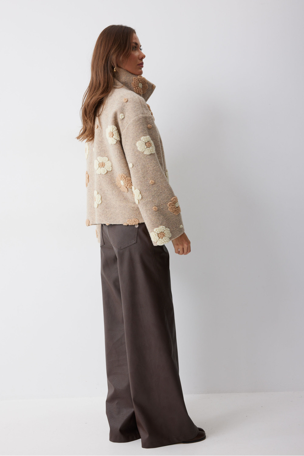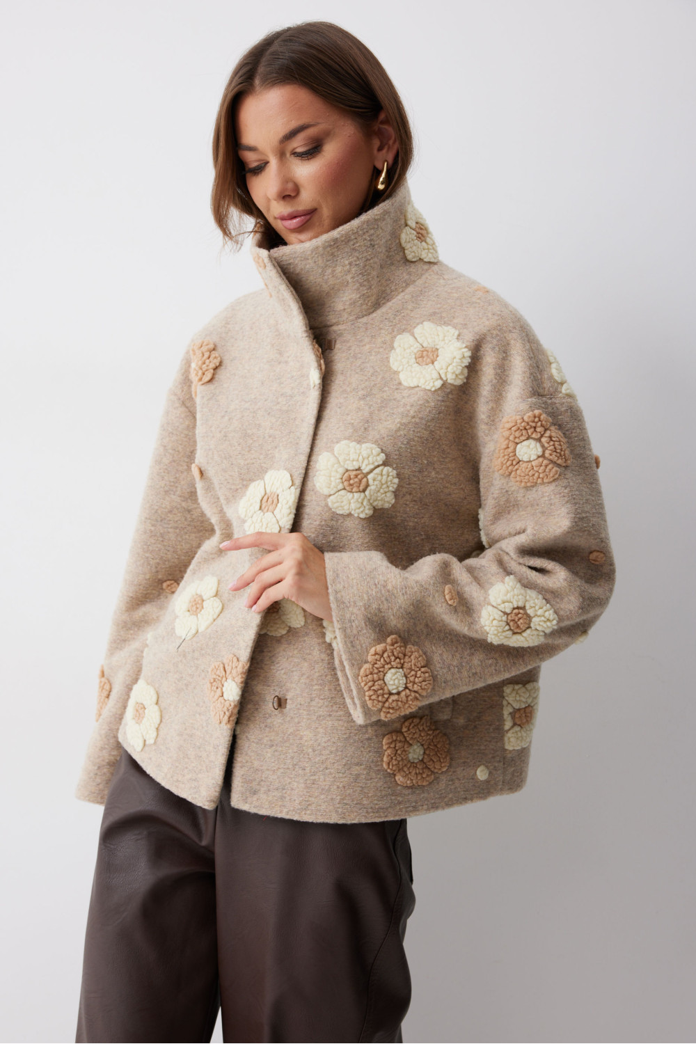 Жакет прямого силуэта из букле на трикотажной основе. Воротник-стойка. Центральная застежка на крючки. Рукав со спущенной линией плеча. По переду прорезные карманы. Жакет на подкладке. Обращаем ваше внимание, что фурнитура может отличаться от фото.