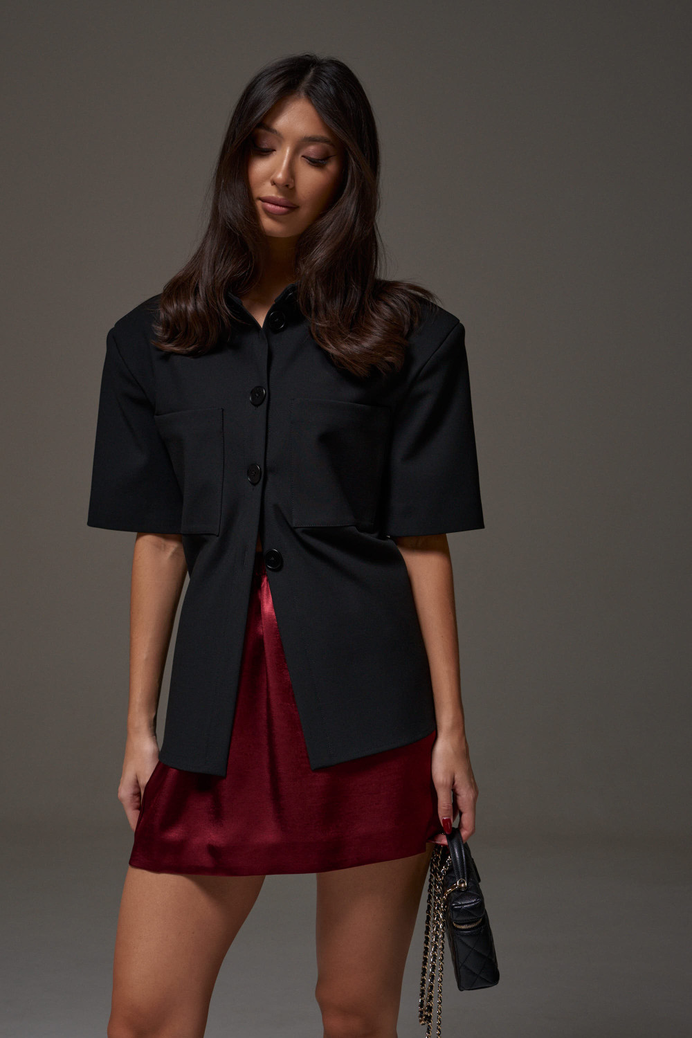 Юбка прямого кроя, выполнена из струящейся ткани бордового цвета. Характеристики: прямой крой, на подкладке, пояс на резинке.
