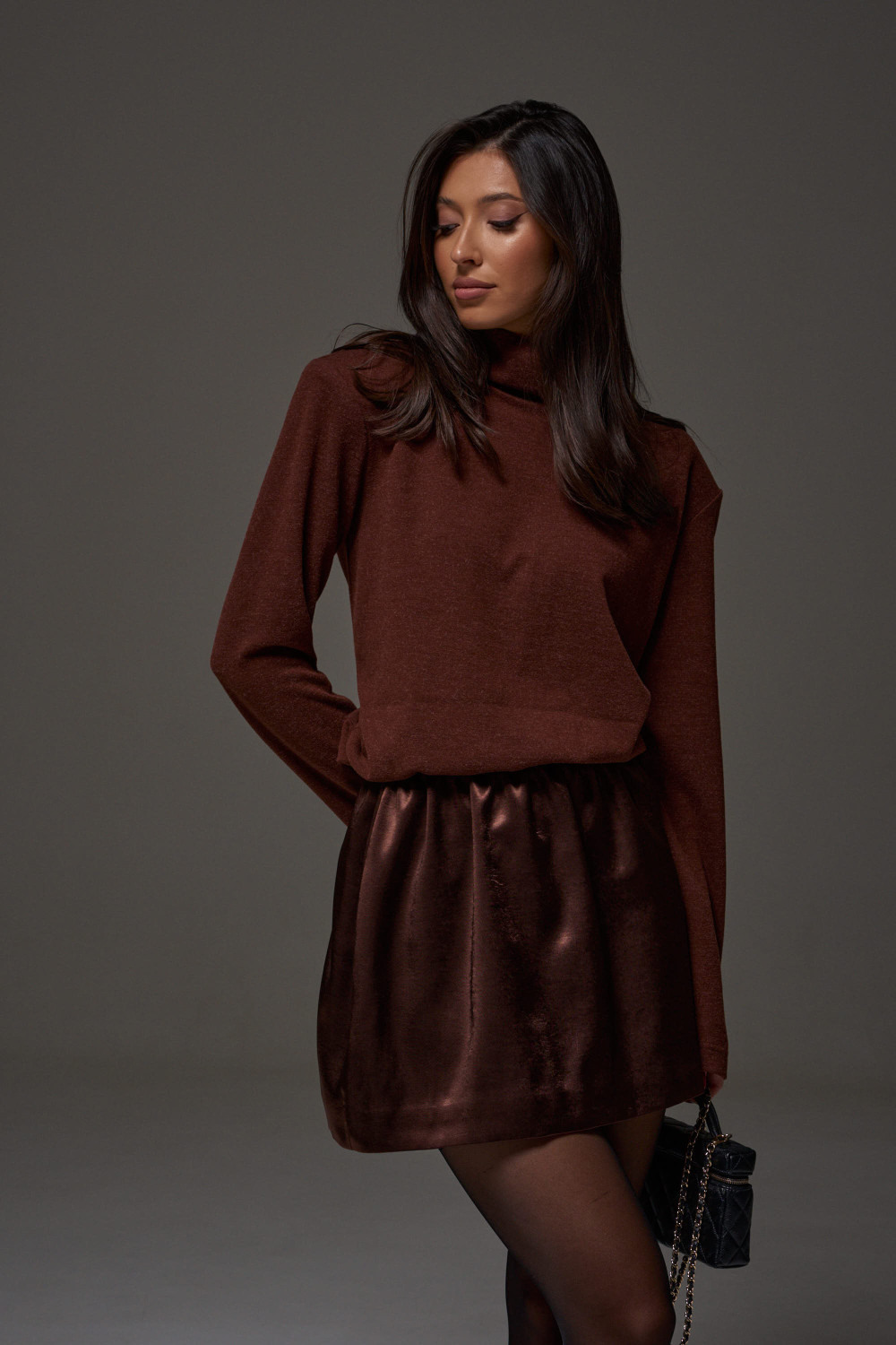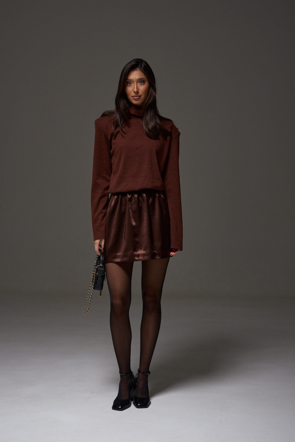 Юбка прямого кроя, выполнена из струящейся ткани коричневого цвета. Характеристики: прямой крой, на подкладке, пояс на резинке.