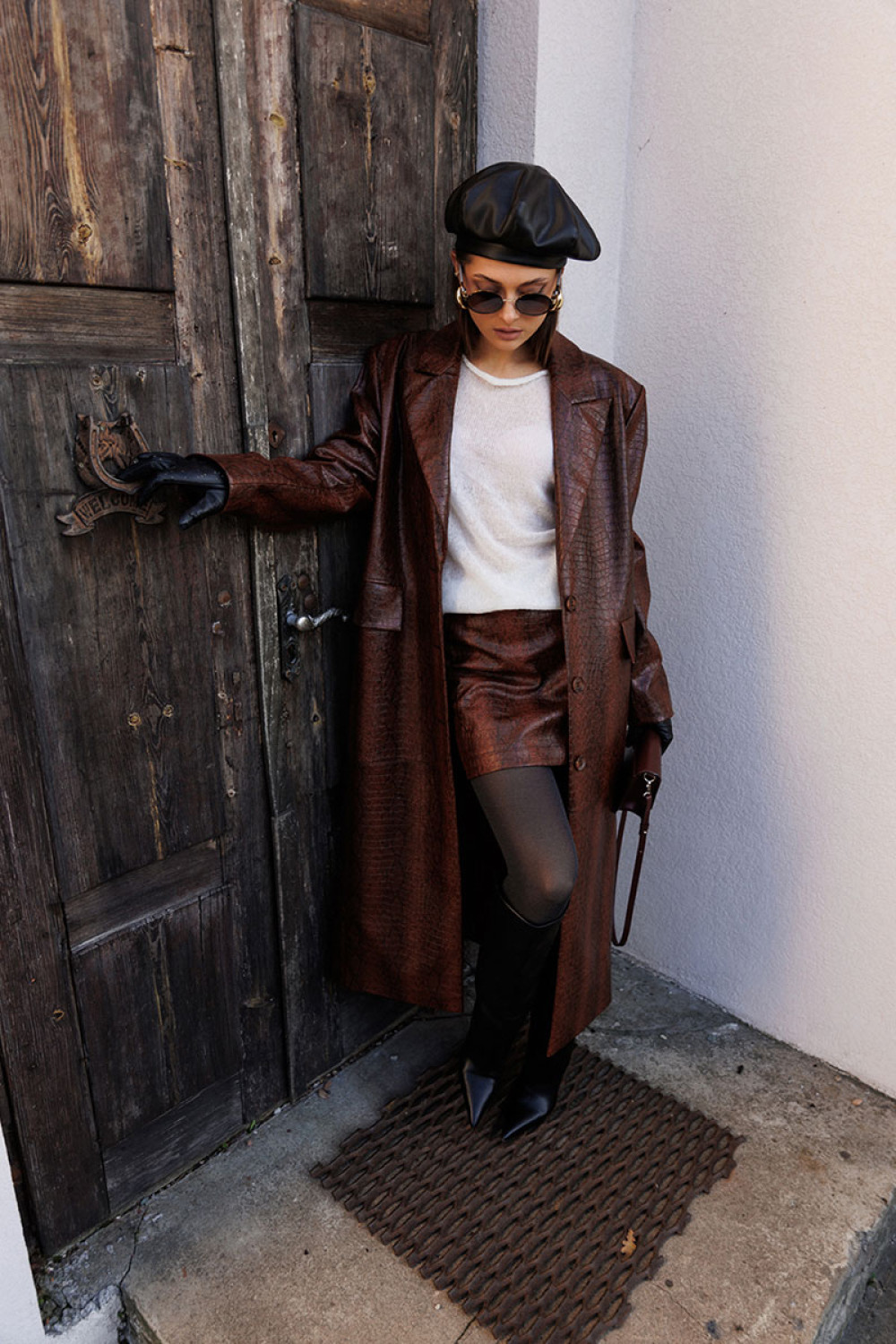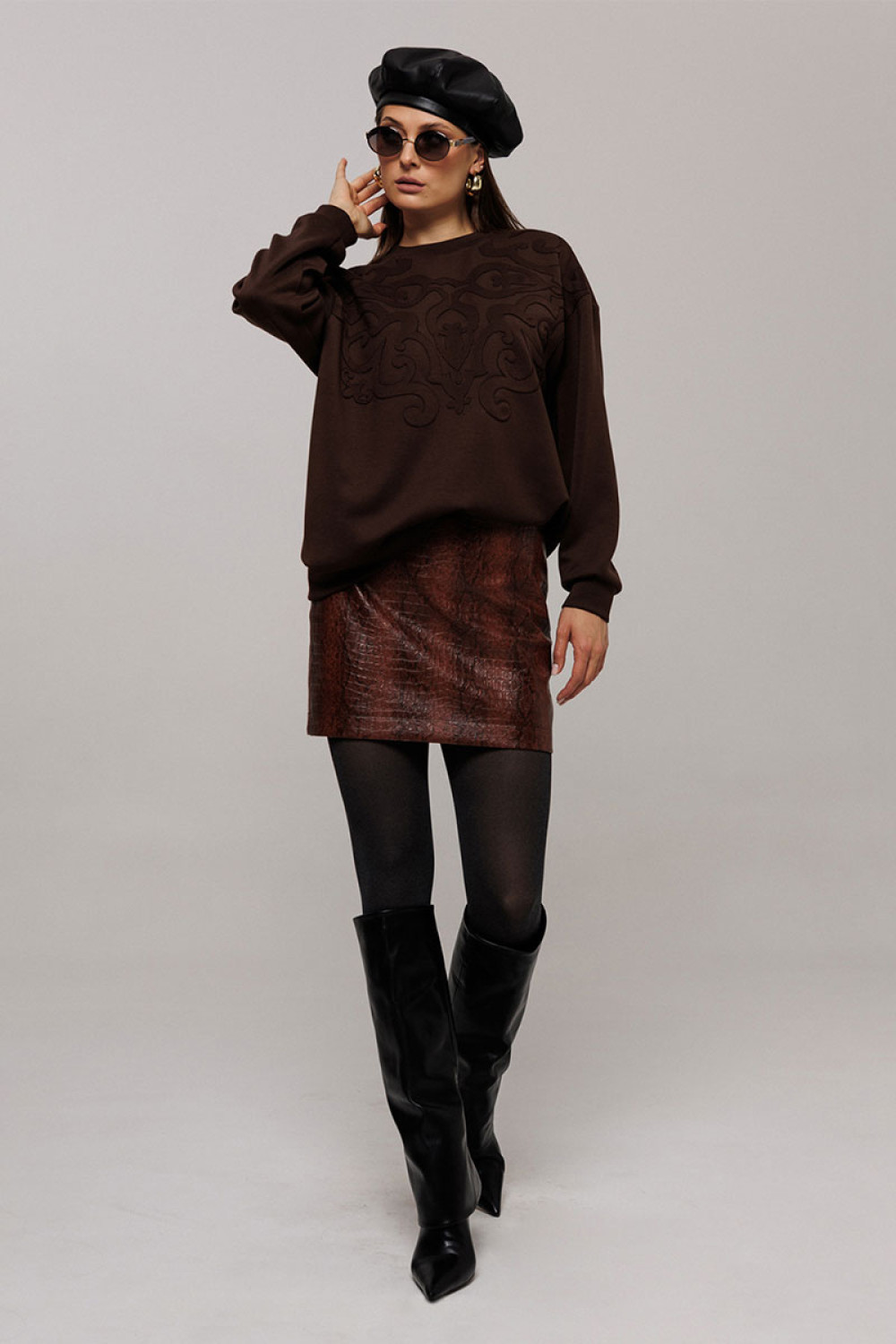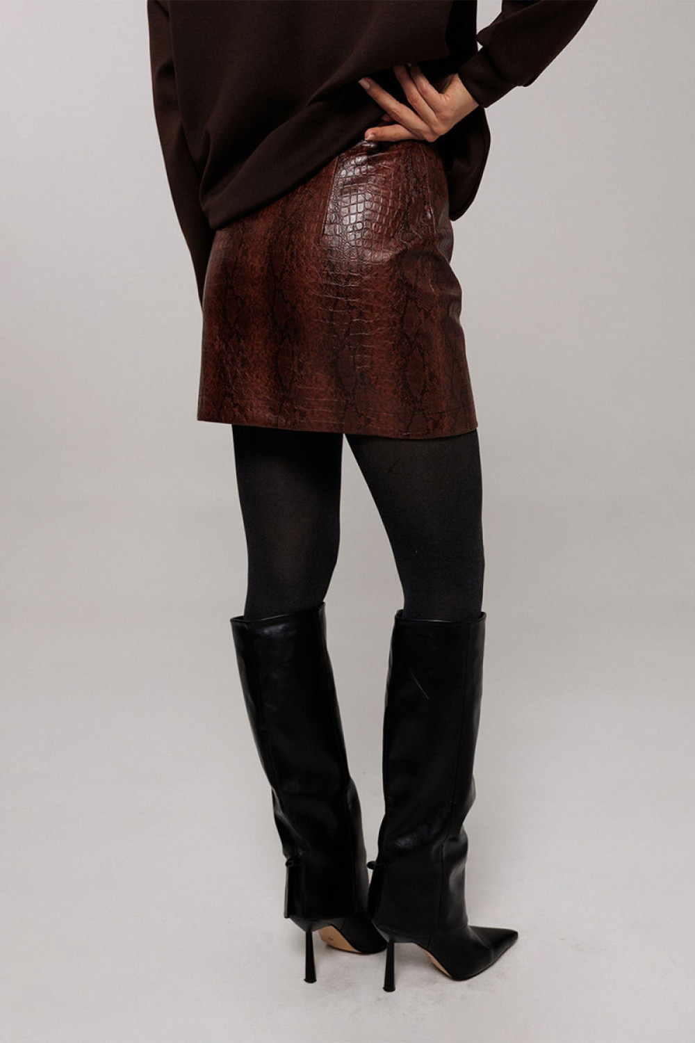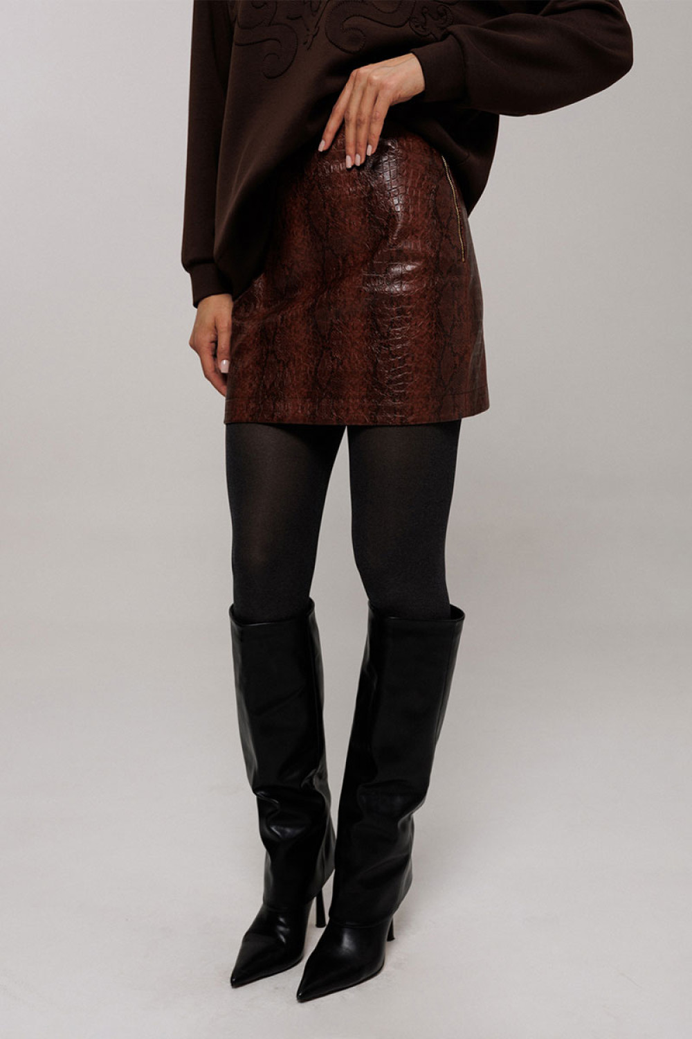 Юбка А-образного силуэта из эко-кожи, вверху на обтачке. С застежкой в боковом шве на металлическую тесьму-молнию. По задней половинке юбки вытачка. Юбка без подкладки.