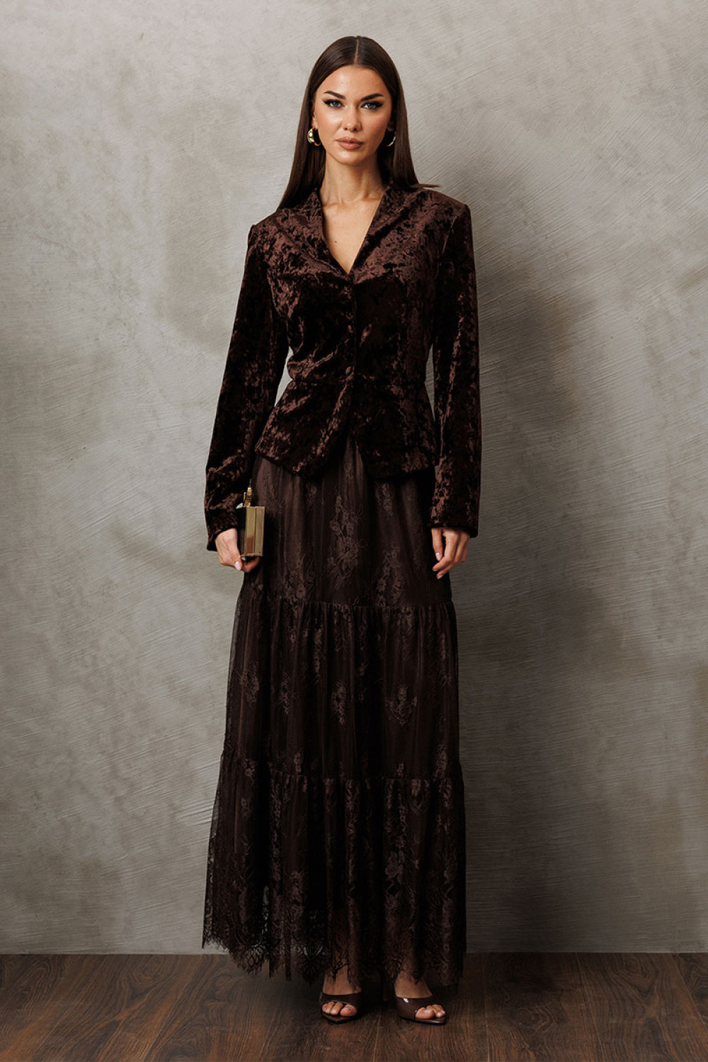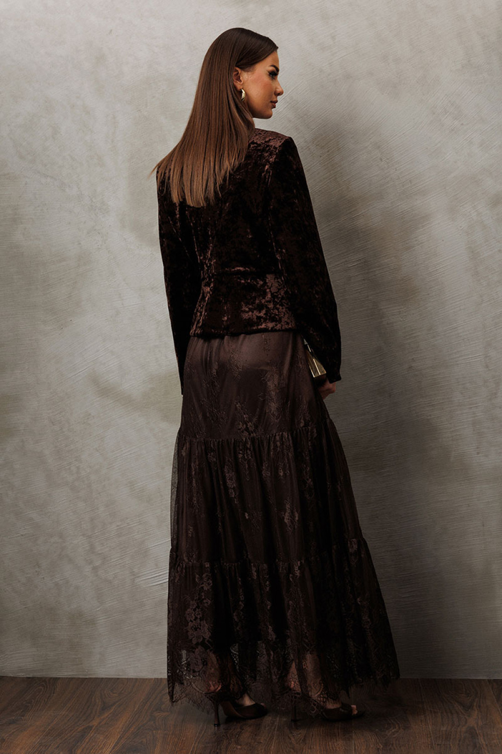Юбка из кружева длинная на притачном поясе из кружева со вставленной в него резинкой. Юбка с 2-мя притачными слегка присборенными воланами. Юбка на подкладке.